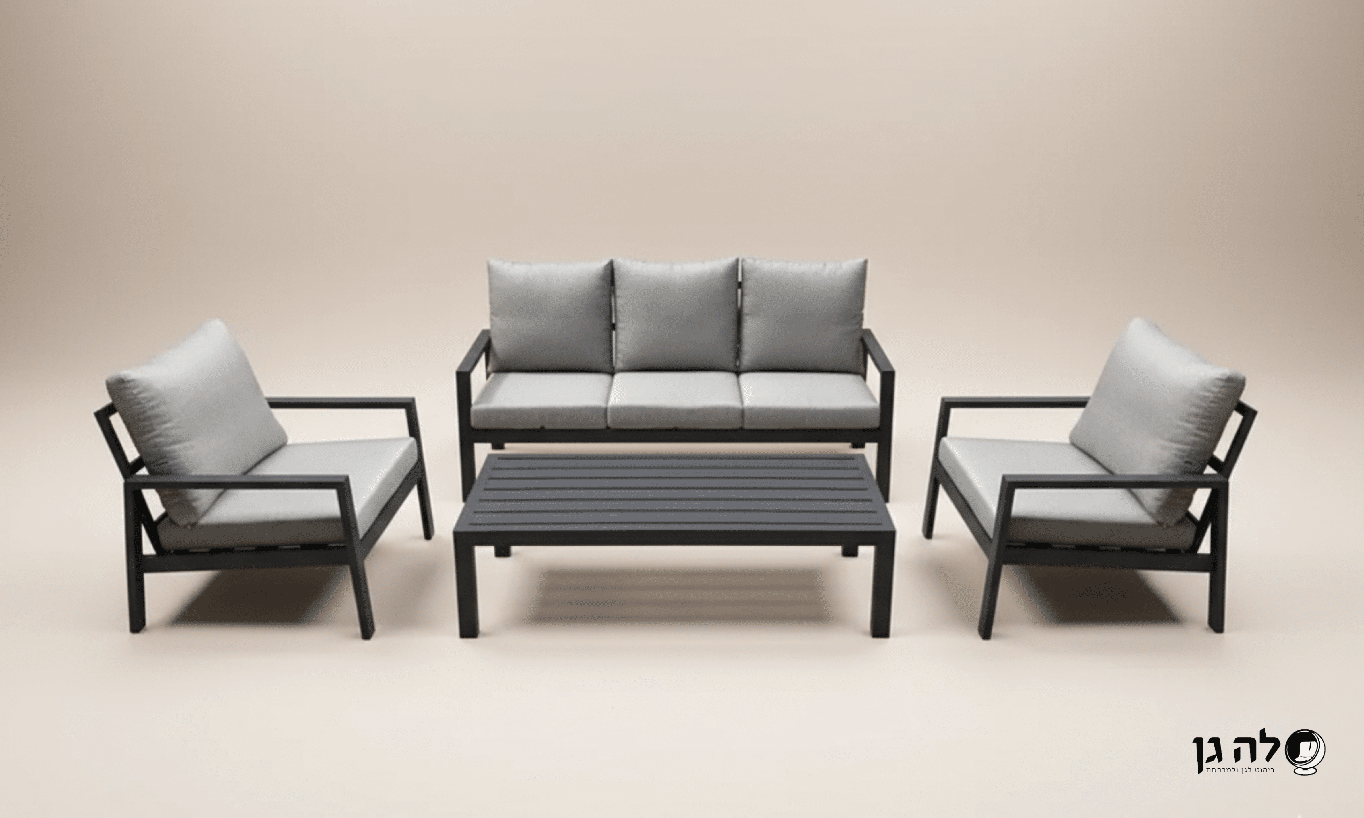 מערכת ישיבה מאלומיניום בעיצוב מודרני, בעלת ארבעה מושבים, ושולחן קפה