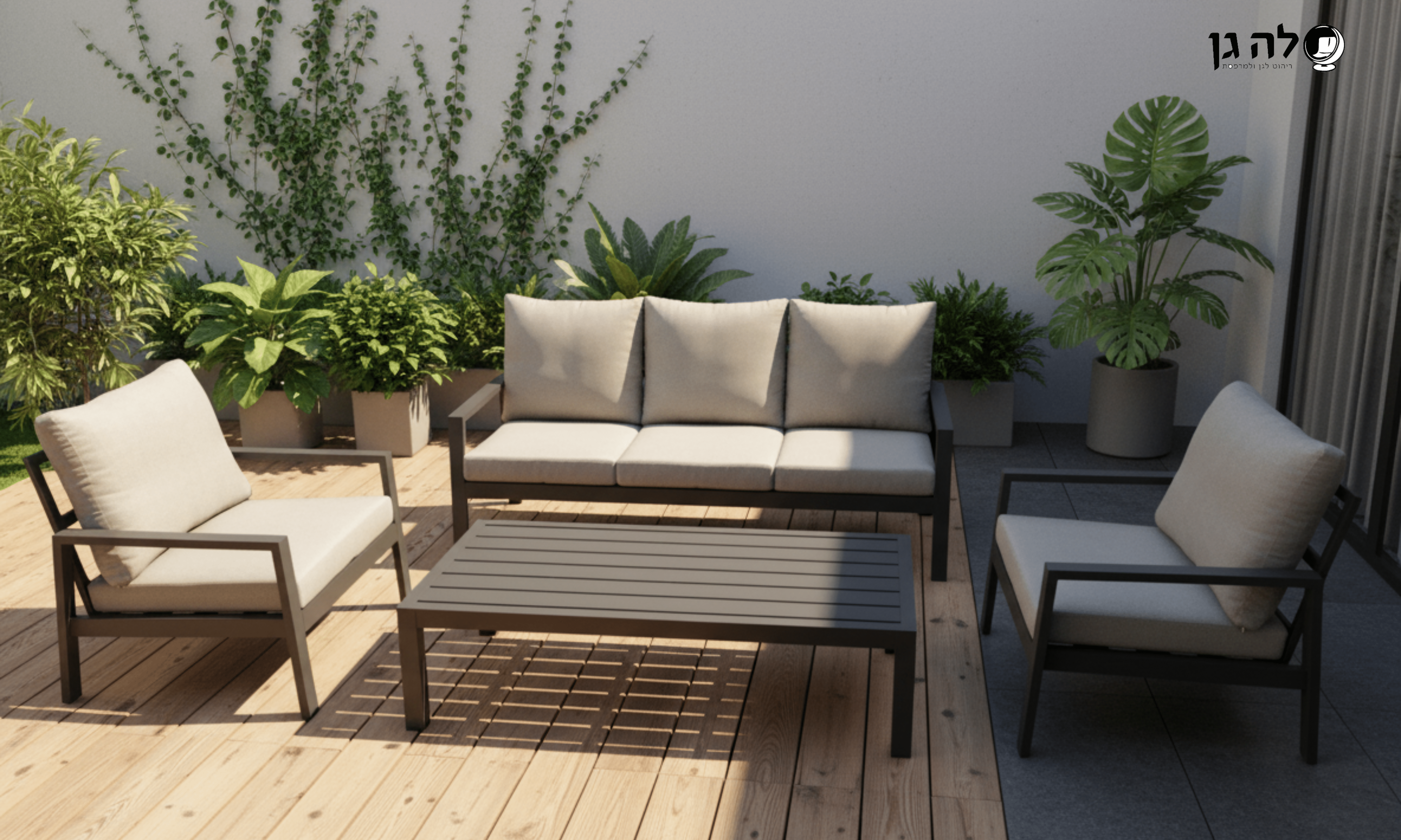 מערכת ישיבה פינתית מאלומיניום ודמוי עץ, כוללת 2 ספות דו-מושביות, חלק פינתי ושולחן קפה מעוצב
