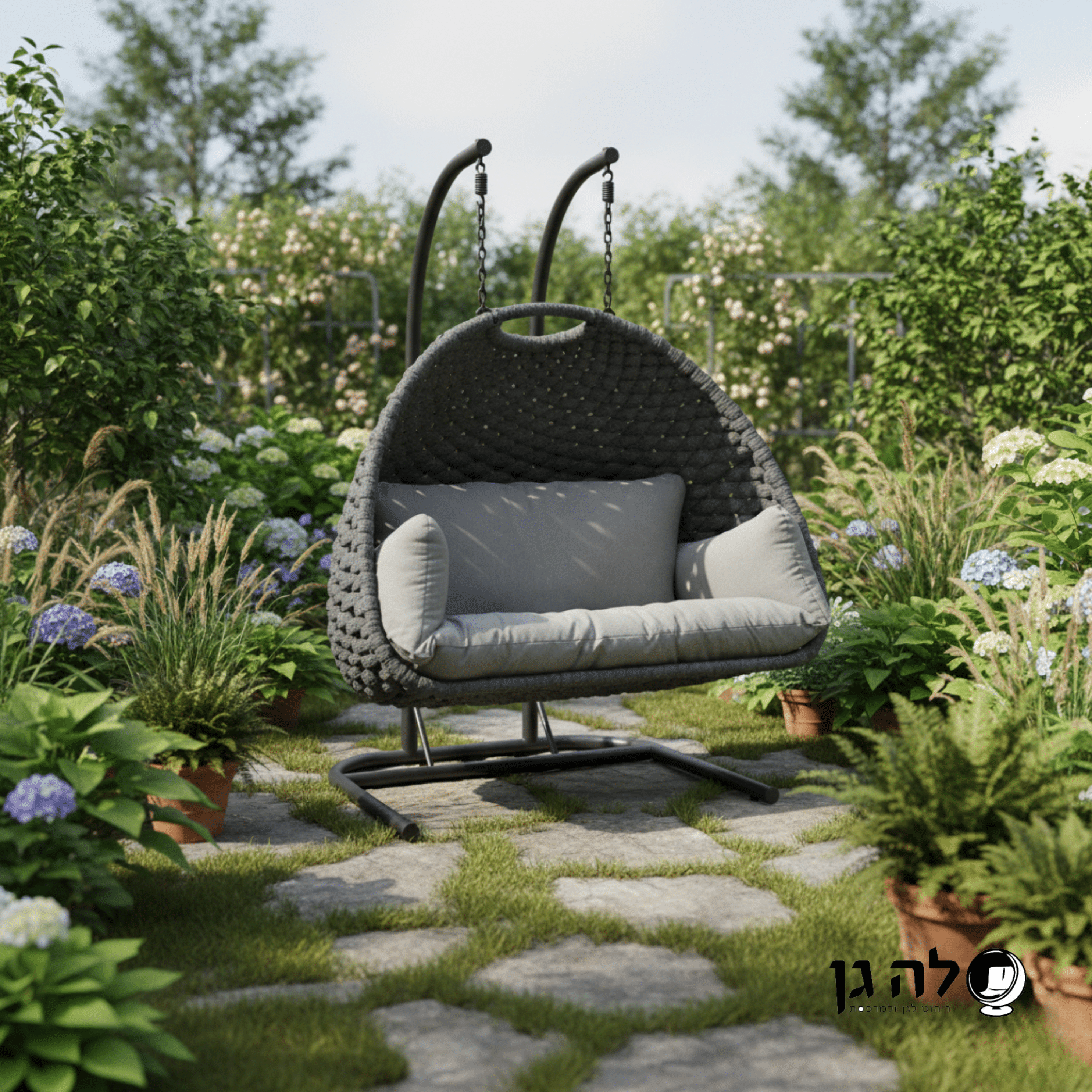 נדנדה תלת-מושבית לגינה הכוללת מושבים מרופדים וקירוי בד להצללה מושלמת