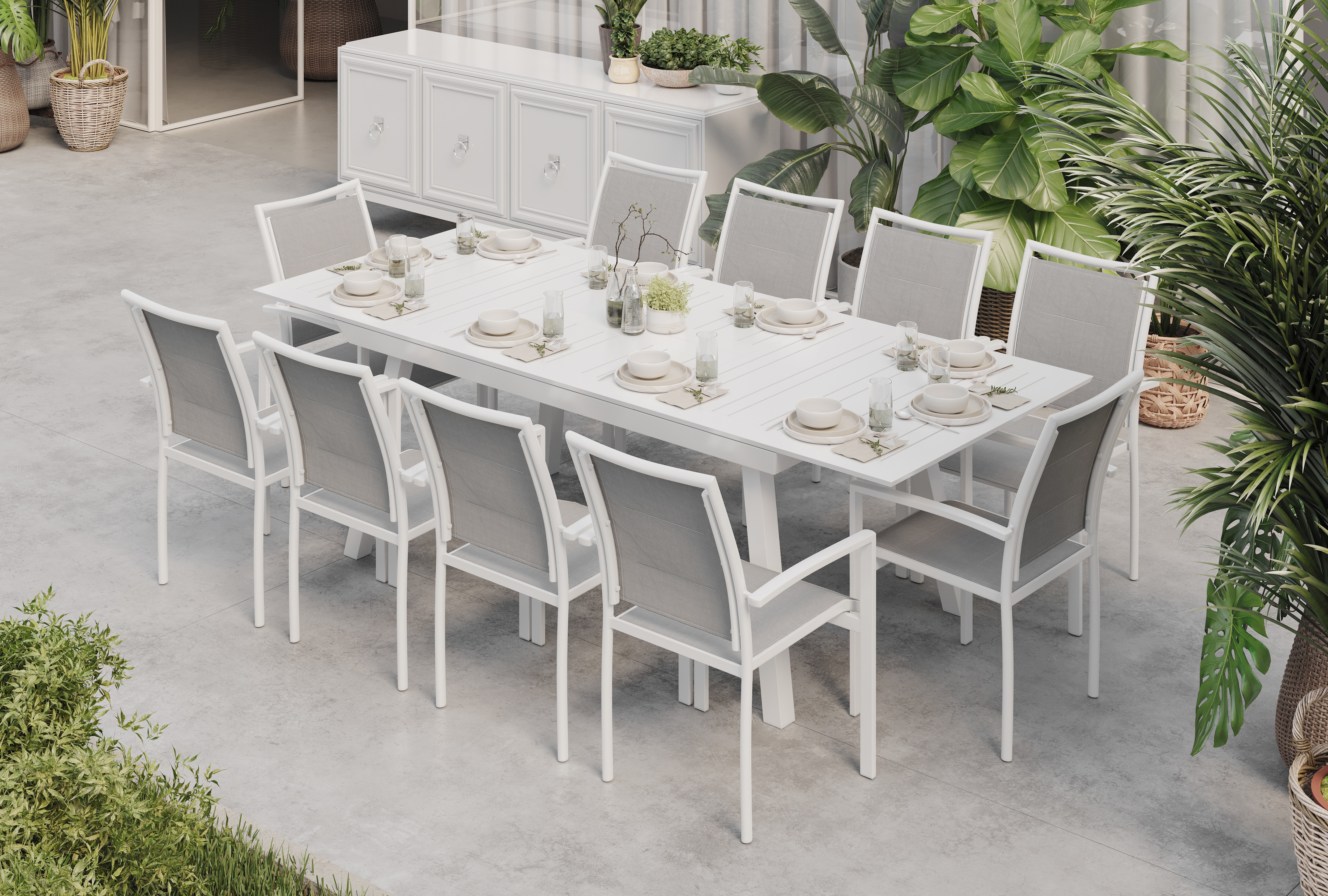 שולחן אוכל נפתח מאלומיניום, עמיד לתנאי החוץ השונים. כולל 6 כסאות פלסטיק איכותיים הניתנים לבחירה