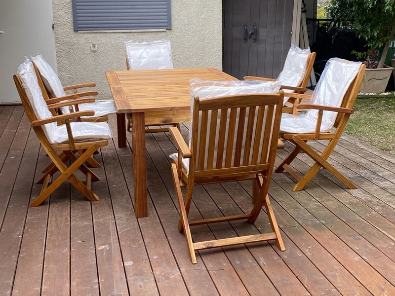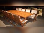 פינת אוכל לגינה מעוצבת בסגנון כפרי ועשויה מעץ אקליפטוס אדום (עץ מלא מסיבי)