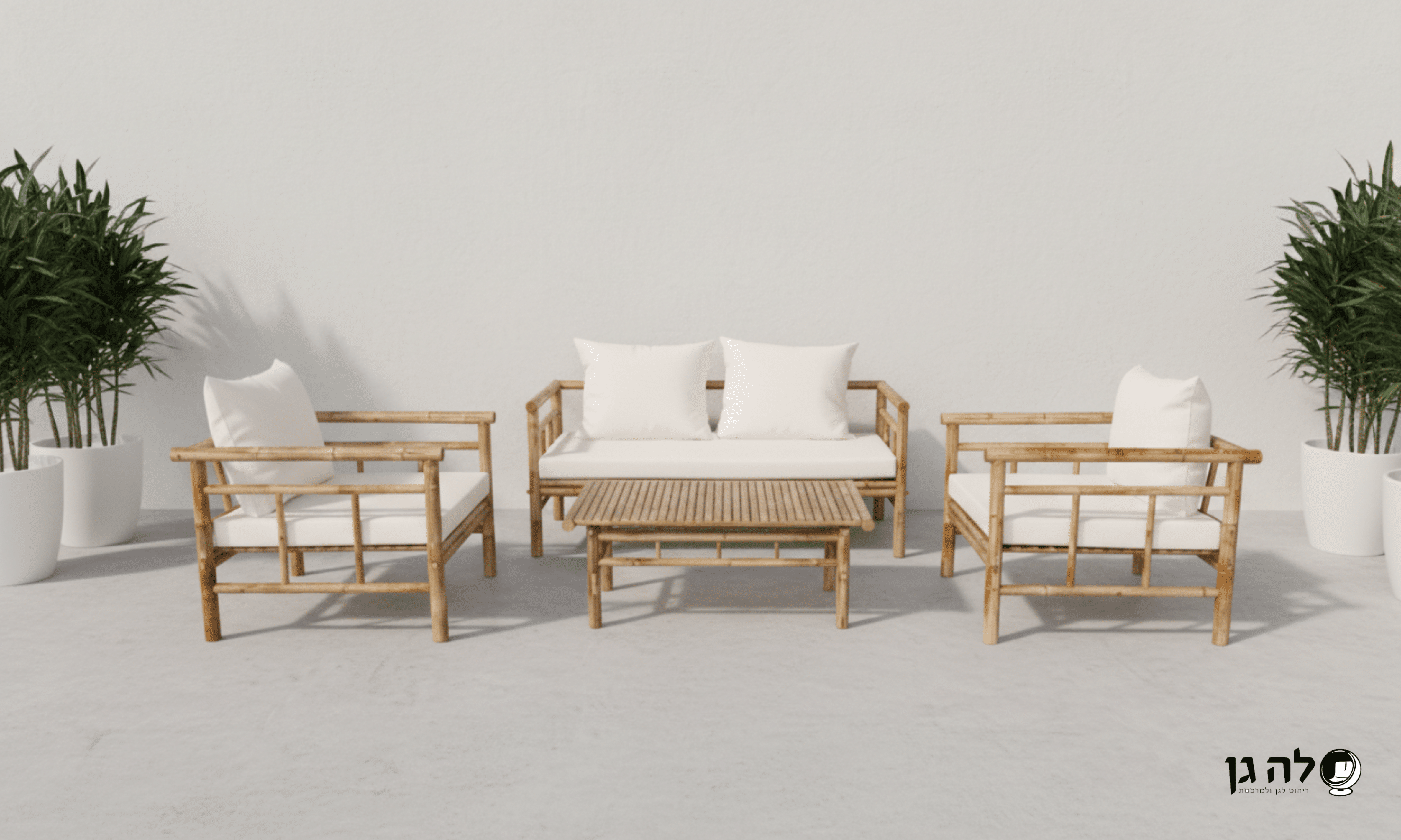 המערכת מורכבת מספה פינתית, ספה דו מושבית, שולחן קפה מתקפל בשילוב ראטן וזכוכית, כריות גב ומושב מפנקות.