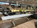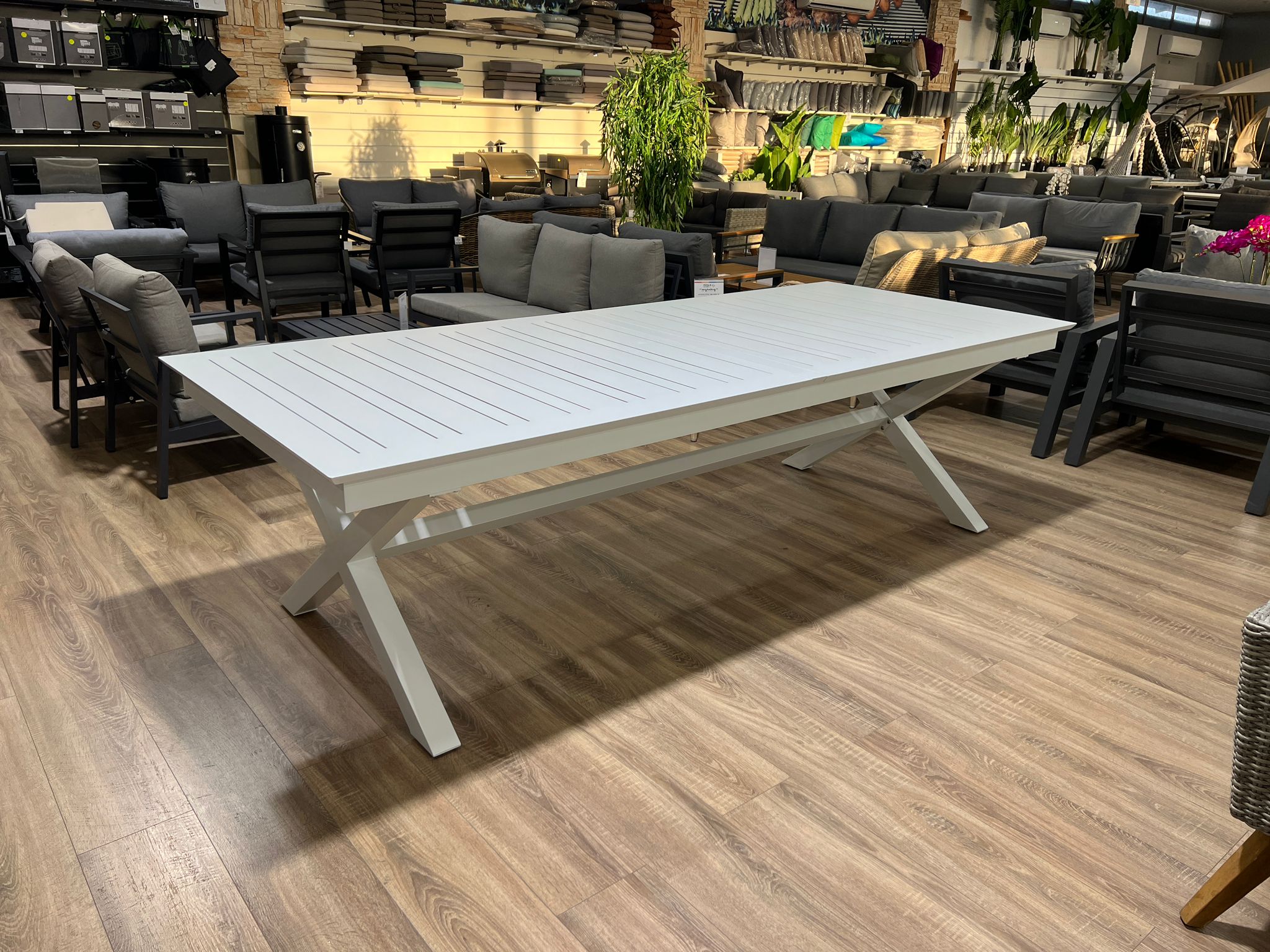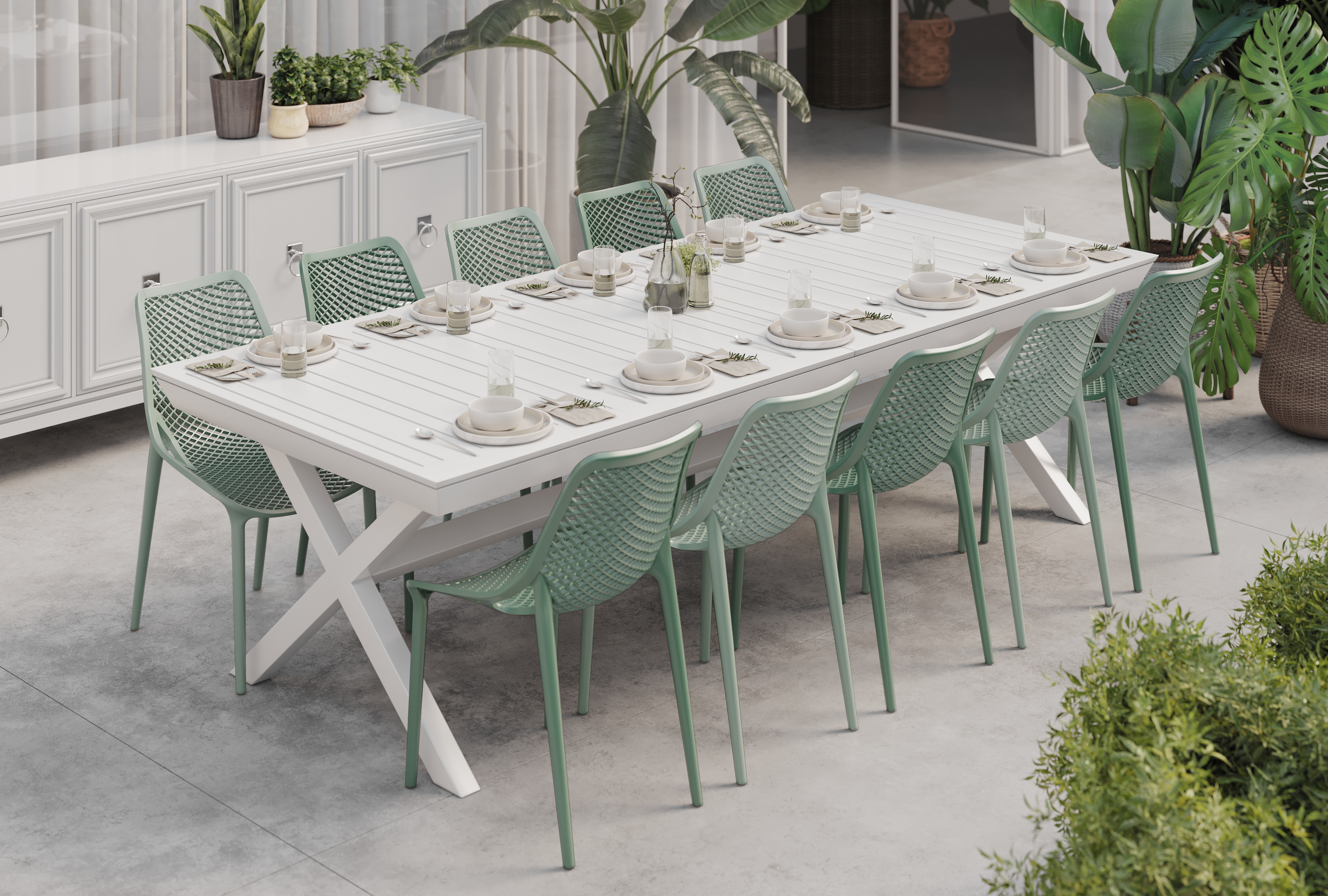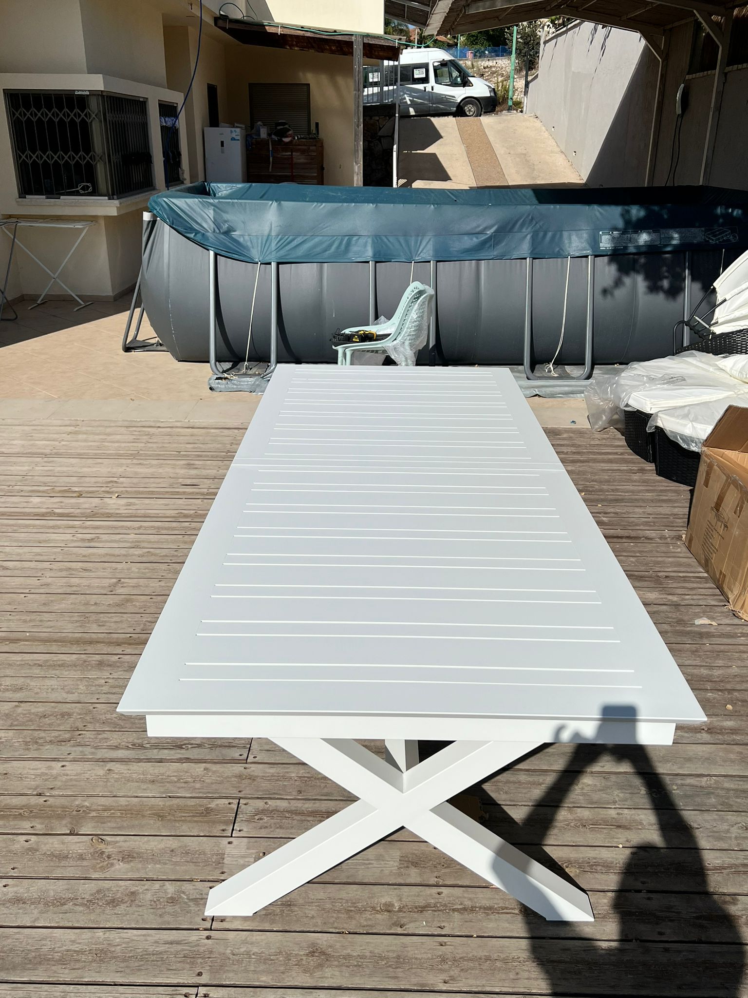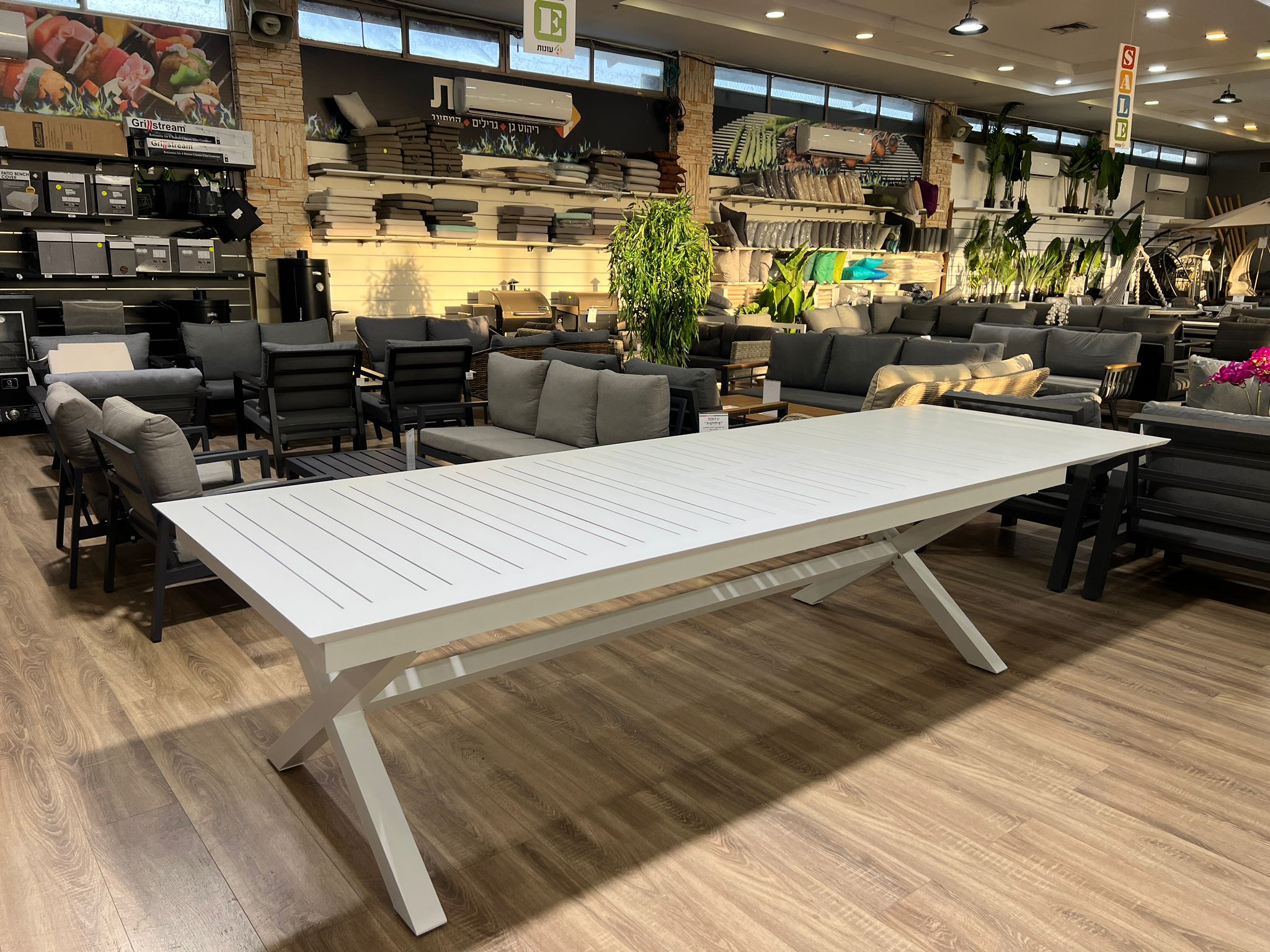 שולחן אוכל עם רגל X נפתח לאורך 4 מטרים, עם שתי אפשרויות פתיחה: האחד עד ל-3.3 מטרים והשני עד ל-4 מטרים. ומהווה פתרון מושלם לכל מטרה. הוא מתאים לשימוש בחלל פנים הבית, בגינות. וכן מתאים לשימוש פרטי או מסחרי. השולחן מגיע עם מנגנון פתיחה פשוט וקל לתפעול. השולחן יכול להתאים ל-16 איש מסביב לשולחן במצב פתוח, ול-10 איש במצב סגור.