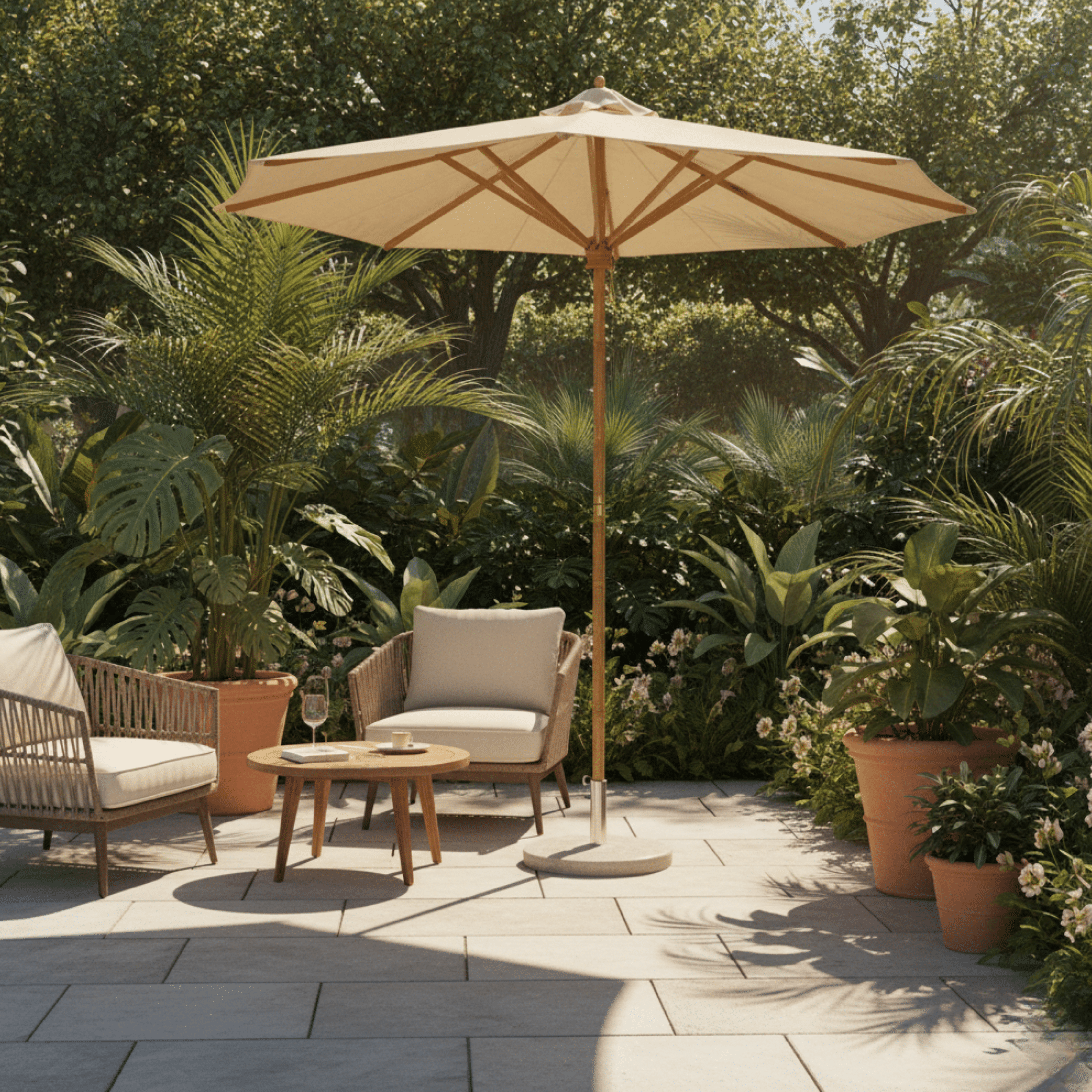 שמשיית במבוק 2.2 מטר עם בד לבן, עיצוב תאילנדי, פתרון הצללה טבעי ואלגנטי.