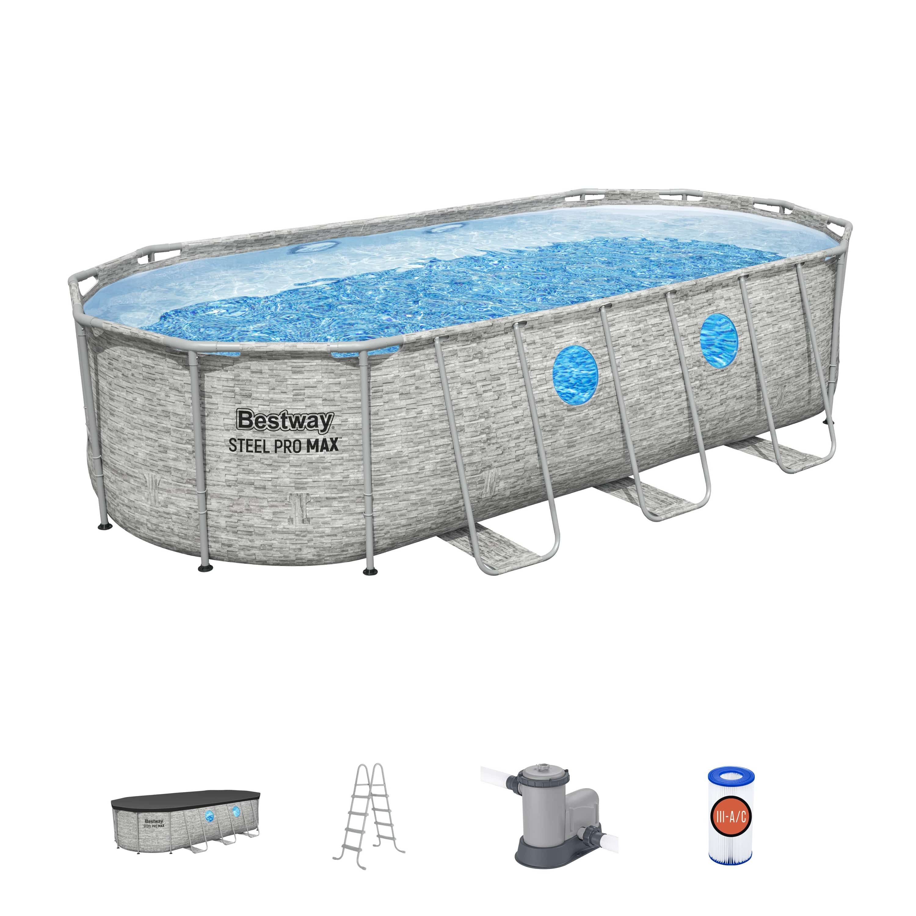 בריכה מלבנית עם שלדת פלדה, משאבת פילטר וניקוז מובנה.