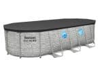 בריכה עגולה עם שלדת פלדה, משאבה, סולם וכיסוי.