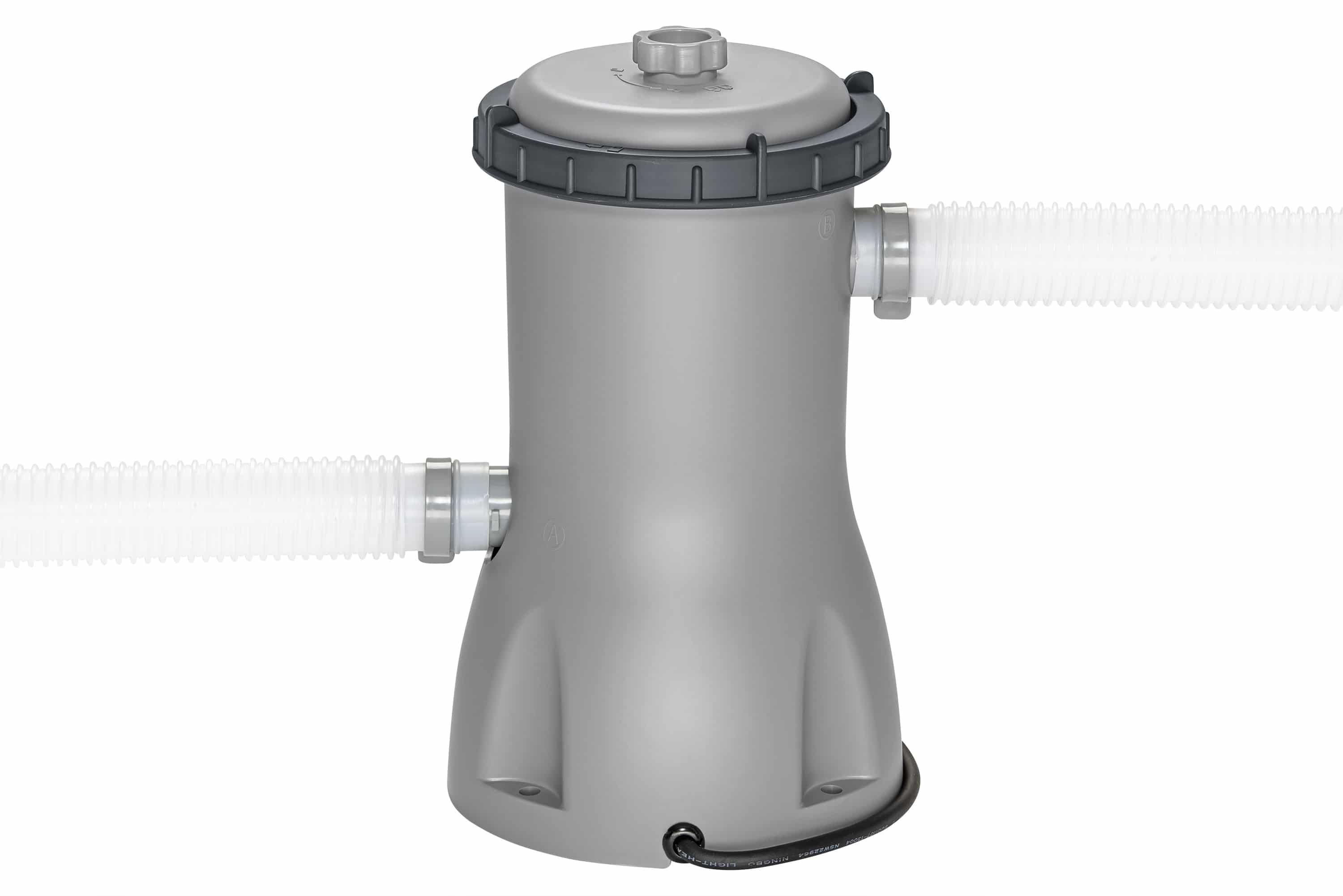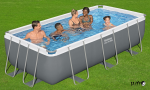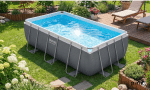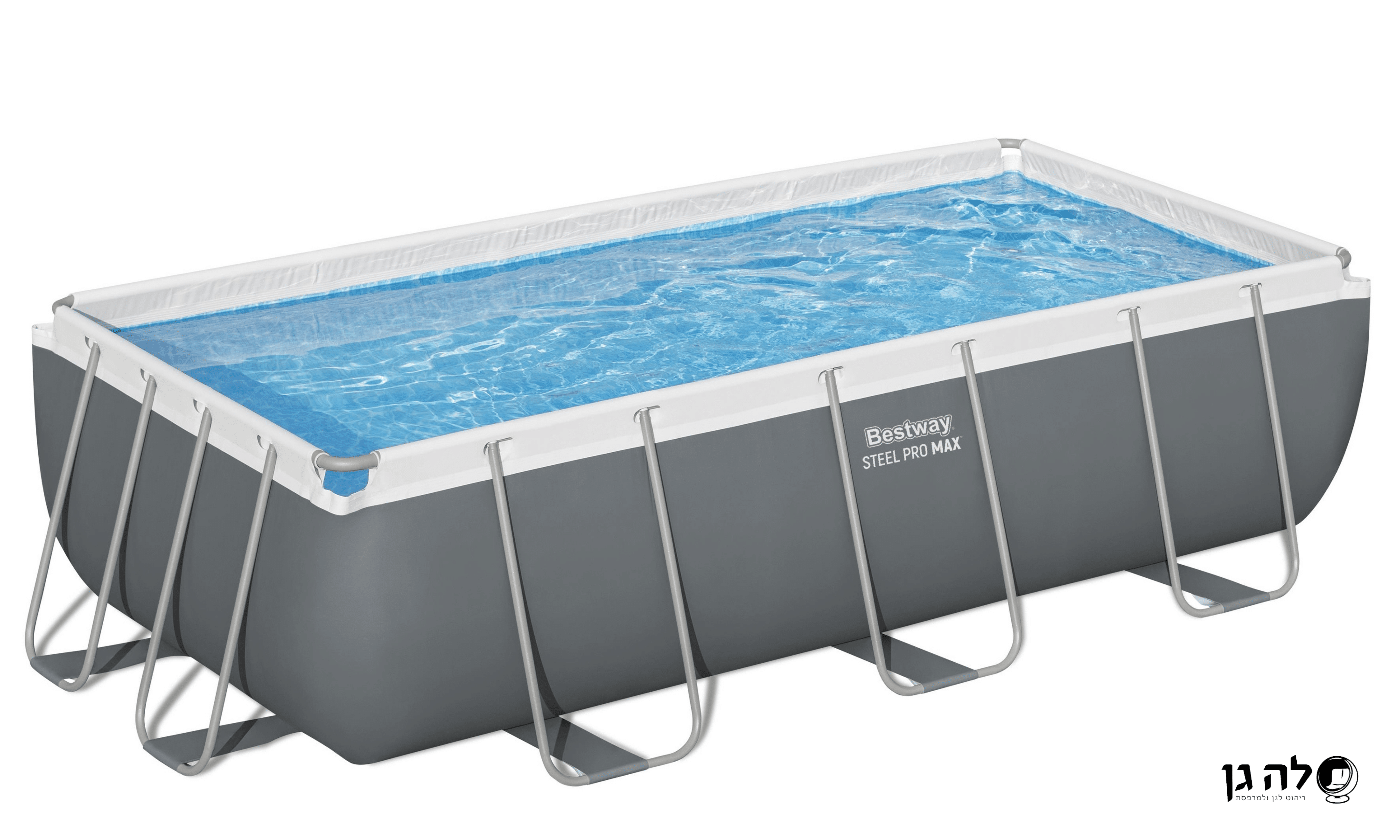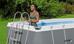 בריכה עילית מלבנית עם שלדת פלדה, סולם ומשאבה.