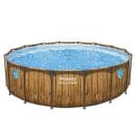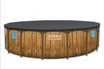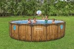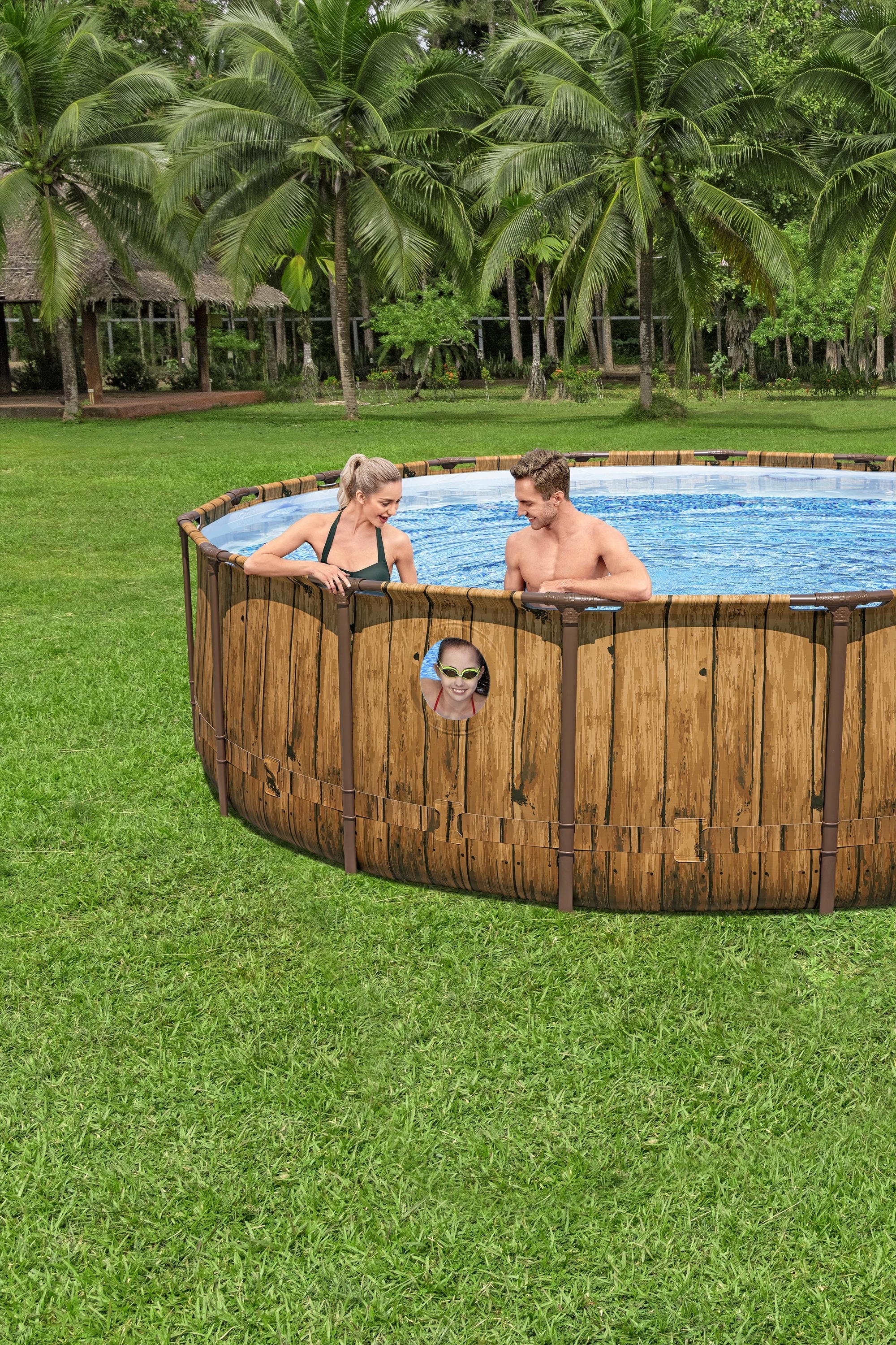 קיבולת המים (90%) עומדת על 19,480 ליטר, ומתאימה לשימוש משפחתי בעונת הקיץ. דפנות הבריכה עשויות חומר Tritech תלת־שכבתי עמיד לניקוב ולקרינת UV, עם רצועת חיזוק היקפית (3-ply band) לתמיכה נוספת. שלדת הפלדה מצופה בגימור עמיד בפני קורוזיה, ומחברי ClickConnect מאפשרים חיבור מהיר. הבריכה כוללת 4 חלונות Splashview אטומים למים, המאפשרים צפייה פנימה והחוצה ומוסיפים אלמנט אינטראקטיבי בזמן הרחצה. החלק החיצוני מעוצב בהדפס דמוי עץ, והתחתית בהדפס Prismatic Stone. הערכה כוללת סולם בגובה 1.22 מ׳, כיסוי תואם בקוטר 4.93 מ׳, ומשאבת פילטר עם קצב זרימה של 5,678 ליטר לשעה, וספיקת מערכת כוללת של 3,974 ליטר לשעה. שסתום ניקוז מובנה מאפשר ריקון באמצעות חיבור לצינור גינה (כולל מתאם).