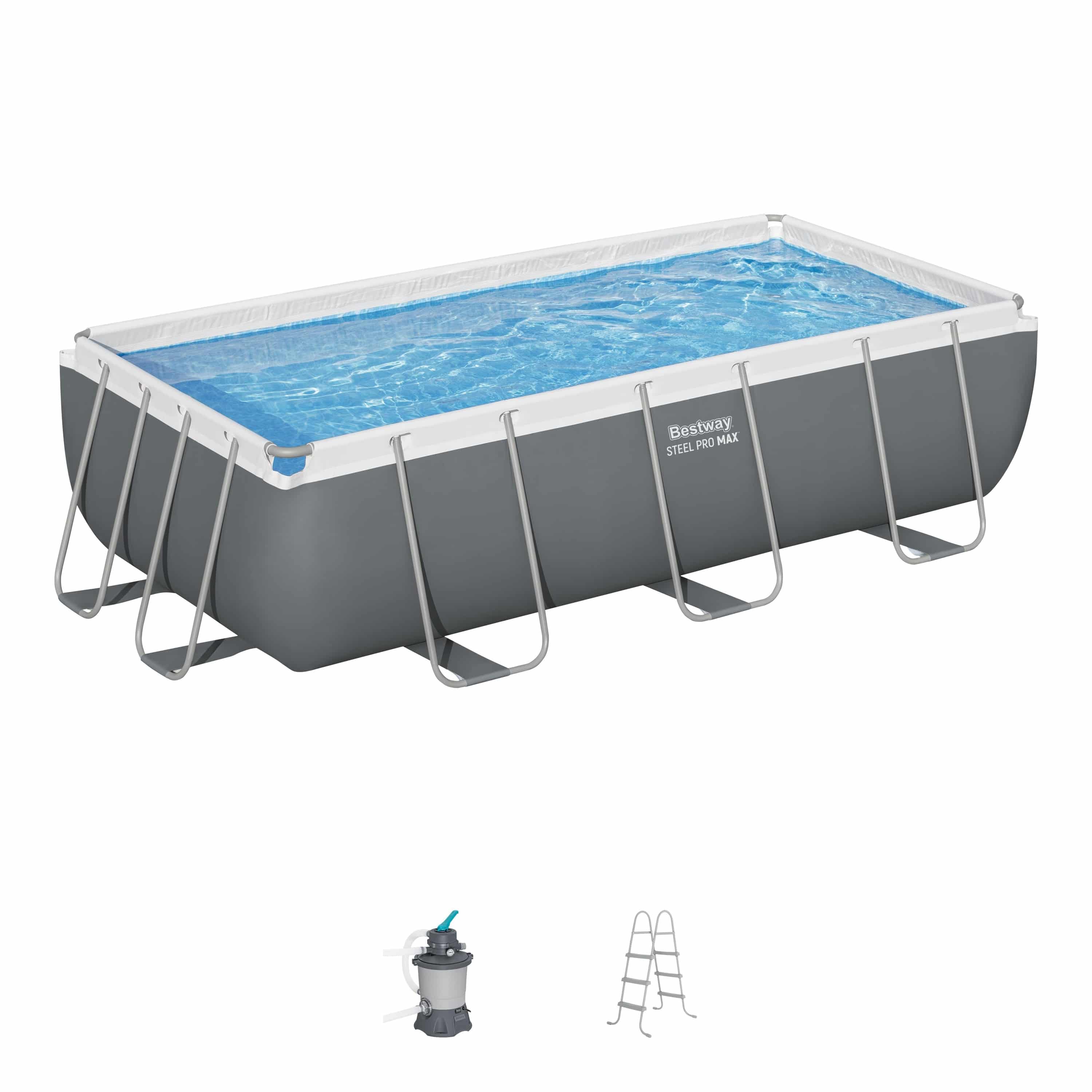 בריכה מלבנית עם שלדת פלדה, משאבת חול וסולם.