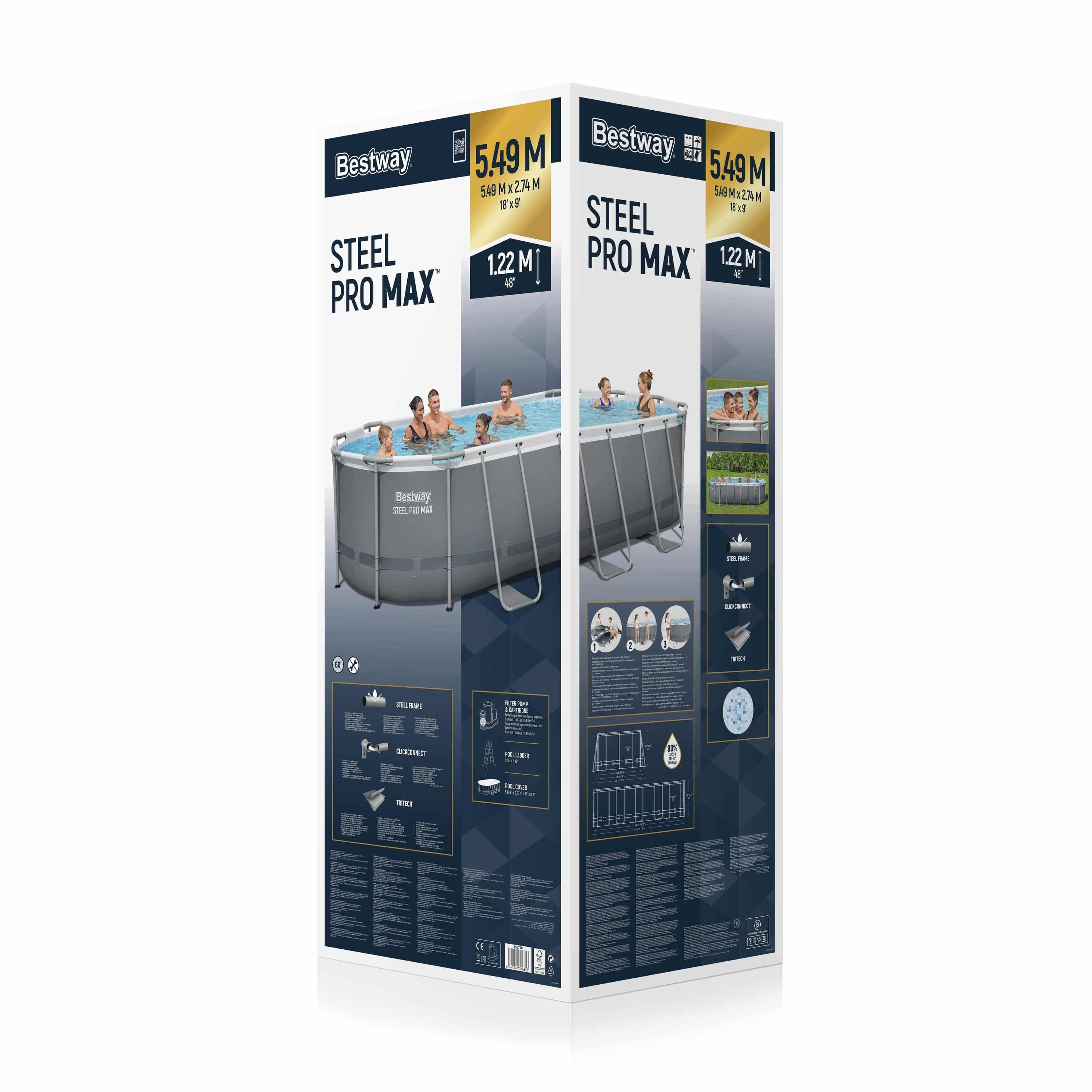 קיבולת המים (90%) עומדת על 13,430 ליטר, ומתאימה לשימוש משפחתי בעונת הקיץ. הדפנות עשויות חומר Tritech תלת־שכבתי עמיד לניקוב ולקרינת UV, עם רצועת חיזוק היקפית (3-ply band) לתמיכה נוספת. שלדת הפלדה מצופה בגימור עמיד בפני קורוזיה, ומחברי ClickConnect מאפשרים חיבור מהיר ומפחיתים מגע מתכת-במתכת. הבריכה כוללת סולם בגובה 1.22 מ׳ וכיסוי תואם במידות 5.48 × 2.57 מ׳. משאבת הפילטר מספקת קצב זרימה של 5,678 ליטר לשעה, וספיקת מערכת כוללת של 3,974 ליטר לשעה. שסתום ניקוז מובנה מאפשר ריקון באמצעות חיבור לצינור גינה (כולל מתאם), וכולל מחברי בקרה לזרימה.