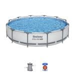 בריכה עגולה עם שלדת פלדה ומשאבת פילטר.