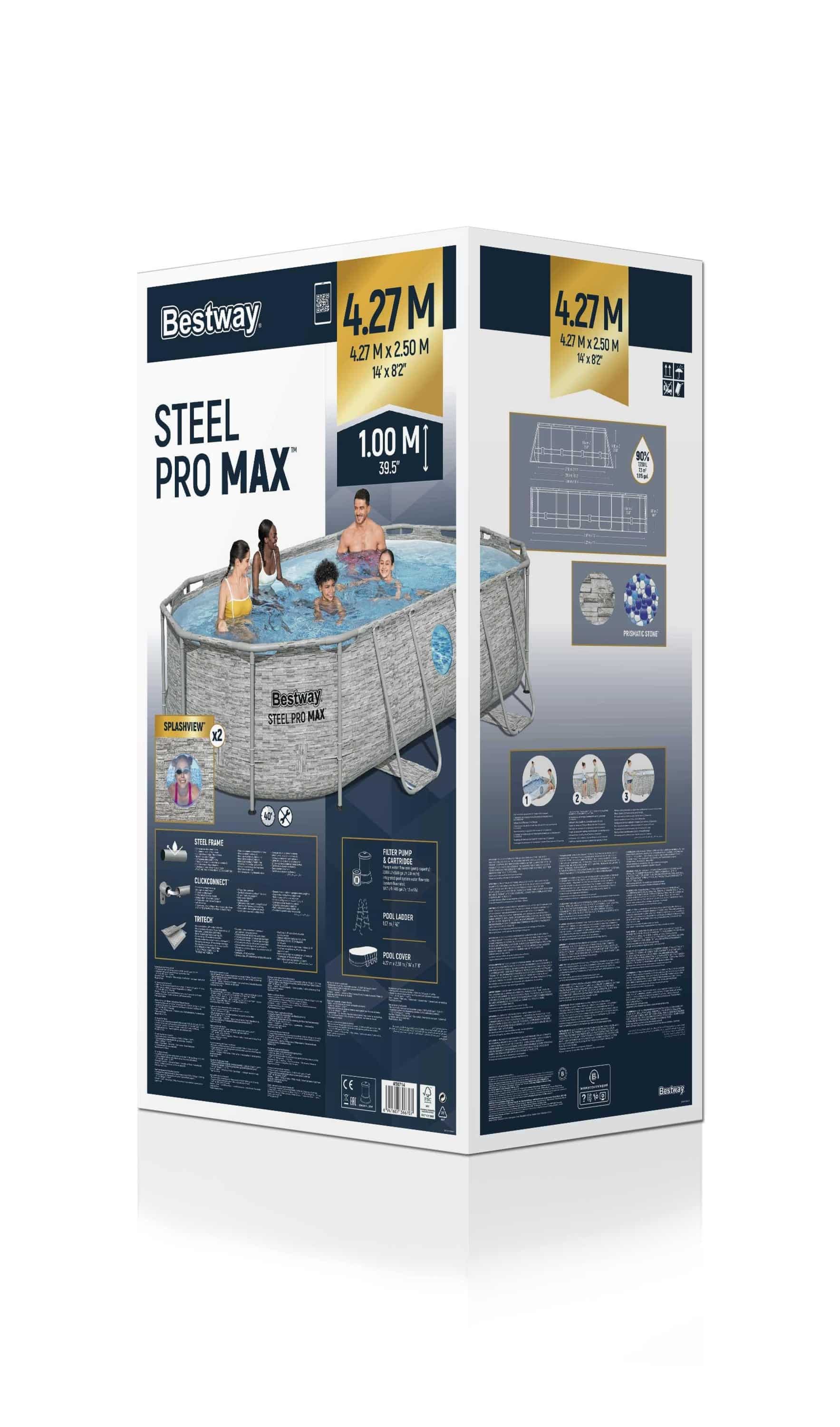 דפנות הבריכה עשויות חומר Tritech עמיד במיוחד לניקוב ולקרינת UV, ומספקות יציבות גבוהה גם בשימוש יומיומי. בנוסף, הבריכה כוללת רצועת חיזוק 3 שכבות שמעניקה תמיכה נוספת לדפנות. שלדת הפלדה עמידה בפני קורוזיה עם גימור מט, ומחברי ClickConnect מאפשרים חיבור מהיר ובטוח תוך מניעת מגע מתכת-במתכת. ייחוד נוסף של הבריכה הוא העיצוב המרשים: ליינר חיצוני בהדפס אבן טבעית וליינר פנימי בעיצוב Prismatic Stone, לצד 2 חלונות Splashview אטומים למים שמוסיפים חוויה מיוחדת ומהנה במיוחד לילדים, עם אפשרות להצצה מתחת למים בצורה בטוחה ואינטראקטיבית. בנוסף, שסתום ניקוז מובנה מאפשר ריקון קל ונוח באמצעות חיבור לצינור גינה (כולל מתאם).