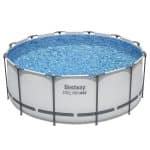 בריכה עגולה עם שלדת פלדה, משאבה, סולם וכיסוי.
