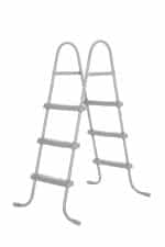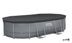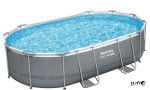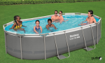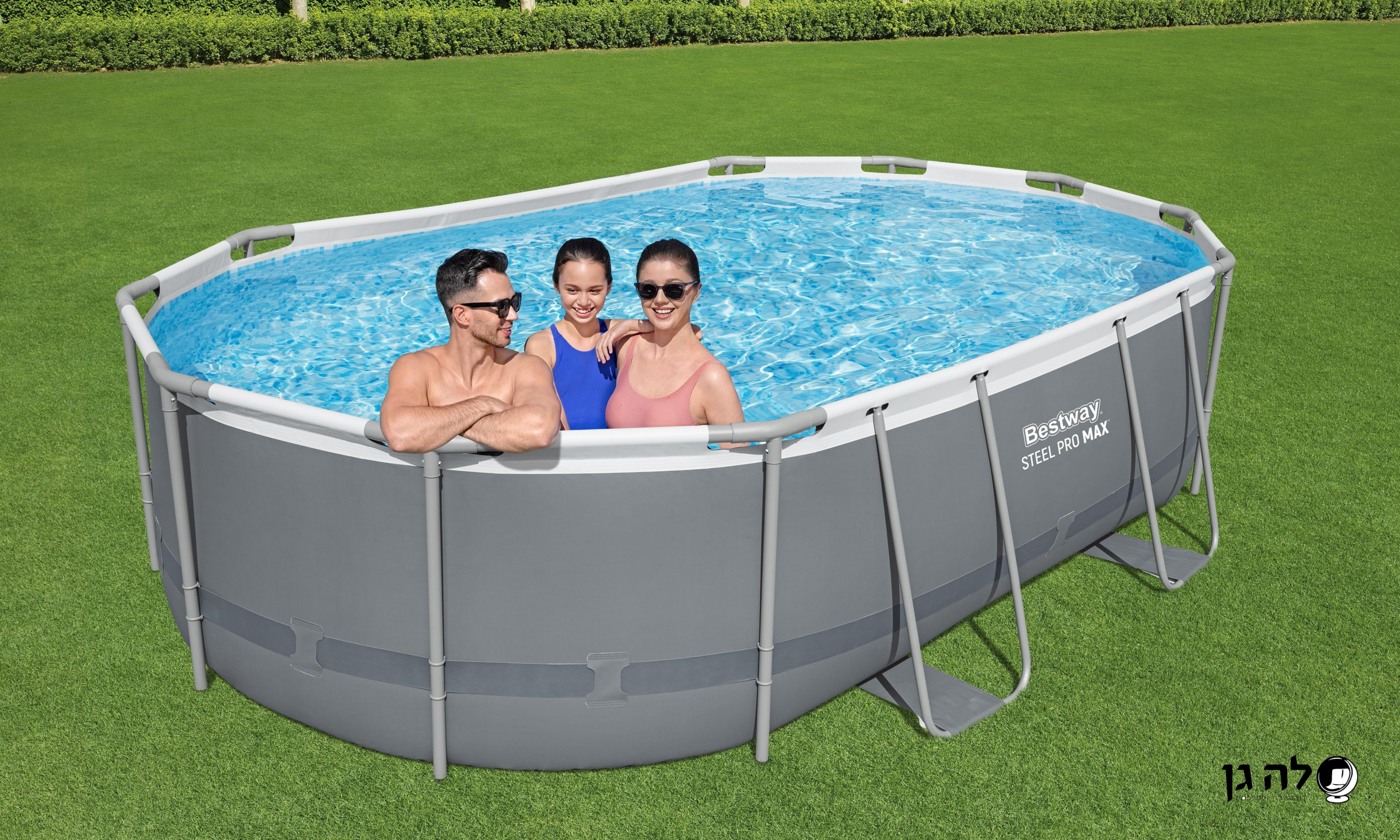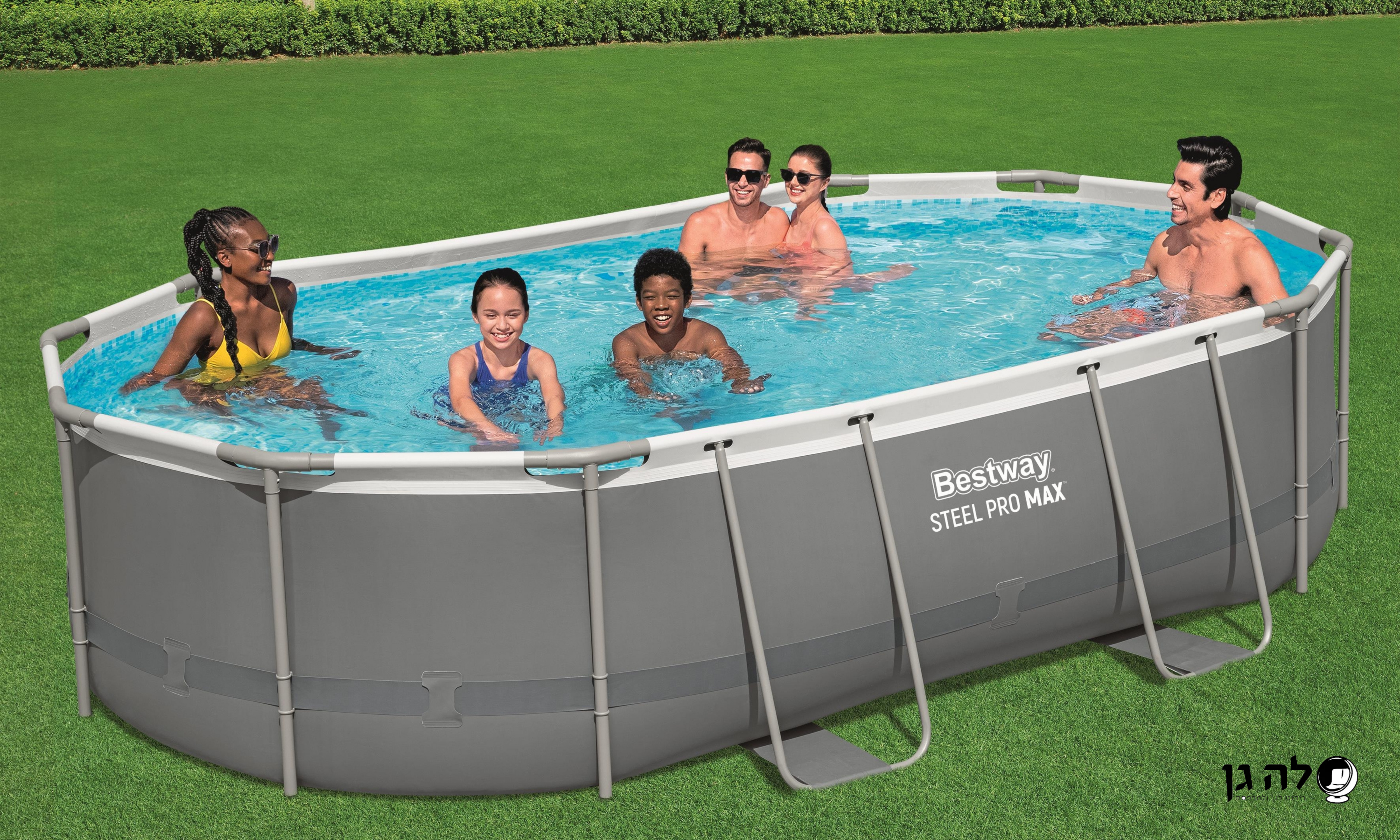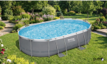 בריכה עילית אובלית עם שלדת פלדה, סולם ומשאבה.