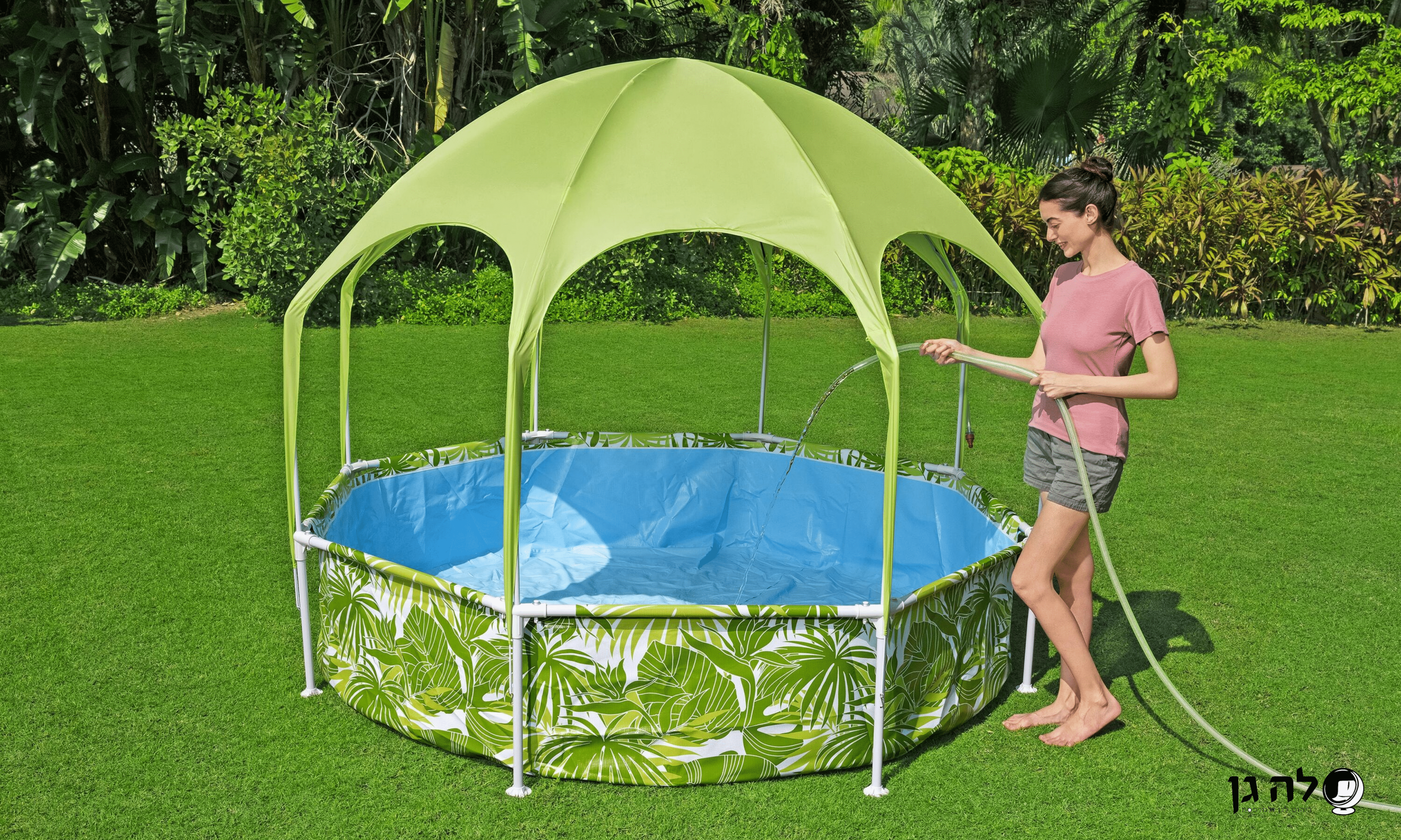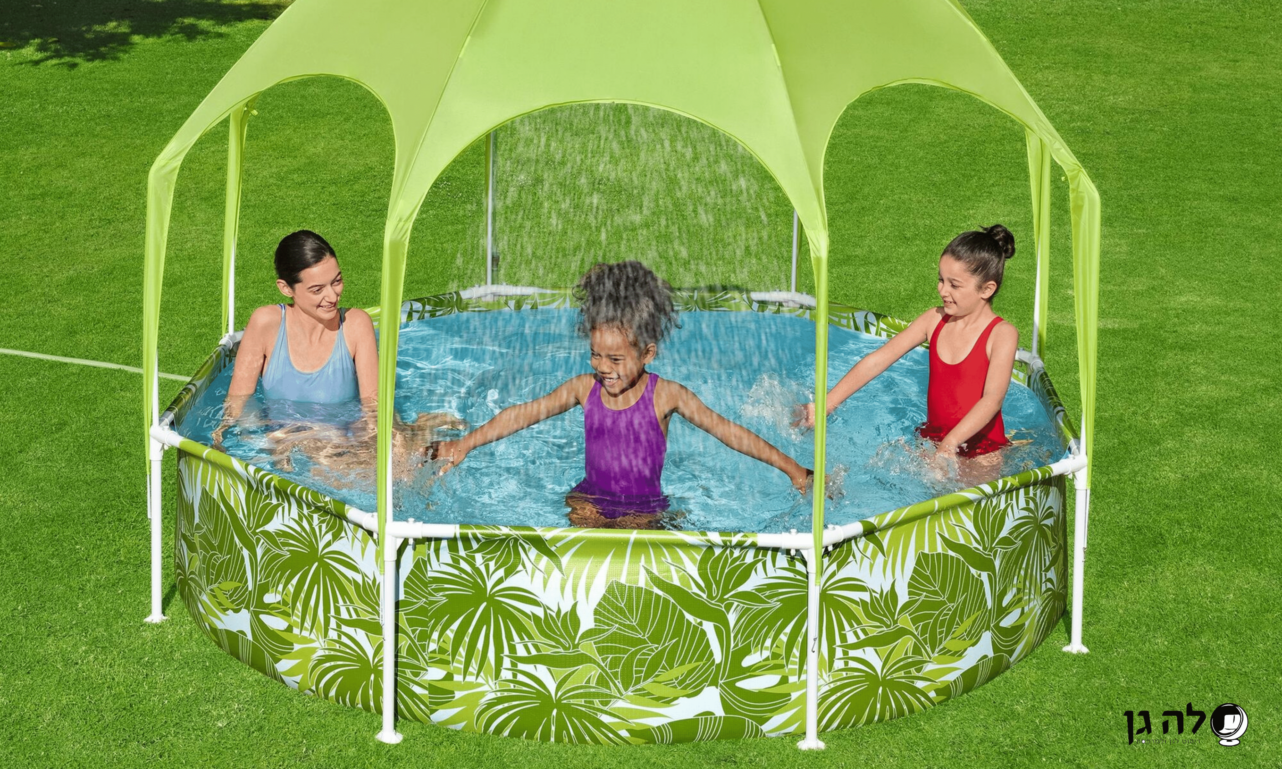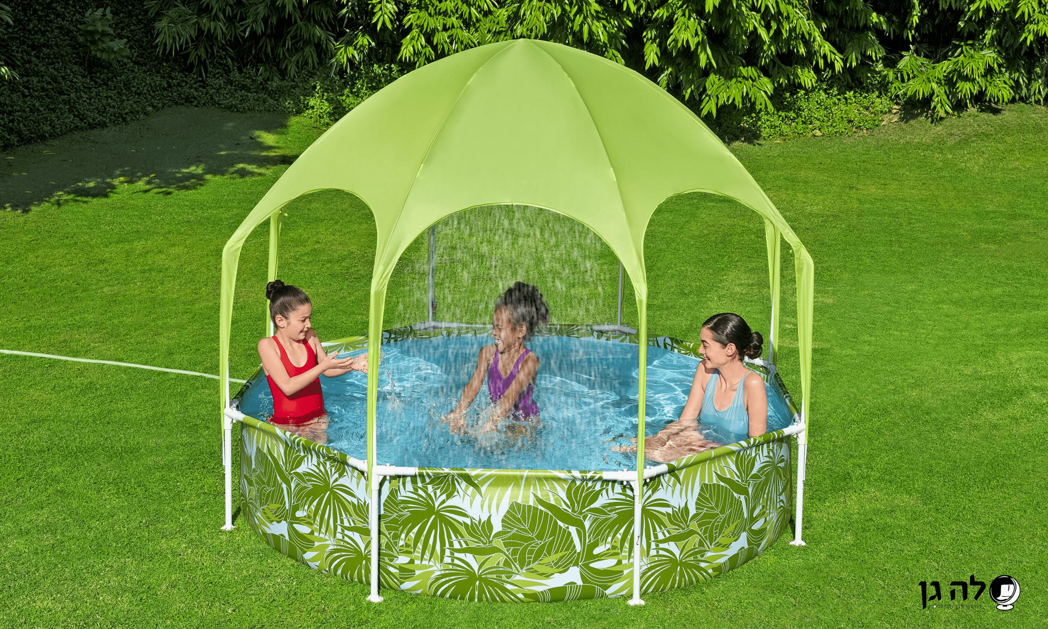 בריכת משחק עגולה עם גגון הצללה, מתז מים ושלדה.