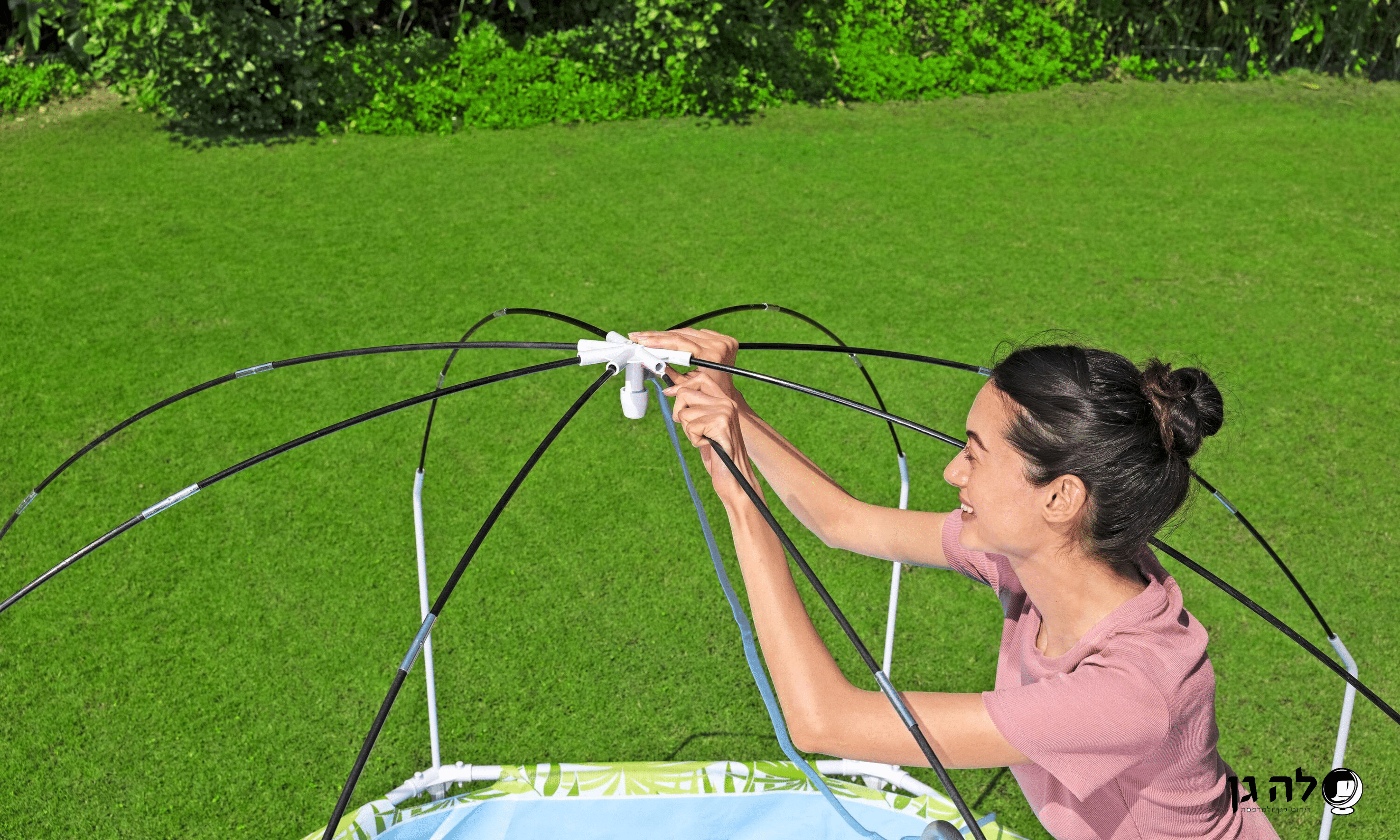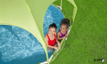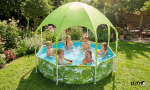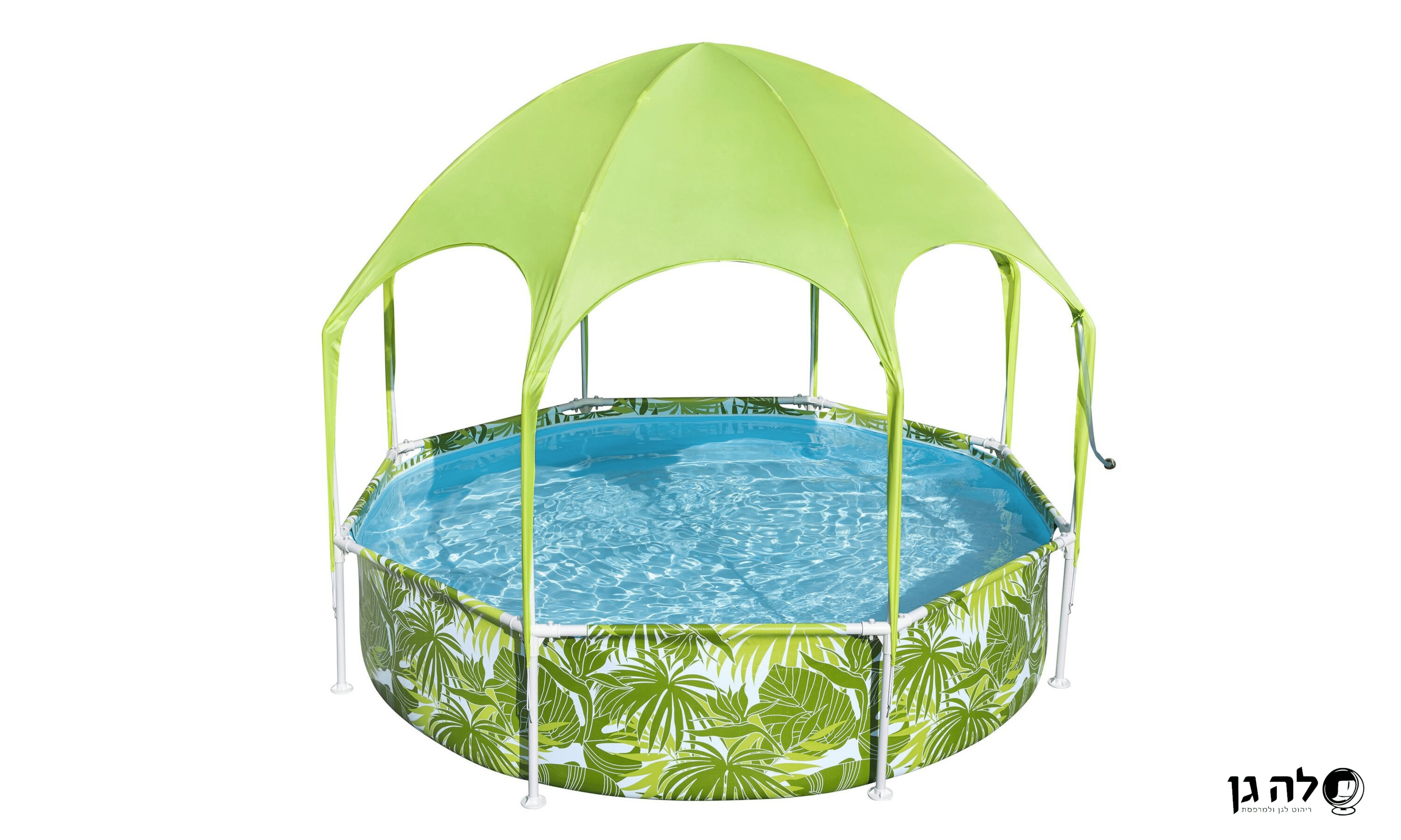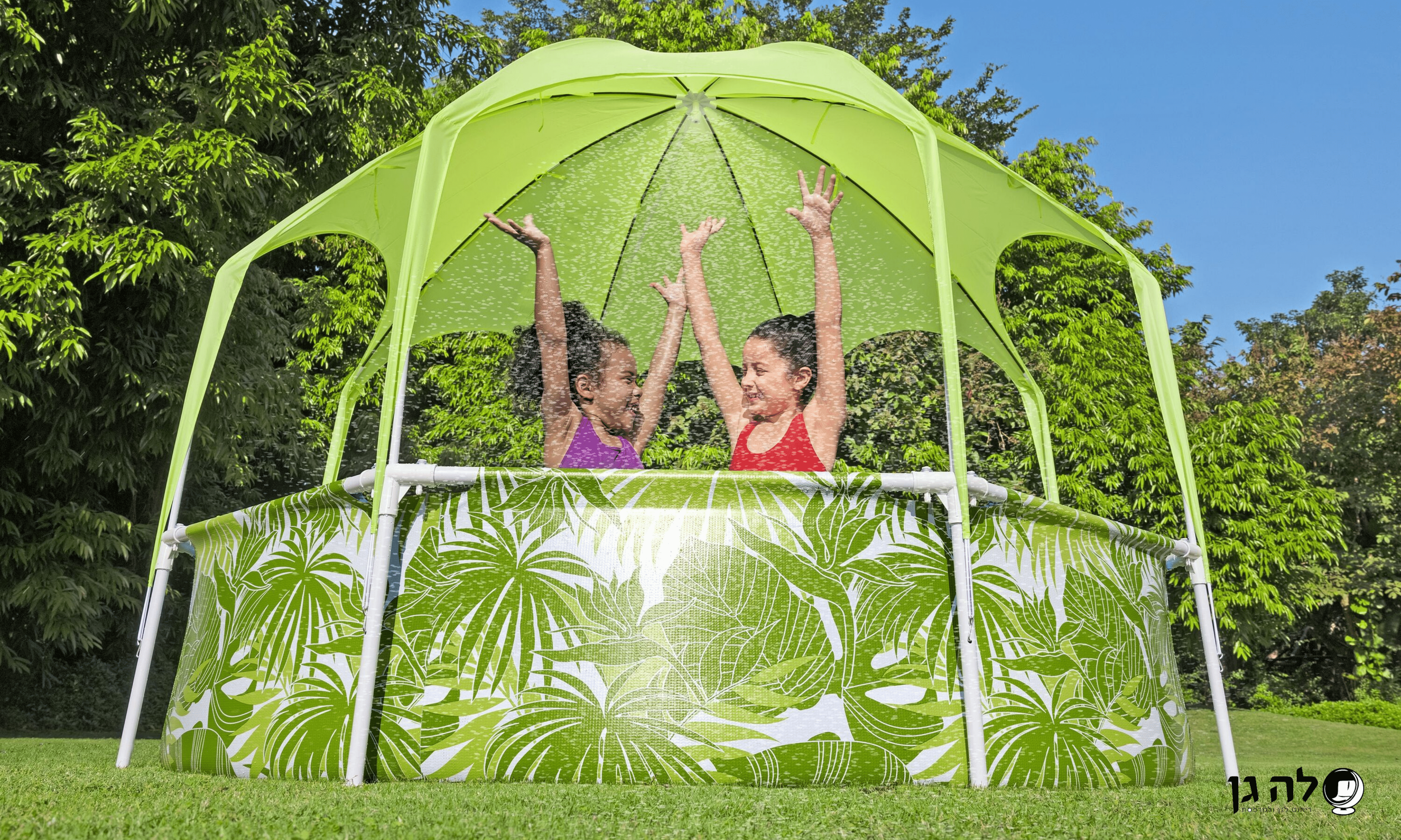 בריכת משחק עגולה עם גגון הצללה, מתז מים ושלדה.