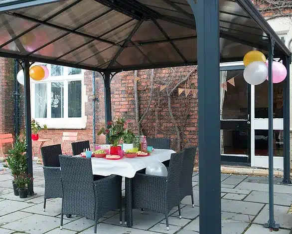 גזיבו מעוצב עם שלד אלומיניום עמיד, קירוי פוליקרבונט מתקדם והגנה מלאה מקרינת UV, מספק צל ונוחות לכל עונות השנה