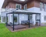 גזיבו עמיד ויוקרתי עם שלדת אלומיניום, קירוי פוליקרבונט HEAT BLOCK, מסילות לוילונות ועמידות גבוהה לרוחות, גשם ושלג.
