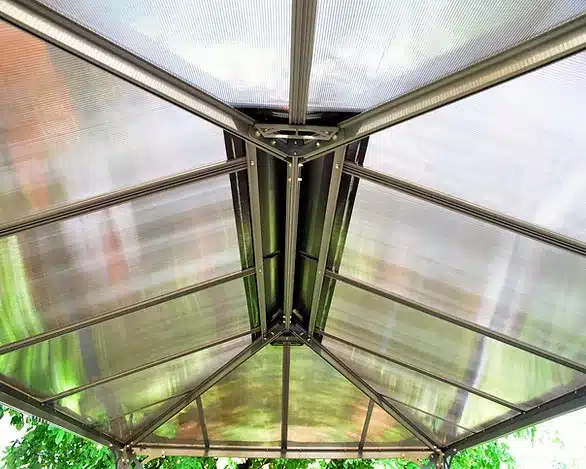גזיבו משושה חזק עם שלדת אלומיניום מחוזקת, קירוי פוליקרבונט בגוון ברונזה, פתח אוורור ומערכת עיגון מפלדה – אידיאלי לגינה או לג'קוזי חיצוני.