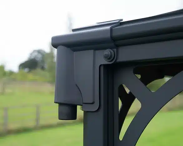 גזיבו מעוצב עם שלדת אלומיניום עמידה, קירוי פוליקרבונט HEAT BLOCK להצללה והגנה מקרינת UV, מערכת מרזבים לניקוז מים יעיל ופתח אוורור לשיפור זרימת האוויר – פתרון אידיאלי לגינה נוחה ומוגנת בכל עונות השנה.