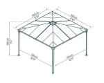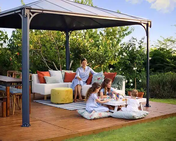 גזיבו אלגנטי עם שלדת אלומיניום עמידה, גג פוליקרבונט HEAT BLOCK להגנה מפני קרינת UV, פתח אוורור לשיפור זרימת האוויר ומערכת מרזבים לניקוז מים יעיל – פתרון מושלם להצללה ונוחות בגינה בכל עונות השנה.