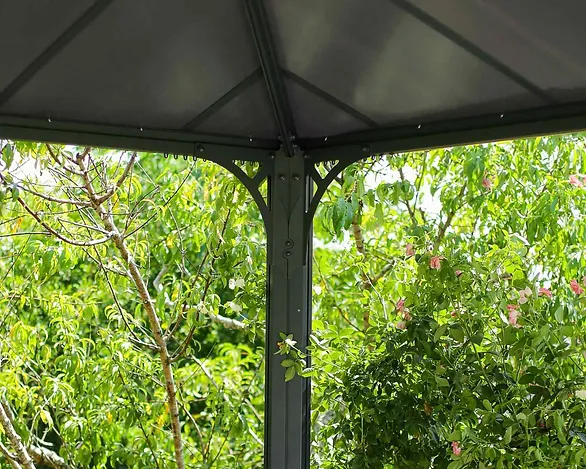 גזיבו מודרני עם שלדת אלומיניום עמידה, קירוי פוליקרבונט HEAT BLOCK להגנה מפני קרינת UV והפחתת חום, פתח אוורור לשיפור זרימת האוויר, מערכת מרזבים לניקוז מים יעיל ומסילות מובנות לתליית וילונות או רשתות. מספק הצללה מושלמת, יציבות ועמידות גבוהה בתנאי מזג האוויר, לנוחות מקסימלית בגינה בכל עונות השנה.