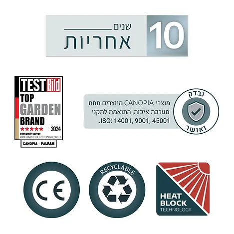 שלדת אלומיניום חזקה במיוחד מבטיחה עמידות גבוהה ואינה מחלידה, נסדקת או מצהיבה. בנוסף, קירוי פוליקרבונט בטכנולוגיית HEAT BLOCK מספק הצללה מושלמת, מפחית את החום באזור המוצל ומגן ב-100% מפני קרינת UV מזיקה.