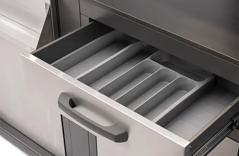 יחידת האחסון המודולרית תוכננה להשתלב באופן אידיאלי עם גרילי Napoleon מסדרת ROGUE ומציעה פתרון אחסון חכם, נוח ועמיד. היחידה כוללת מגירה עליונה עם סכומון ומסילה שקטה לאחסון כלי עבודה, אביזרי גריל או סכו"ם, ומתחתיה שני דלתות תחתונות עם מדף אמצעי נשלף לניצול יעיל של שטח האחסון. המבנה החזק מיועד לעמידות בתנאי חוץ ומצופה משטח פורצלן איכותי בעל עמידות גבוהה לחום, קור ושריטות. גלגלים בתחתית היחידה מאפשרים ניוד קל, והפאנל האחורי המובנה מאפשר הצמדה מלאה לקיר ושמירה על סדר וניקיון בחלק האחורי של המטבח. המבנה המודולרי מאפשר התקנה פשוטה וחיבור קל ליחידות נוספות ליצירת קומפוזיציה מותאמת אישית במטבח החוץ. מידות: אורך 77.4 ס"מ, עומק 69.2 ס"מ, גובה 90 ס"מ.