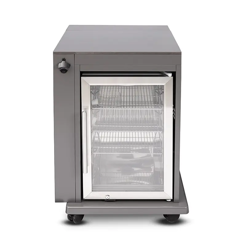 יחידת הקירור המובנית למטבח החוץ מספקת פתרון אלגנטי, פרקטי ועמיד לאחסון משקאות ומזון בקירור, בצורה נוחה ונגישה במהלך האירוח. המקרר כולל דלת זכוכית מחוסמת, תאורת LED פנימית לנראות גם בלילה, ומדחס שקט עם שליטה נוחה על הטמפרטורה לשמירה אופטימלית על התכולה. מדפים מתכווננים מאפשרים התאמה לכל סוגי הבקבוקים והמוצרים, ונפח האחסון הכולל עומד על 60 ליטר. פותחן בקבוקים מובנה ממוקם בחזית היחידה לנוחות מקסימלית. ליחידה משטח פורצלן איכותי בעל עמידות גבוהה בפני חום, קור ושריטות, מבנה מודולרי המאפשר חיבור קל ליחידות נוספות וגלגלים המאפשרים ניוד קל ונוח. הפאנל האחורי מאפשר הצמדה מלאה לקיר לשמירה על ניקיון וסדר בחלקו האחורי של המטבח. מידות: אורך 65.3 ס"מ, עומק 69.2 ס"מ, גובה 90 ס"מ.