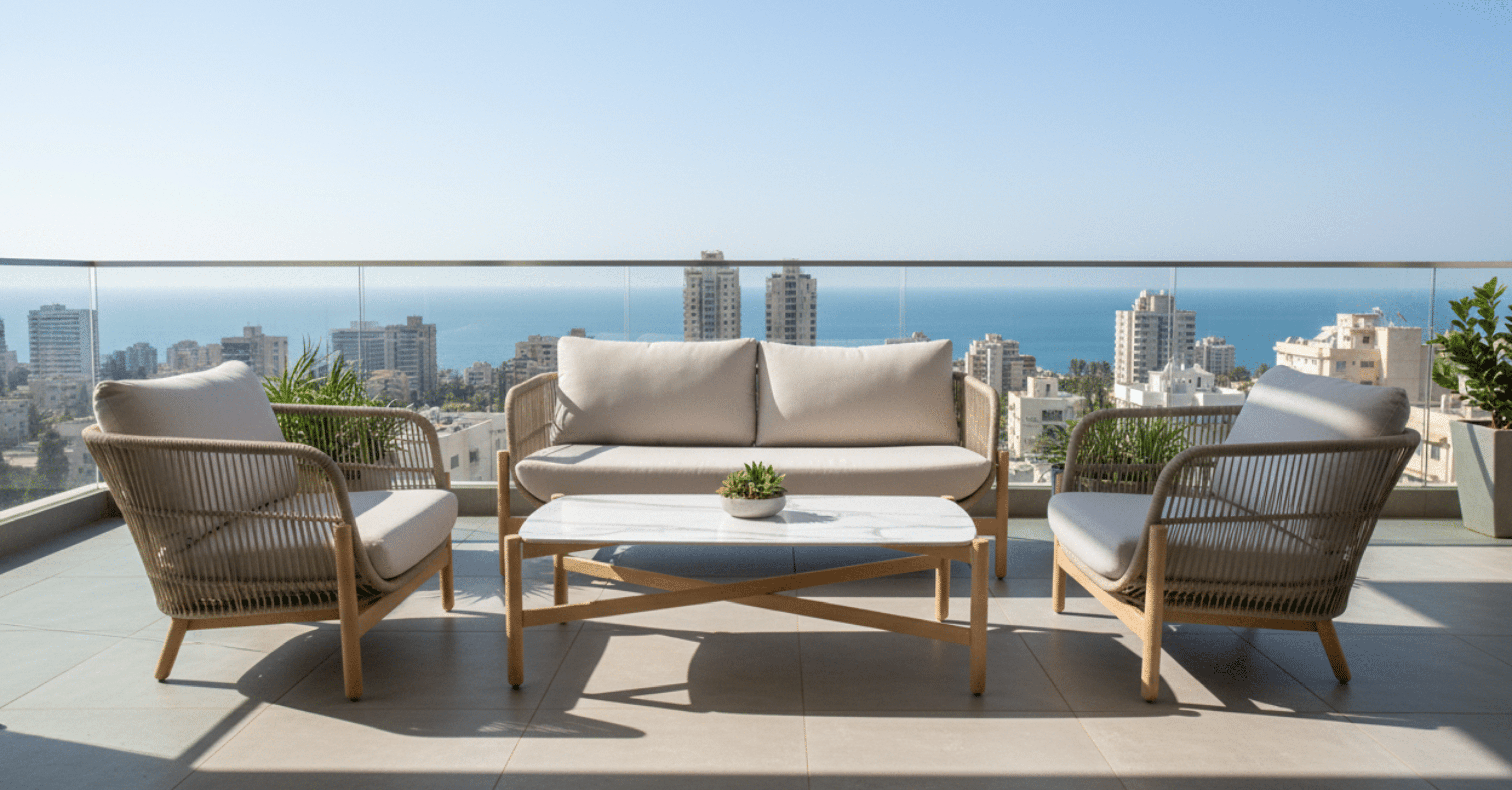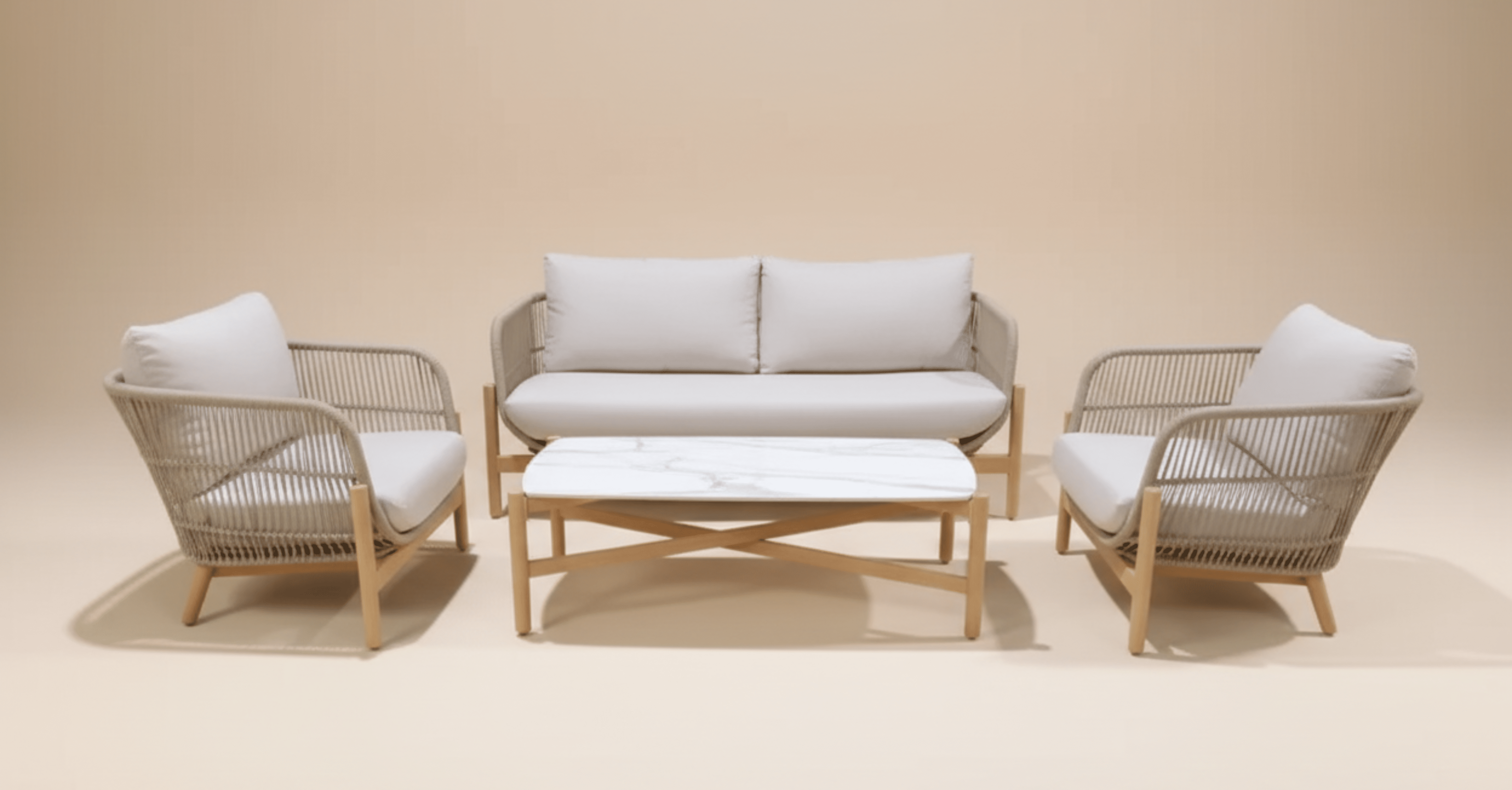 מערכת ישיבה איכותית בעלת מראה אלגנטי ומרשים. המערכת עשויה שילדת אלומיניום בשילוב חבלים.
