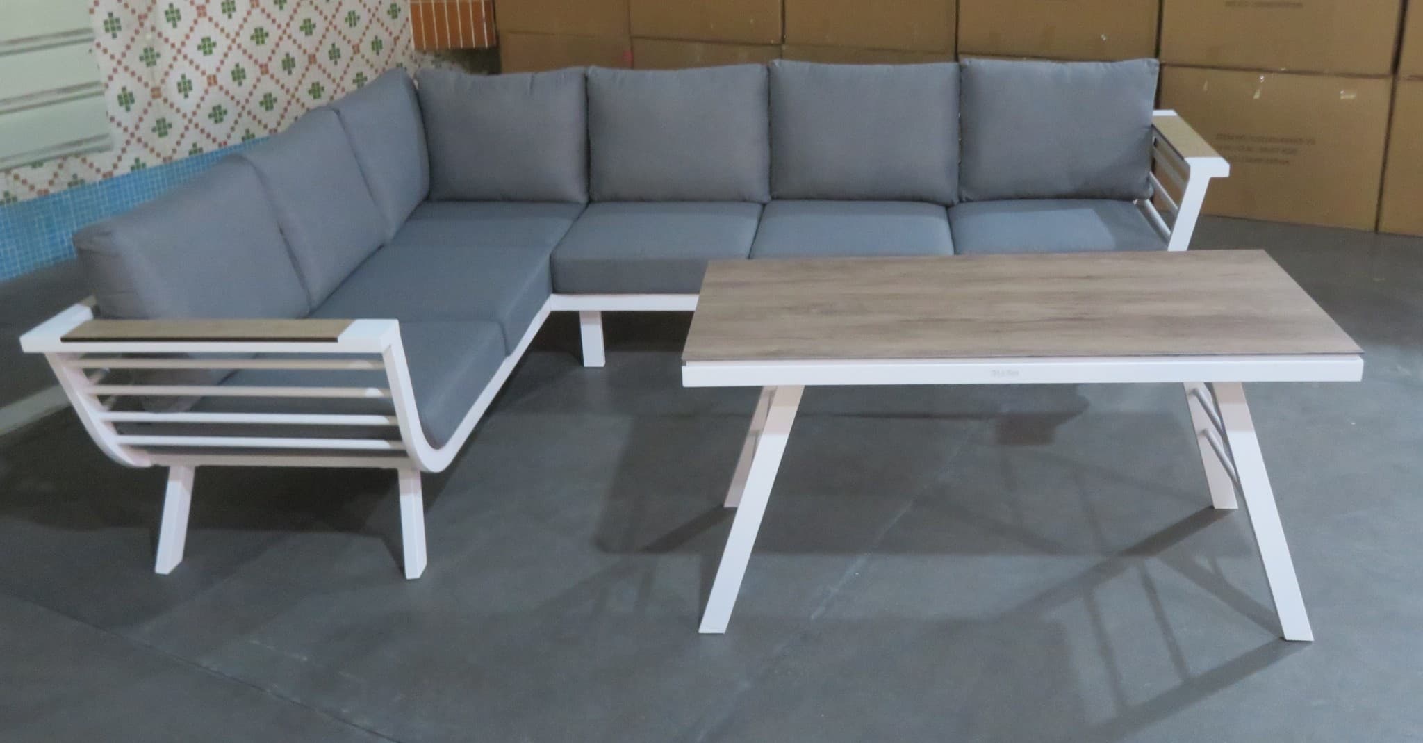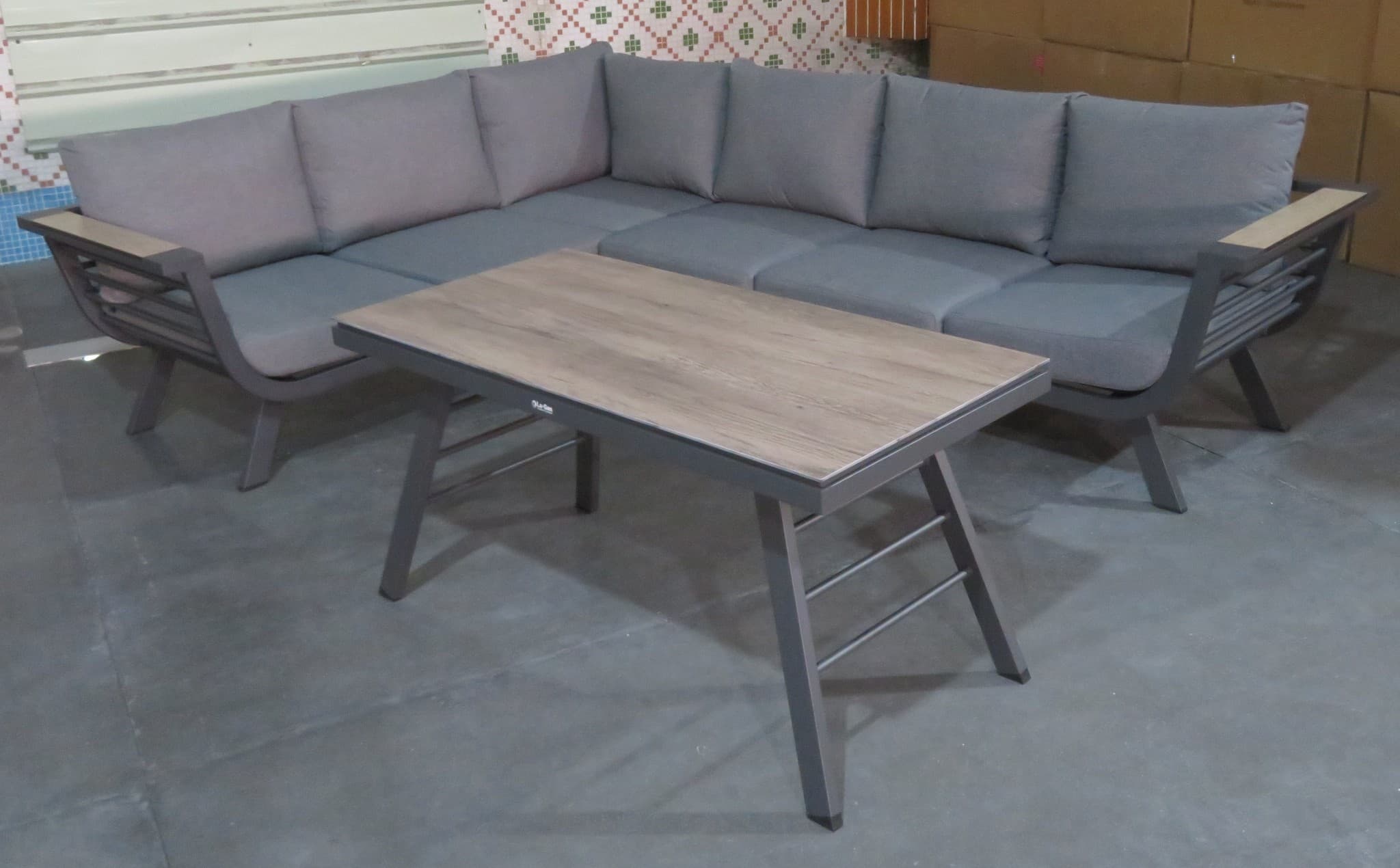 מערכת ישיבה פינתית מאלומיניום בעיצוב אלגנטי בעלת חיפוי דמוי עץ בידיות ובשולחן