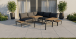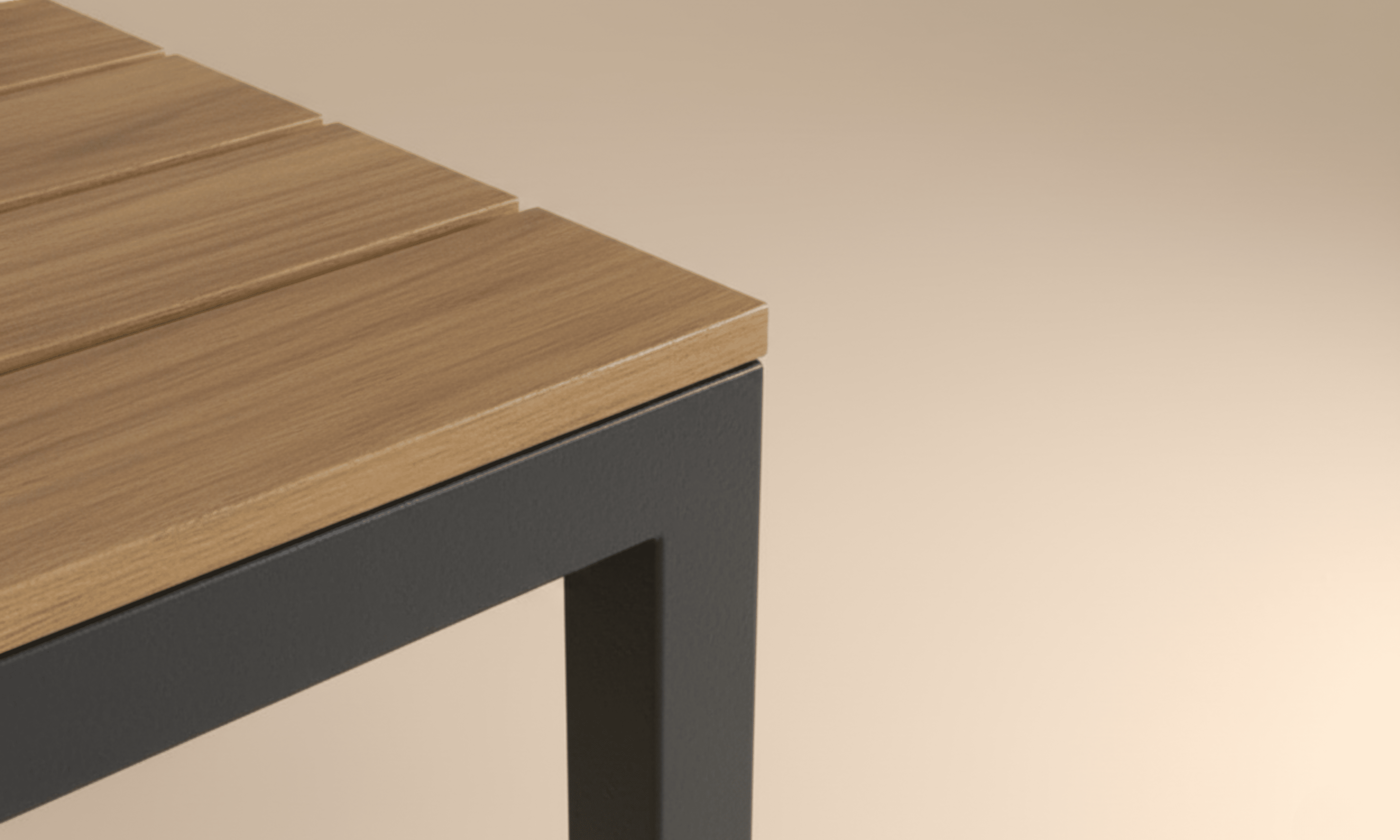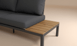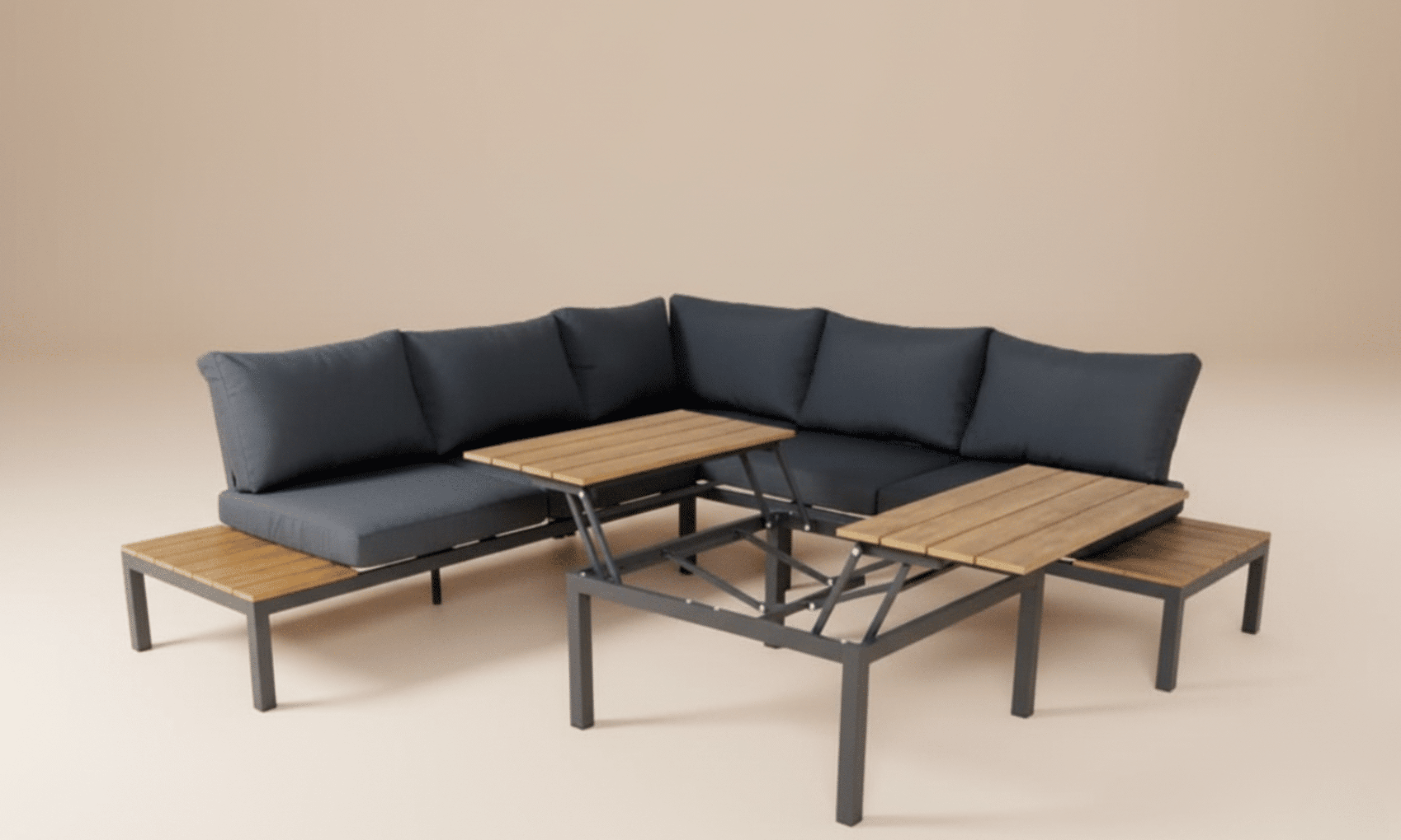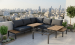 מערכת ישיבה מאלומיניום ודמוי עץ בעיצוב מודרני ואלגנטי, בעלת חמישה מושבים ושולחן קפה.