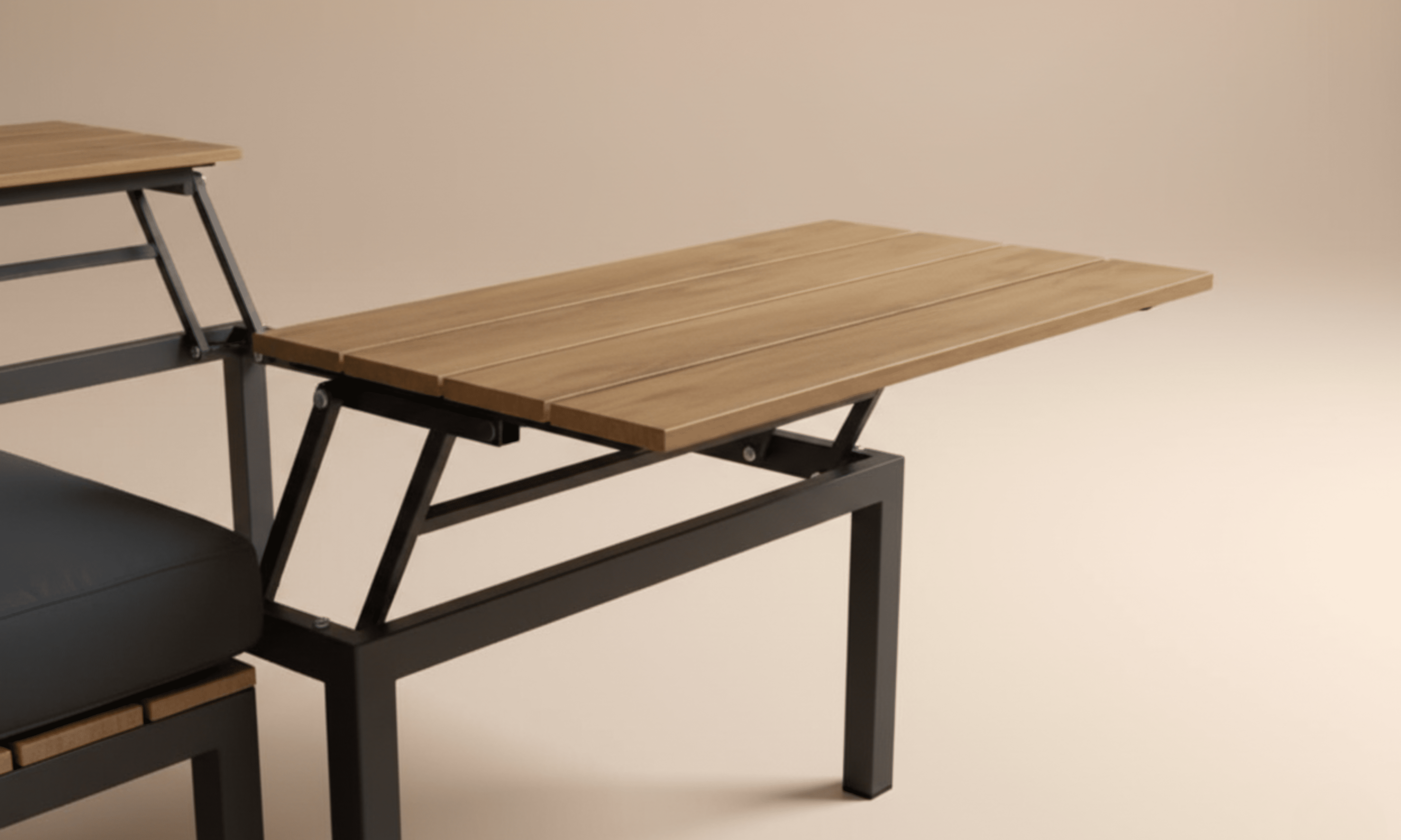 מערכת ישיבה מפנקת מאלומיניום עם שולחן מתכוונן, לשולחן ולכסאות חיפוי דמוי עץ