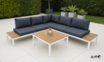 מערכת ישיבה מאלומיניום ודמוי עץ בעיצוב מודרני, בעלת חמישה מושבים ושולחן קפה