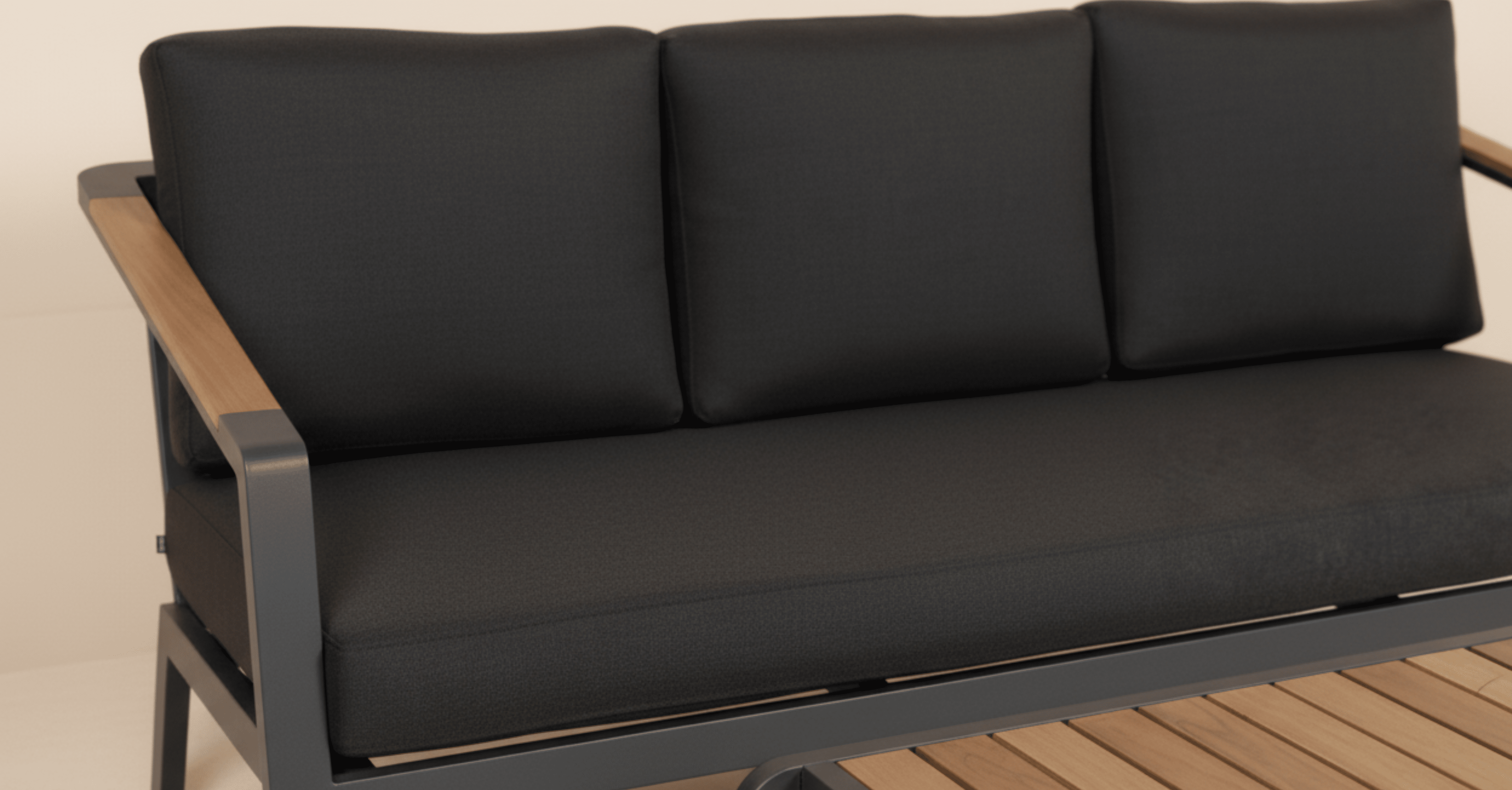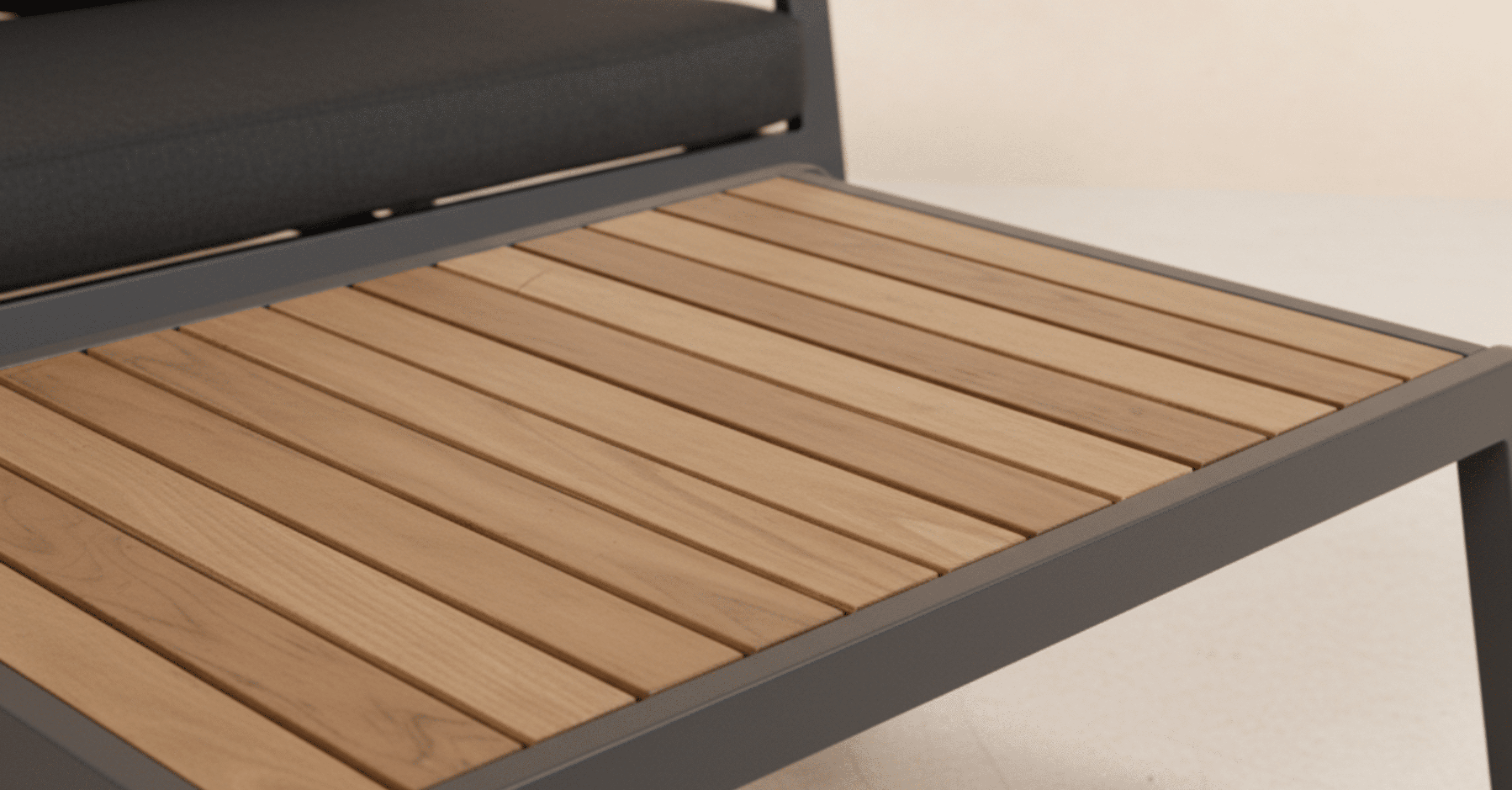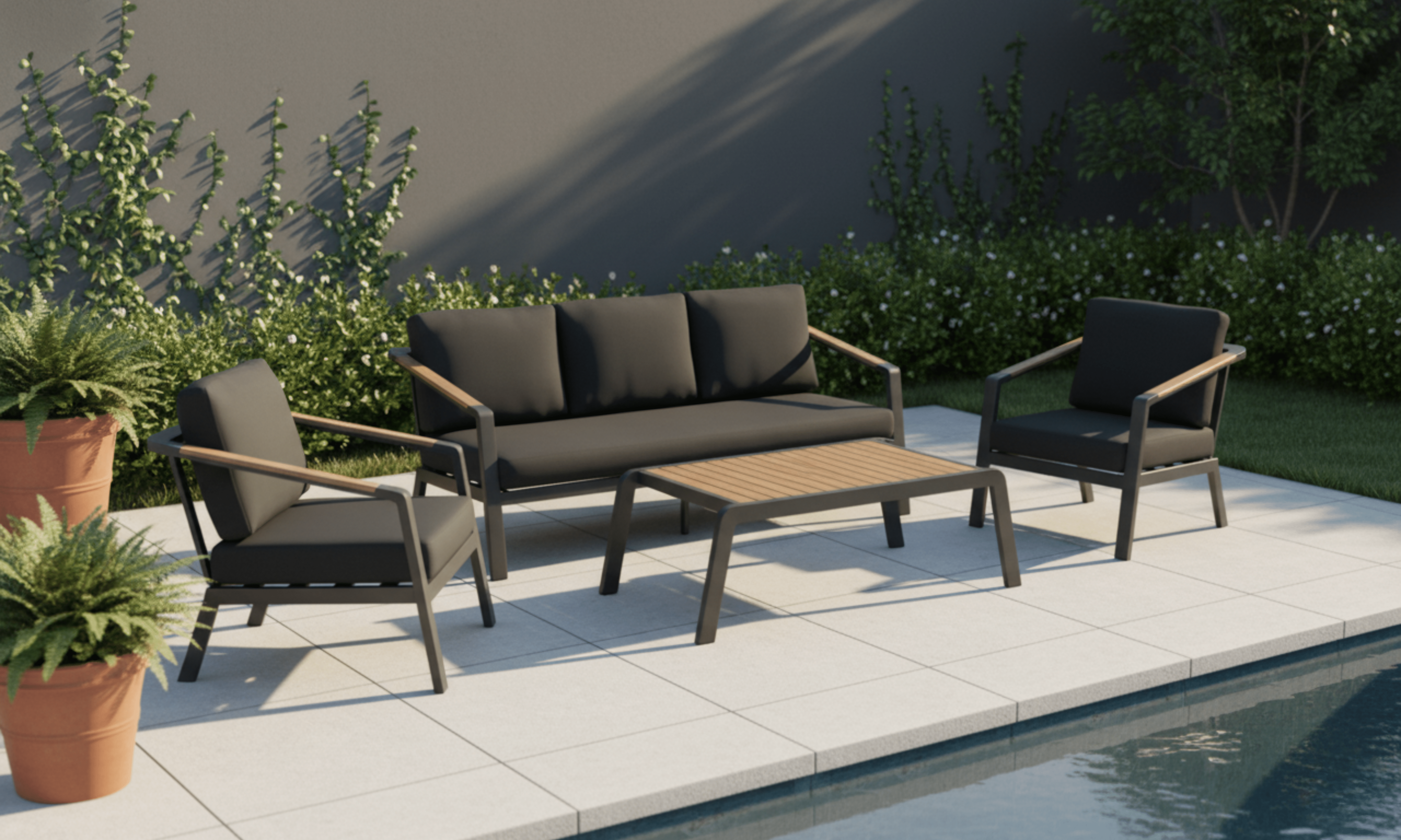מערכת ישיבה בעלת חמישה מושבים, עשויה אלומיניום בשילוב חומר דמוי עץ בידיות ובפלטת השולחן.