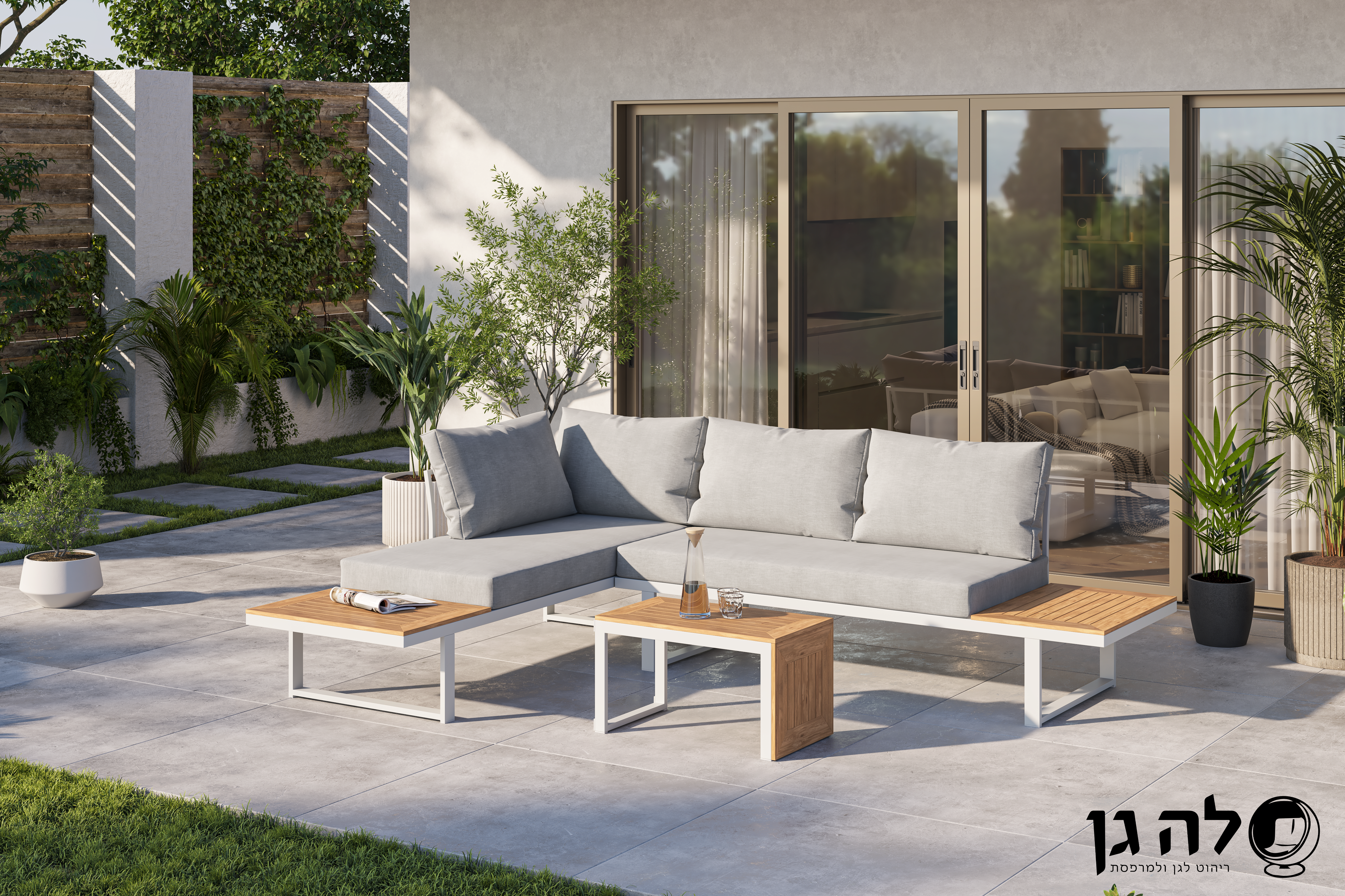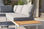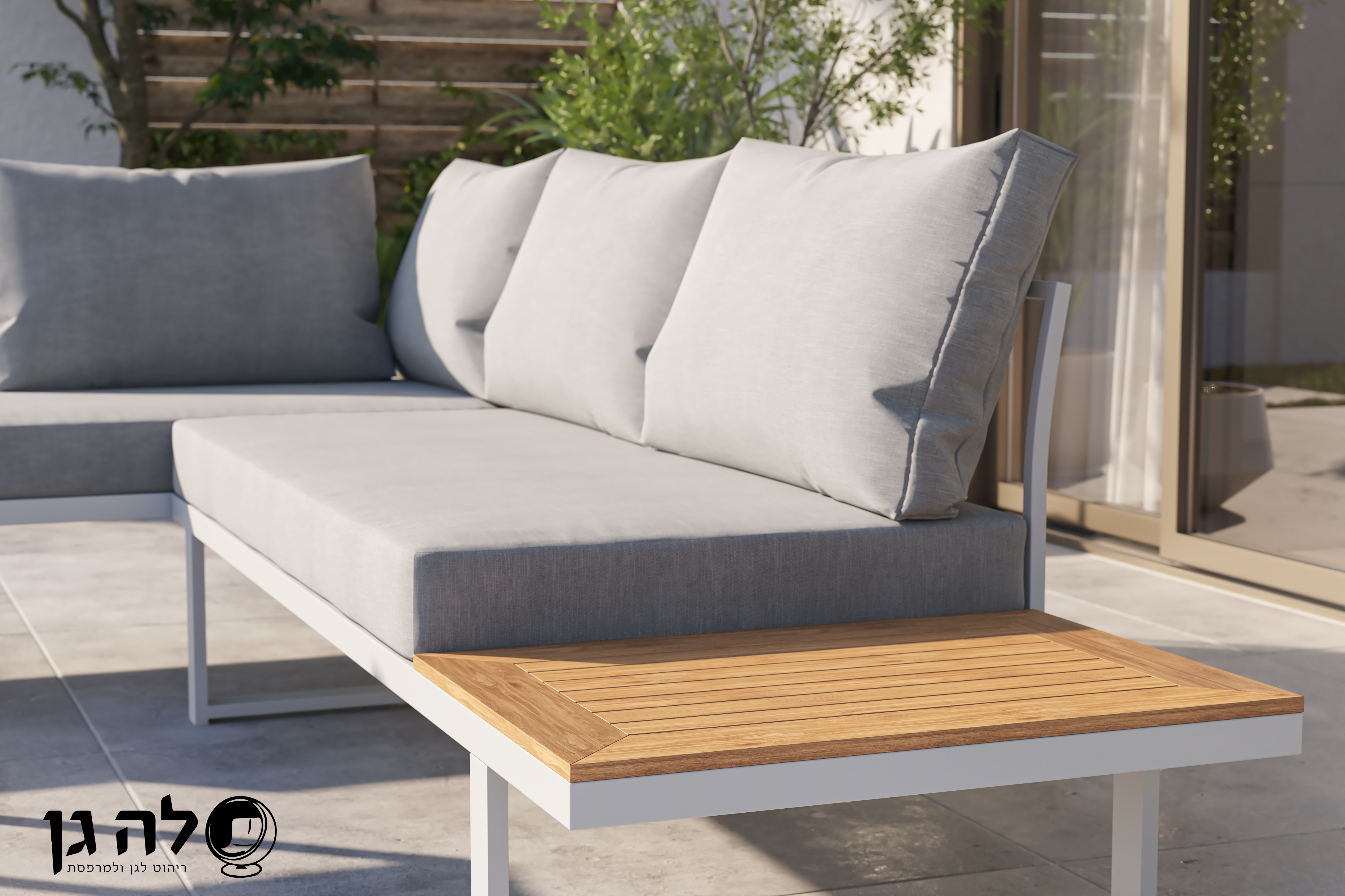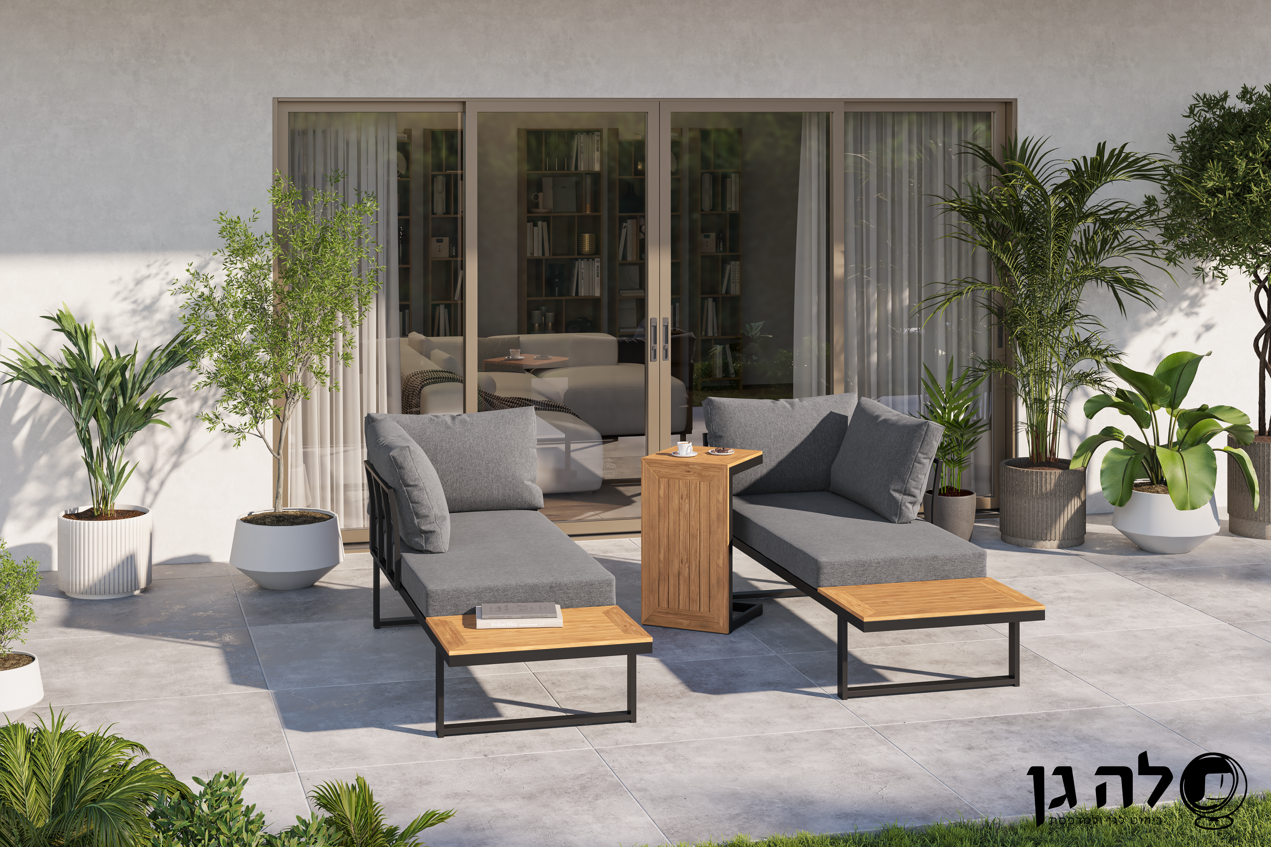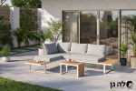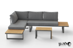 מערכת ישיבה מאלומיניום ודמוי עץ בעיצוב מודרני, בעלת חמישה מושבים ושולחן קפה