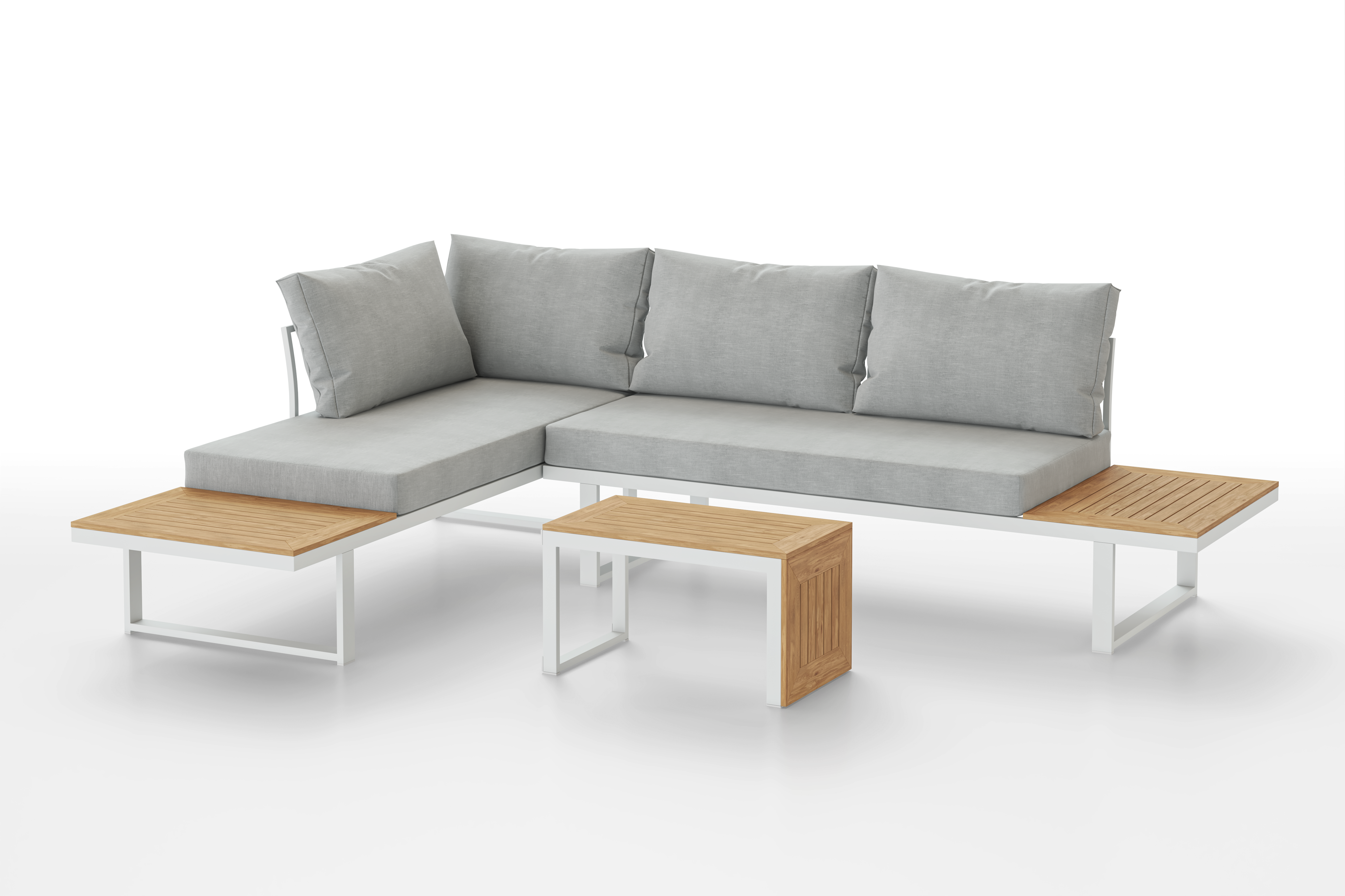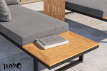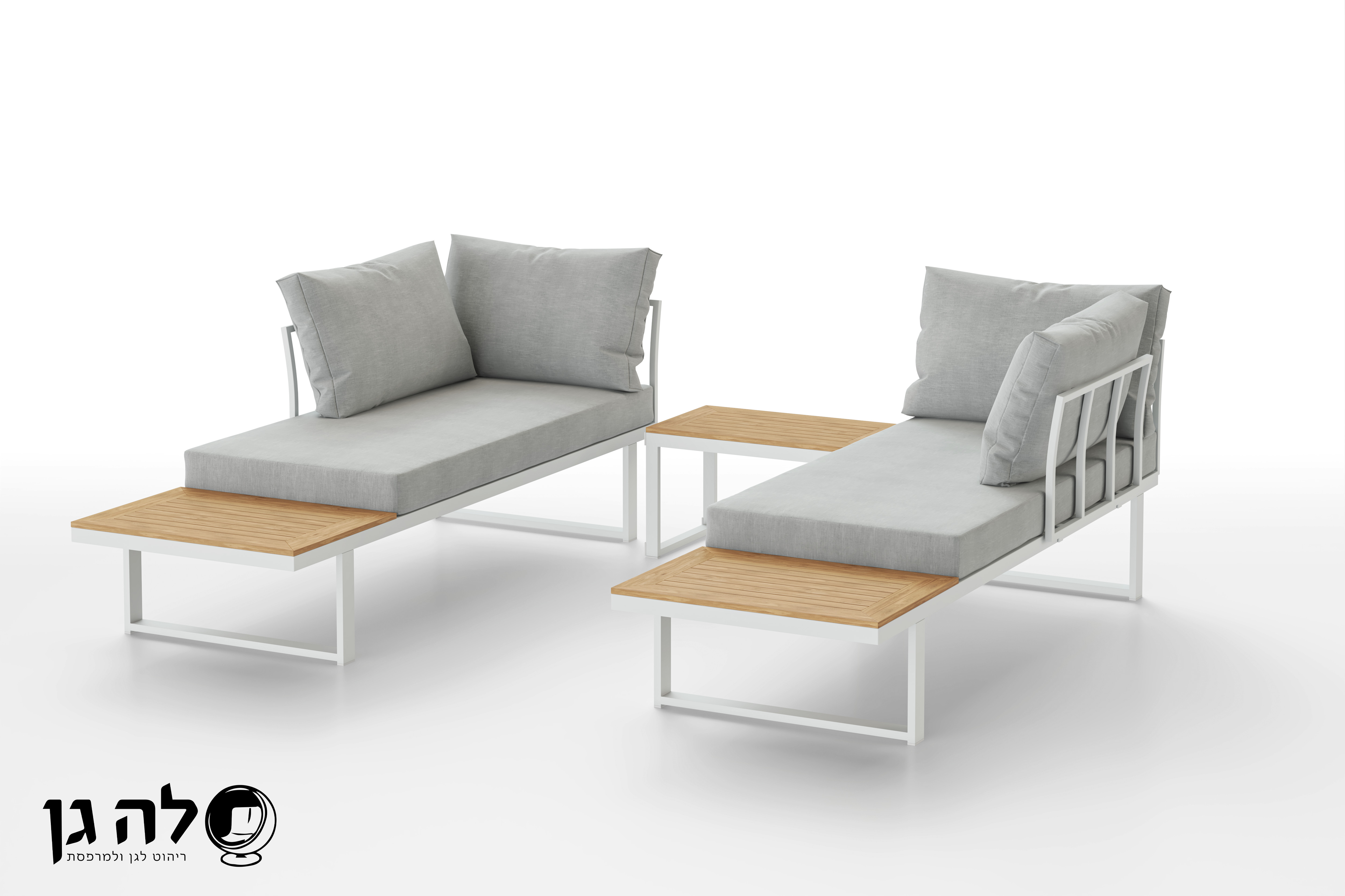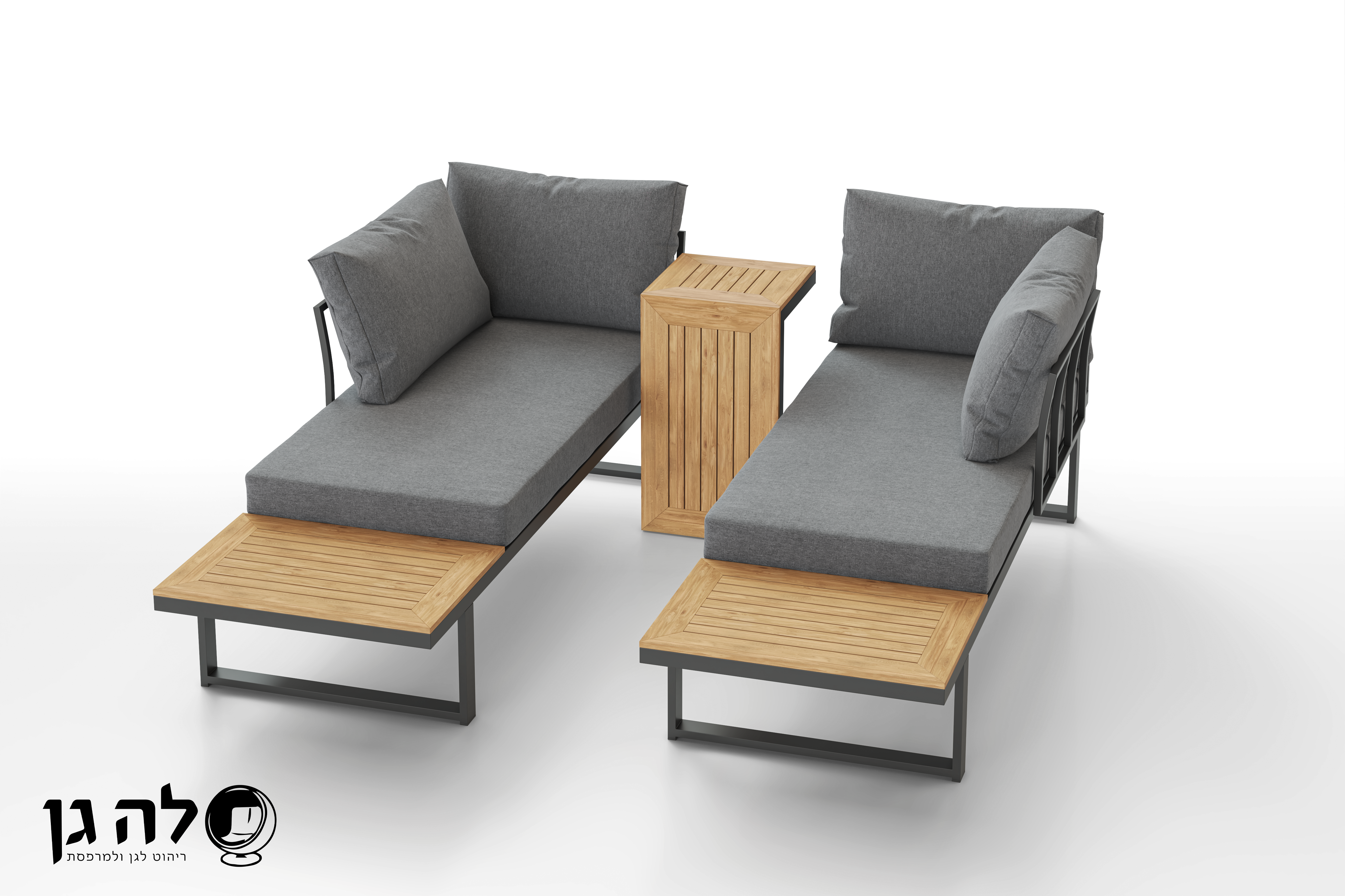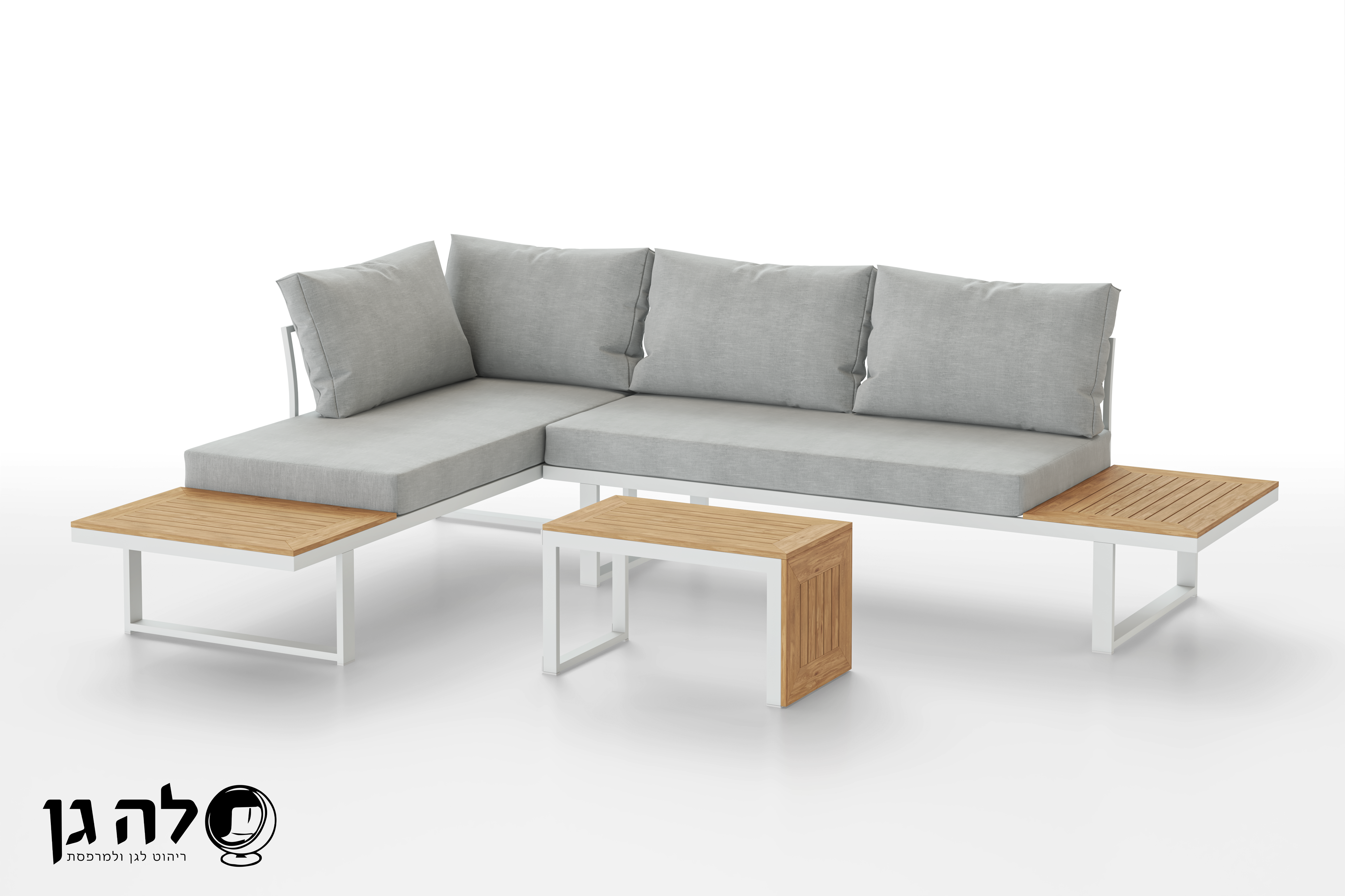מערכת ישיבה מאלומיניום ודמוי עץ בעיצוב מודרני, בעלת חמישה מושבים ושולחן קפה