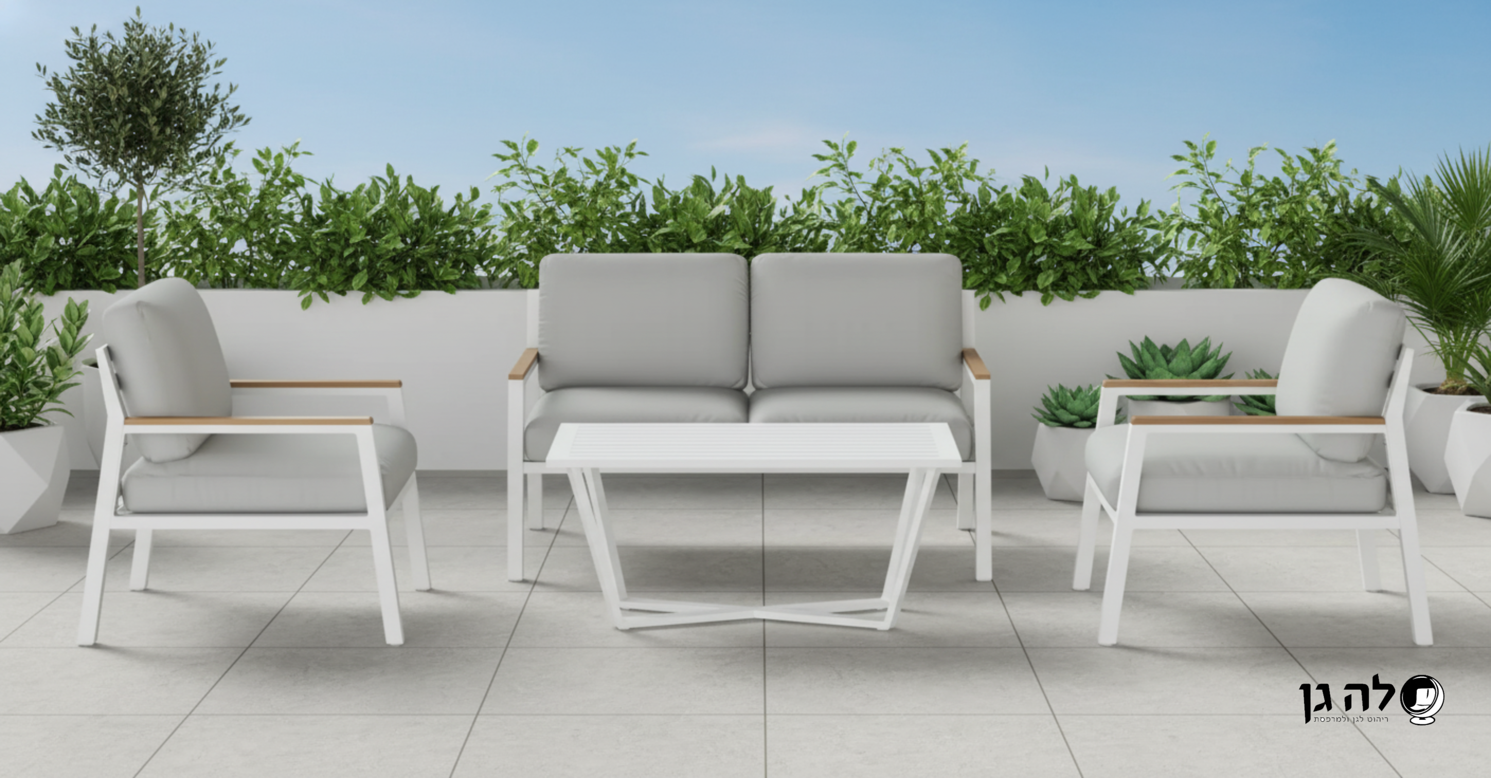 מערכת ישיבה מאלומיניום, כוללת ספה דו-מושבית, 2 כורסאות ושולחן קפה, עם כריות עבות בעיצוב מודרני