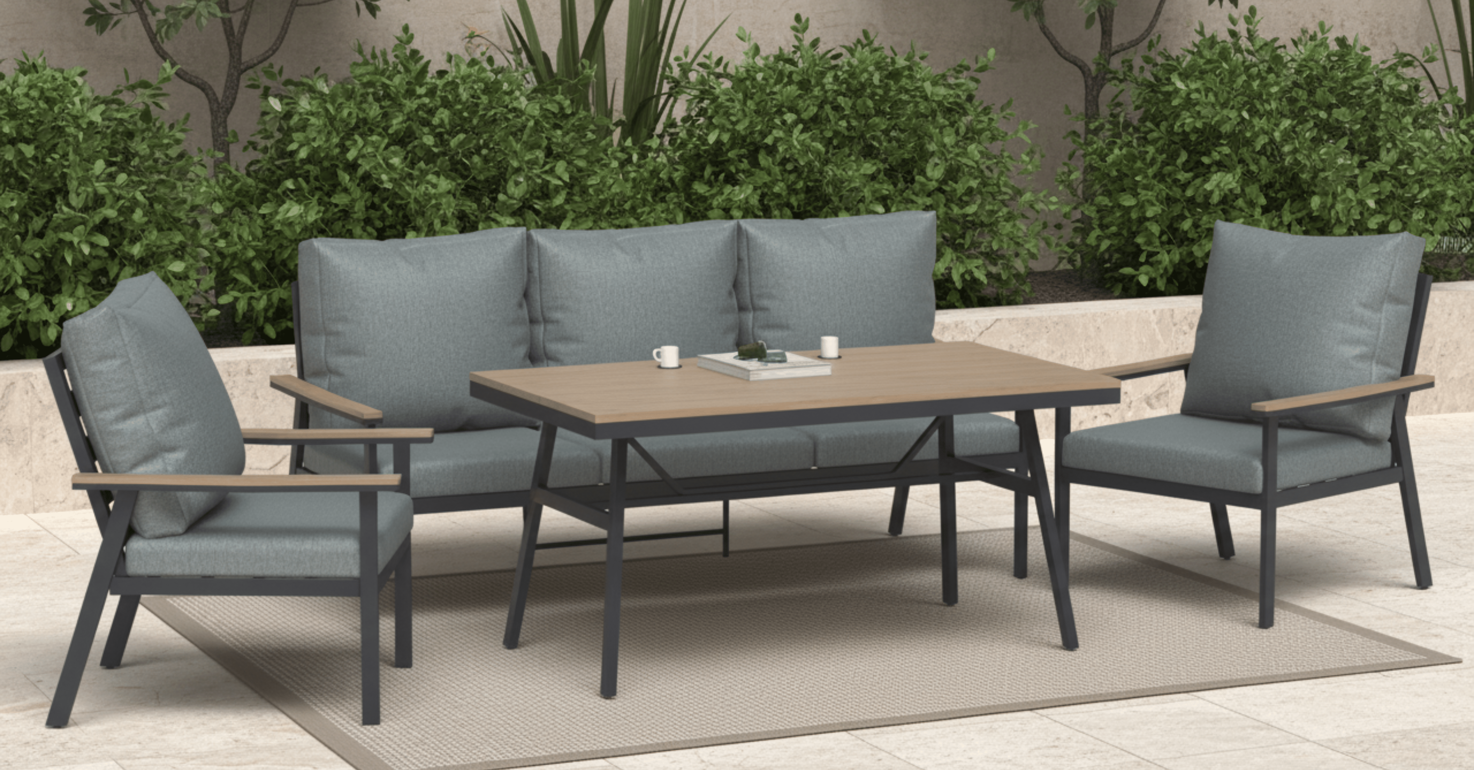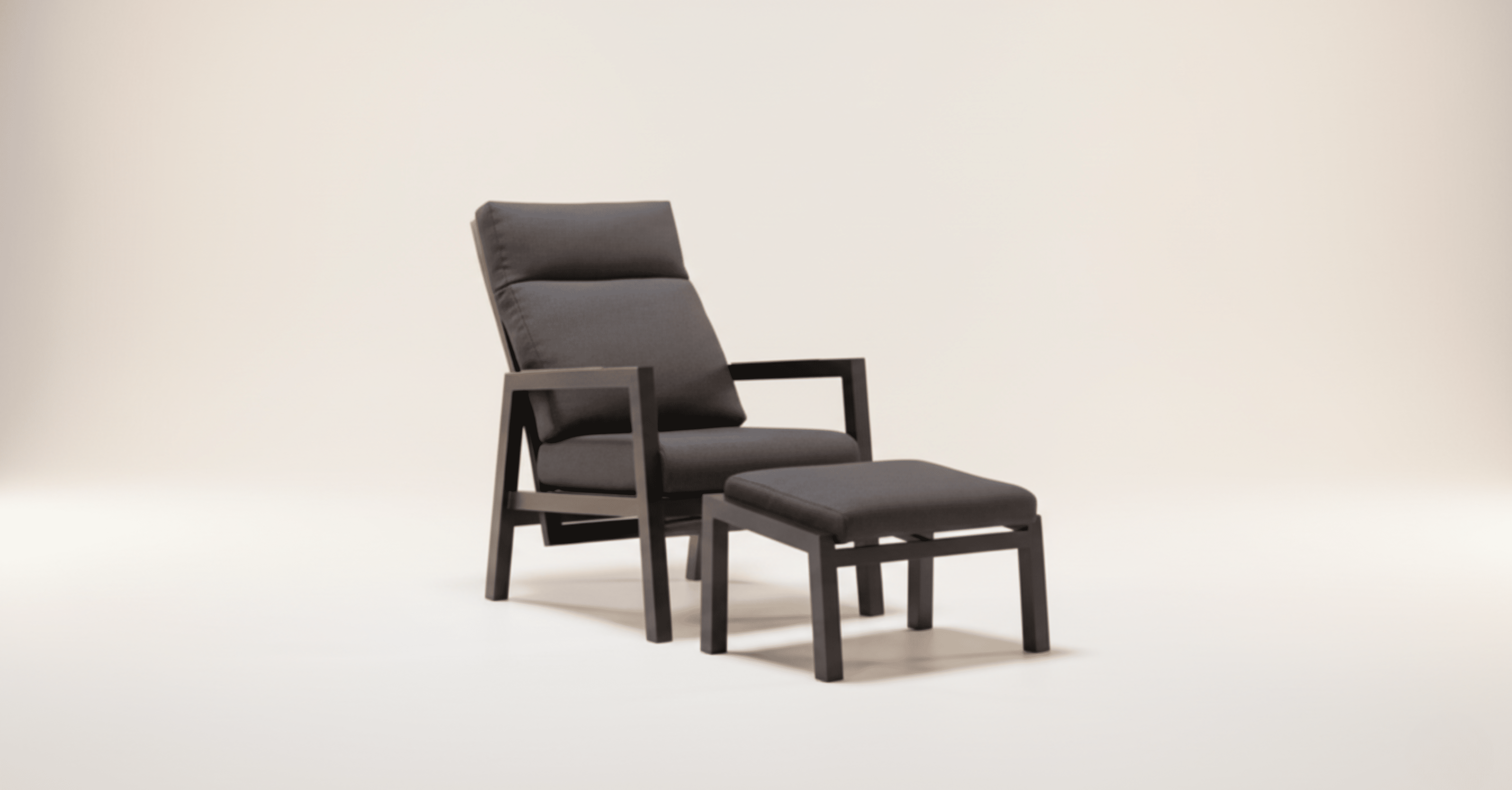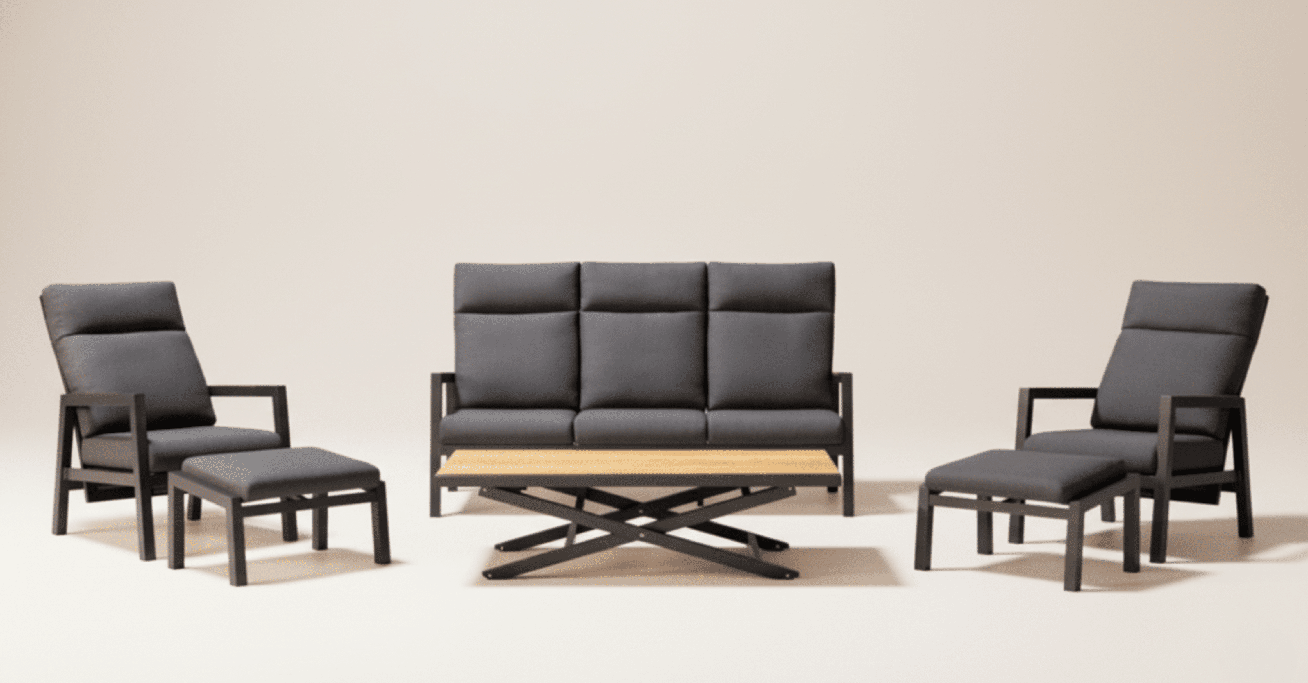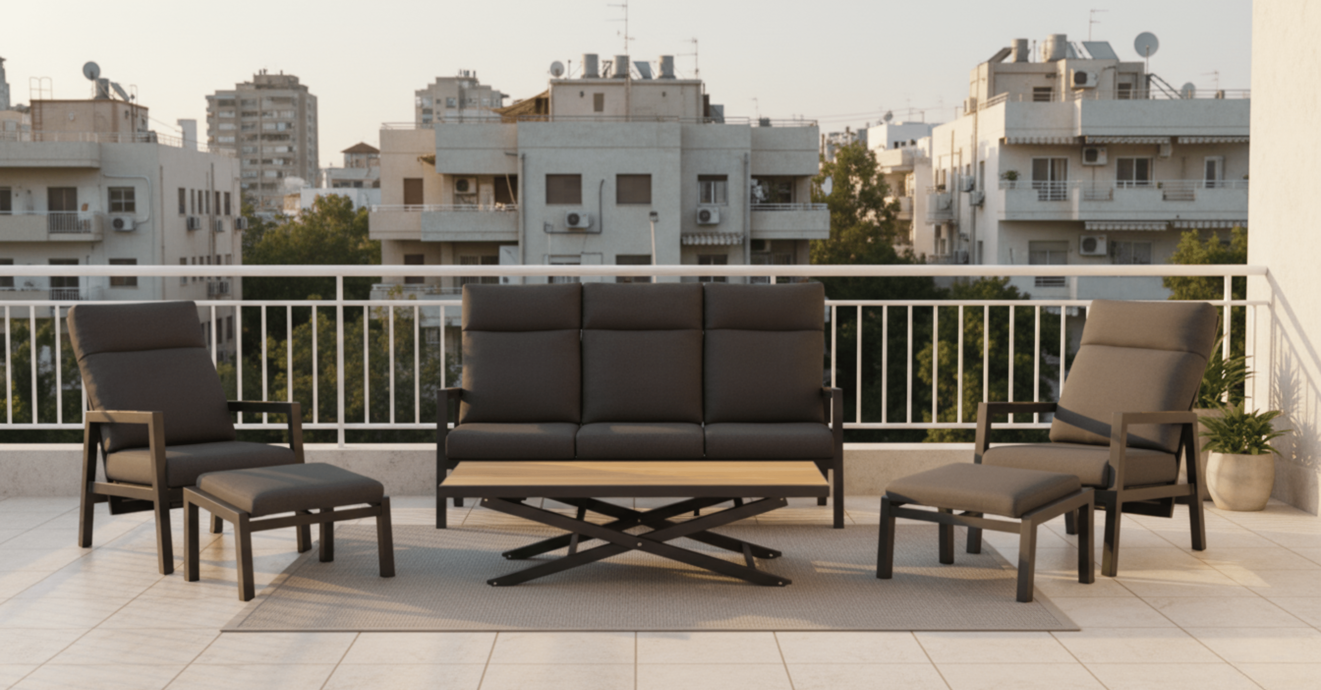 מסגרת אלומיניום בצבע אפור כהה בשילוב ריפוד וכריות בצבע אפור כהה או מסגרת אלומיניום בצבע לבן בשילוב ריפוד וכריות בצבע אפור כהה