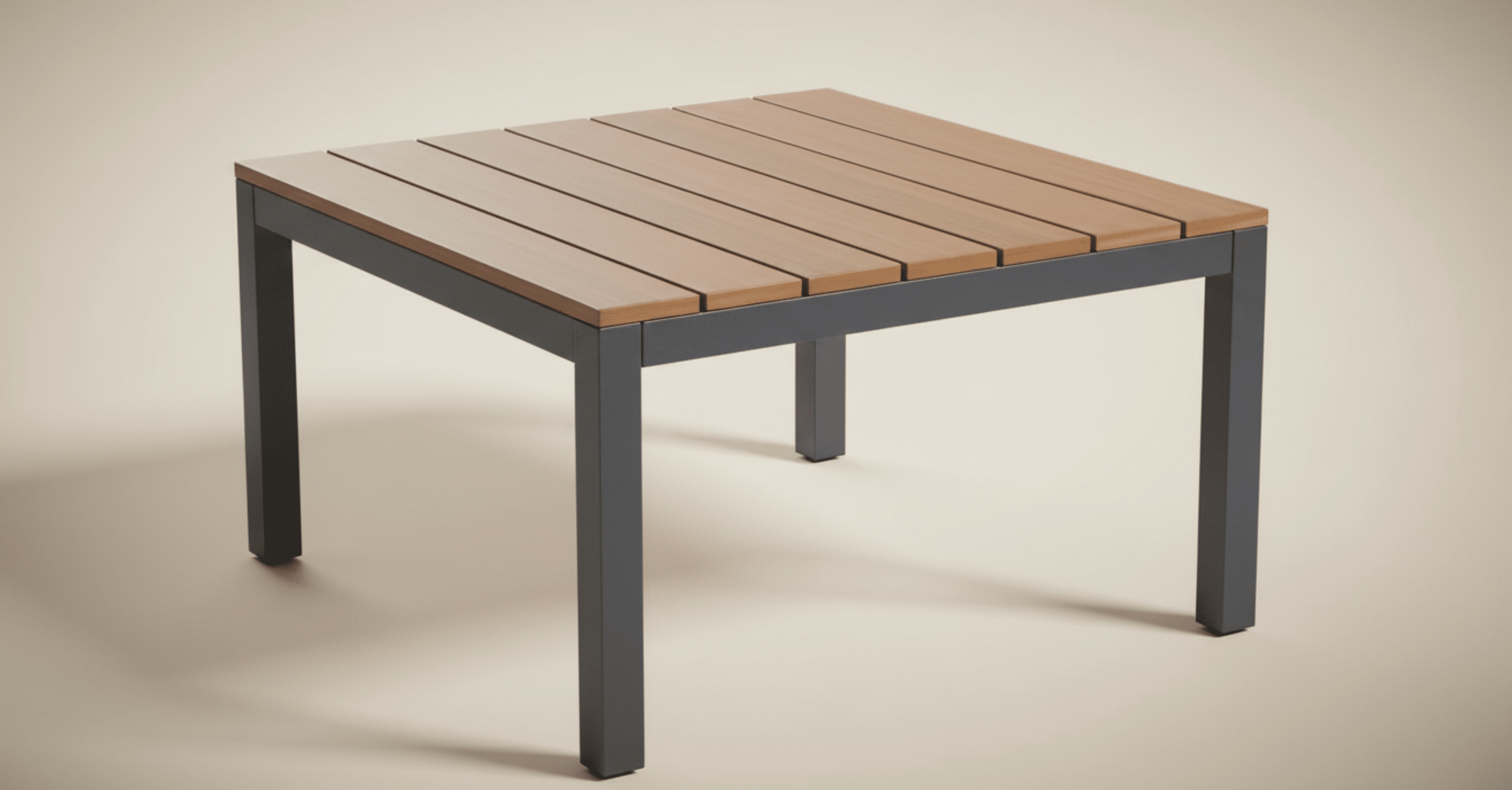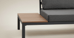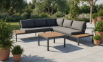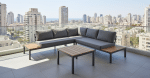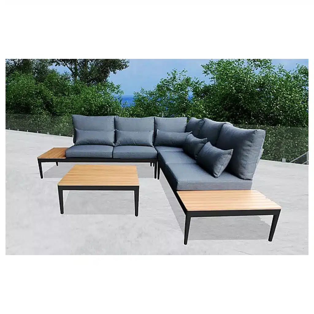 מערכת ישיבה פינתית בעיצוב מודרני, עשויה אלומיניום בשילוב חומר דמוי עץ, בעלת 5 מושבים