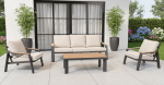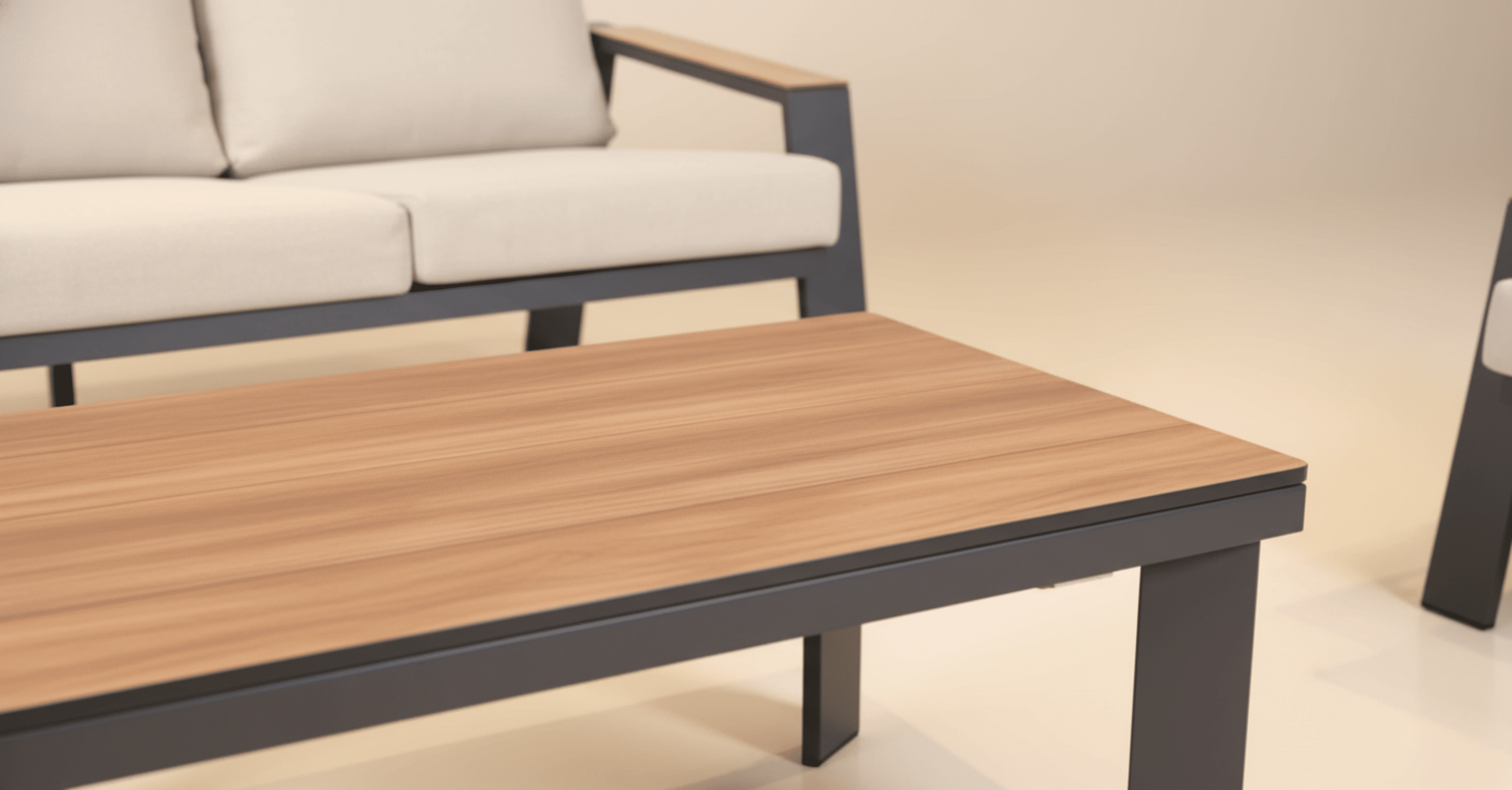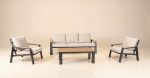 מערכת ישיבה מאלומיניום ודמוי עץ בעיצוב מודרני ואלגנטי, בעלת חמישה מושבים ושולחן קפה.