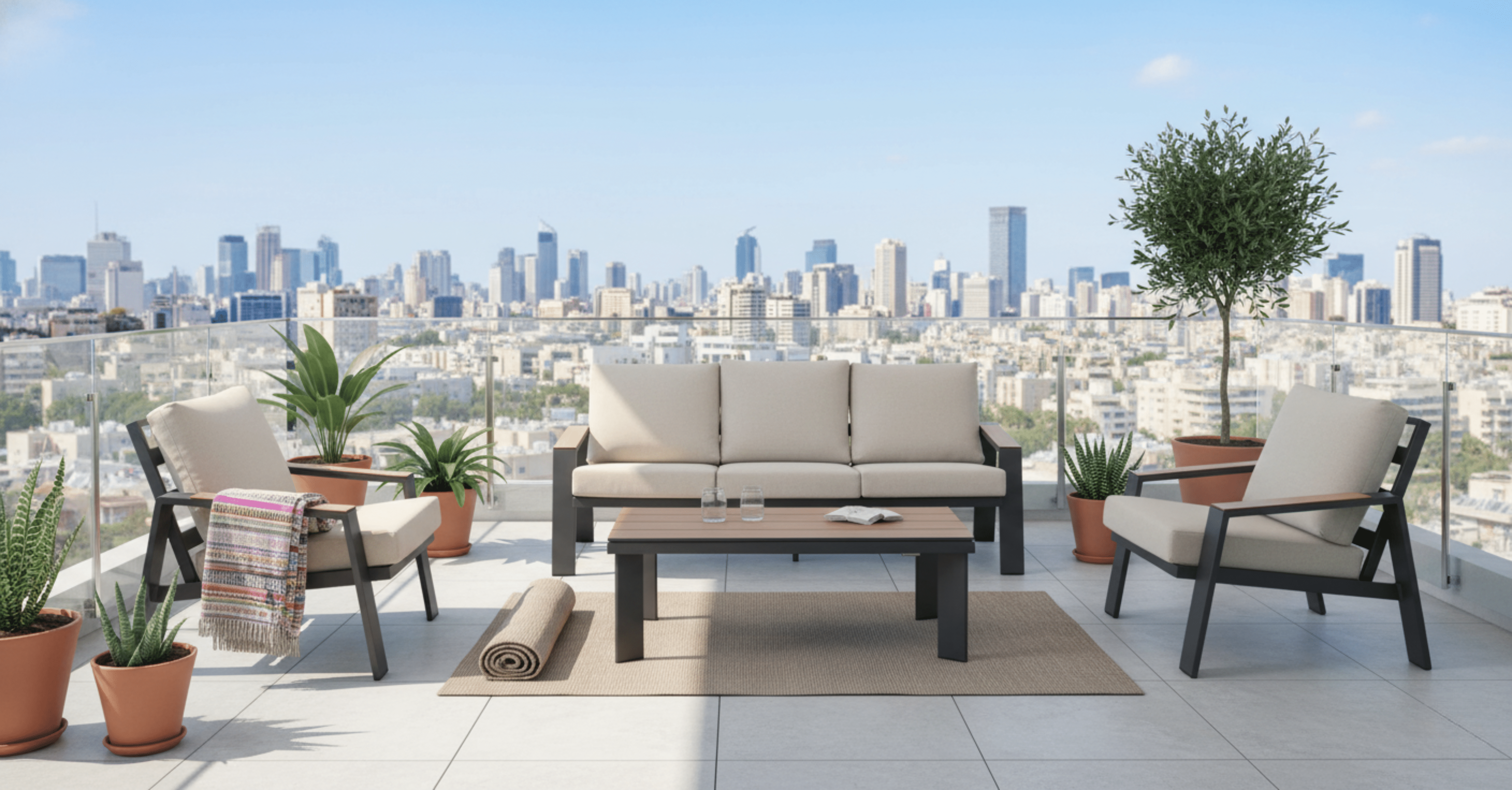 פינת ישיבה תלת-מושבית בעיצוב מודרני ואלגנטי, המתאימה לגינה ולמרפסת.