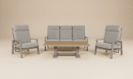 הסט כולל ספה תלת מושבית, שני כסאות ושולחן עם קורות דמוי עץ המקנה מראה יוקרתי בקו נקי.
