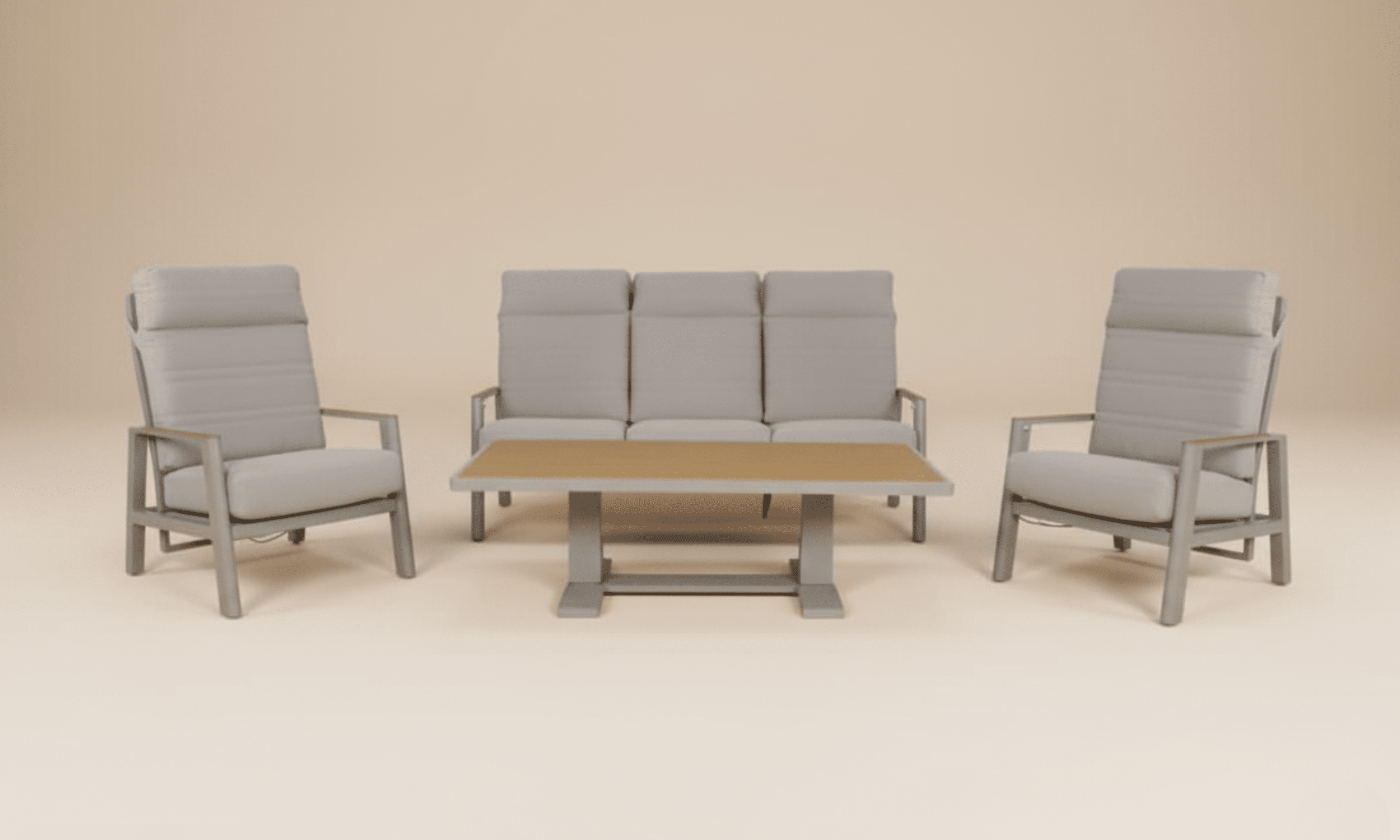 מערכת ישיבה יוקרתית מאלומיניום, בעלת ארבעה מושבים ושולחן קפה.
