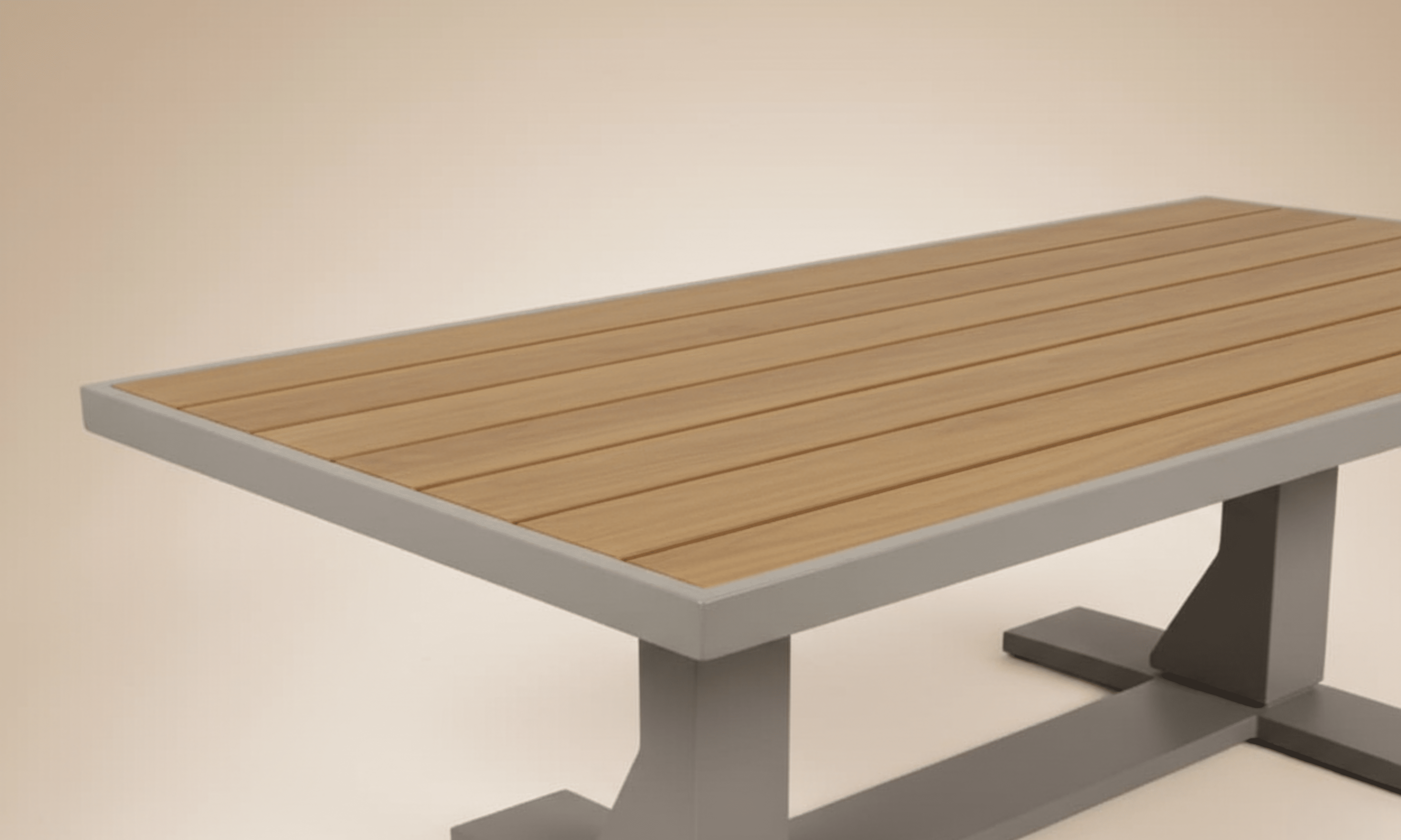 מערכת ישיבה מאלומיניום ודמוי עץ בעיצוב מודרני ואלגנטי, בעלת חמישה מושבים ושולחן קפה.
