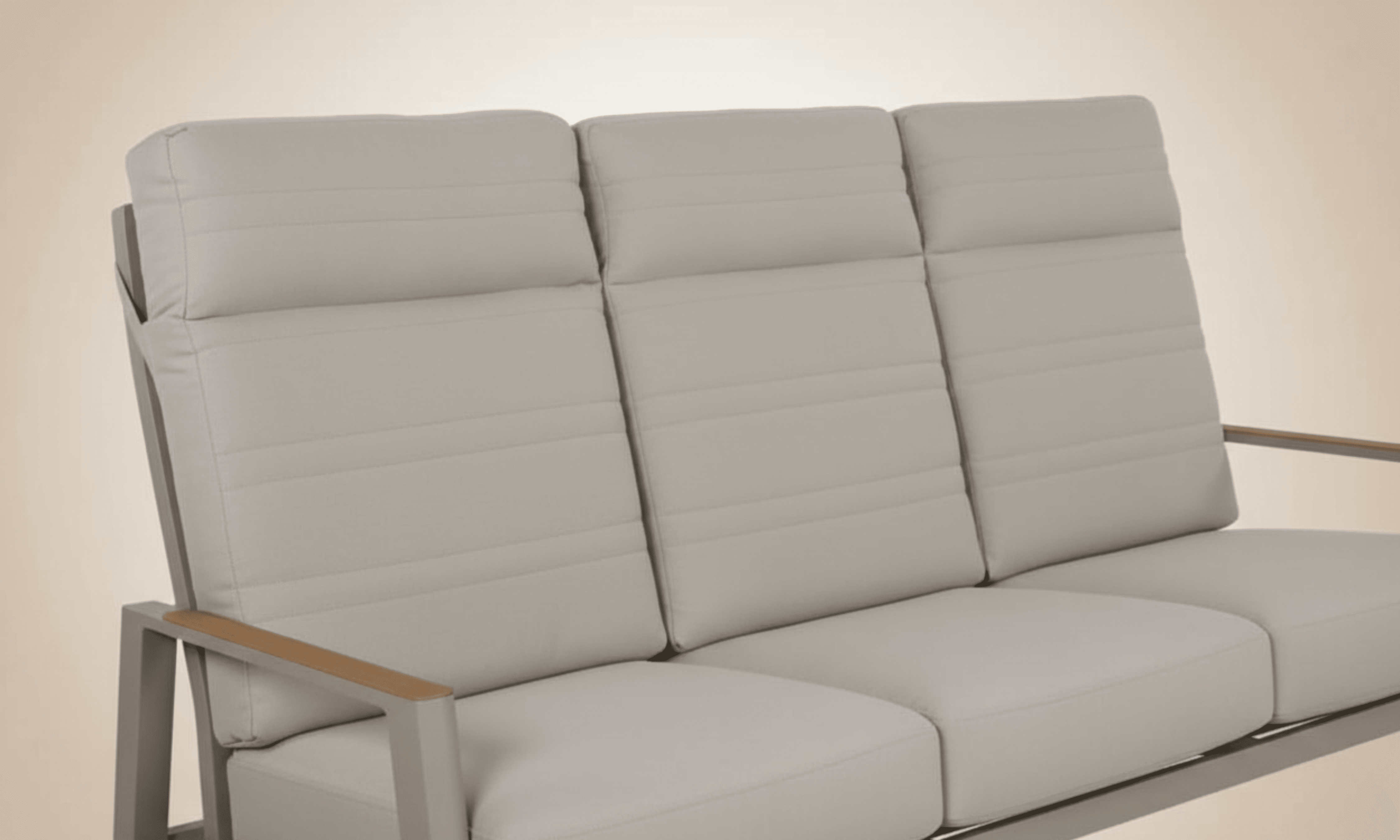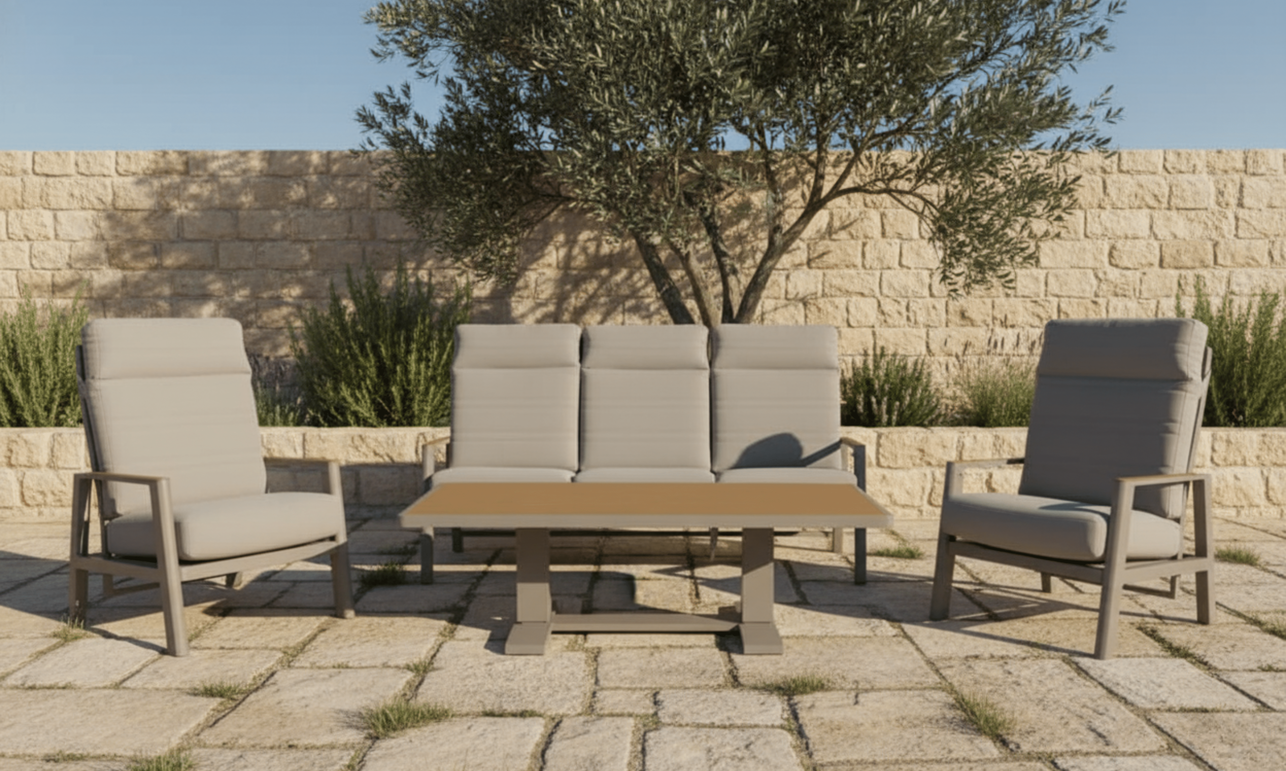 שלדת הכיסאות, הספה והשולחן עשויים אלומיניום שצבוע בתנור בשיטה מתקדמת במיוחד בשם Powder Coating בשלוש שכבות (כולל שכבת ANTISCRACH למניעת שריטות). מה שמבטיח תחזוקה קלה, ניקיון פשוט ועמידות גבוהה לתנאי חוץ לאורך שנים בכל תנאי מזג האוויר וימות השנה!