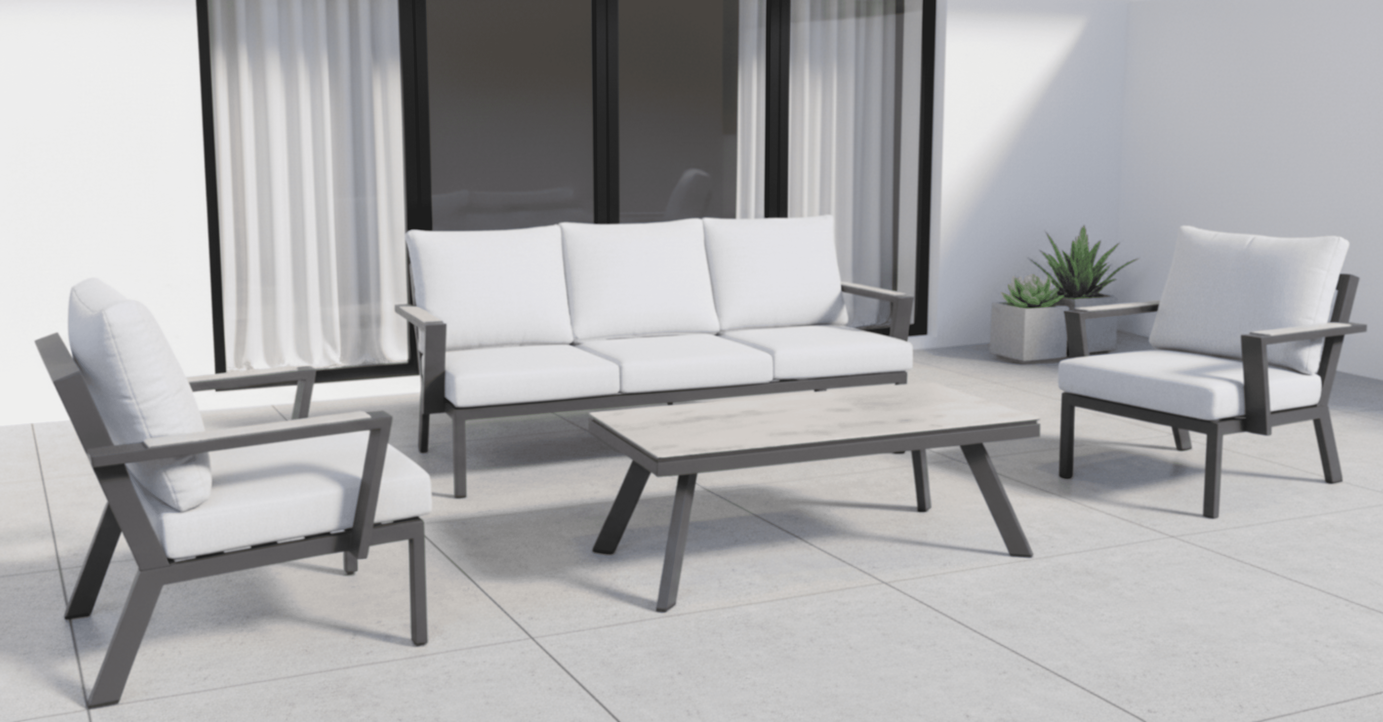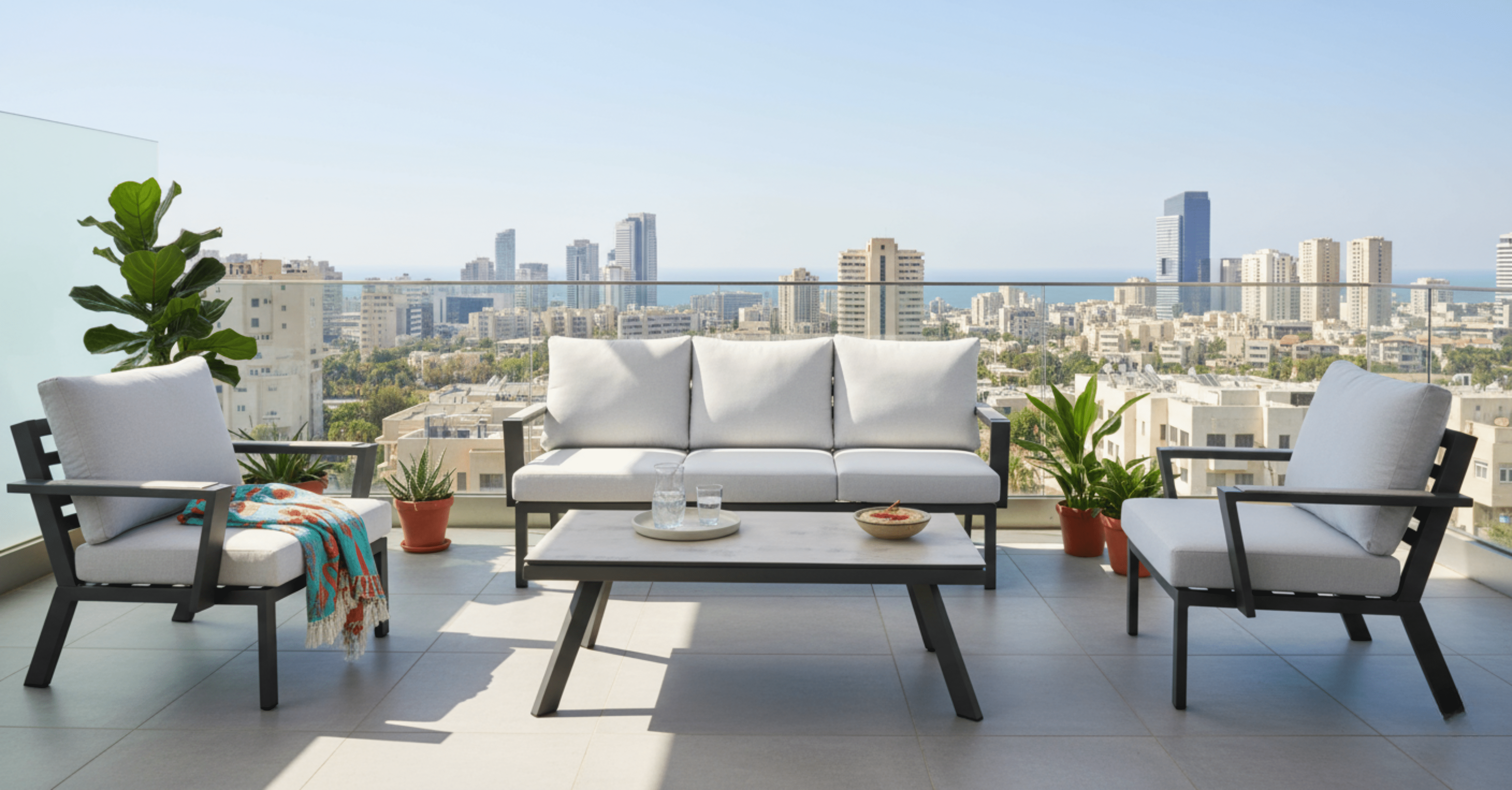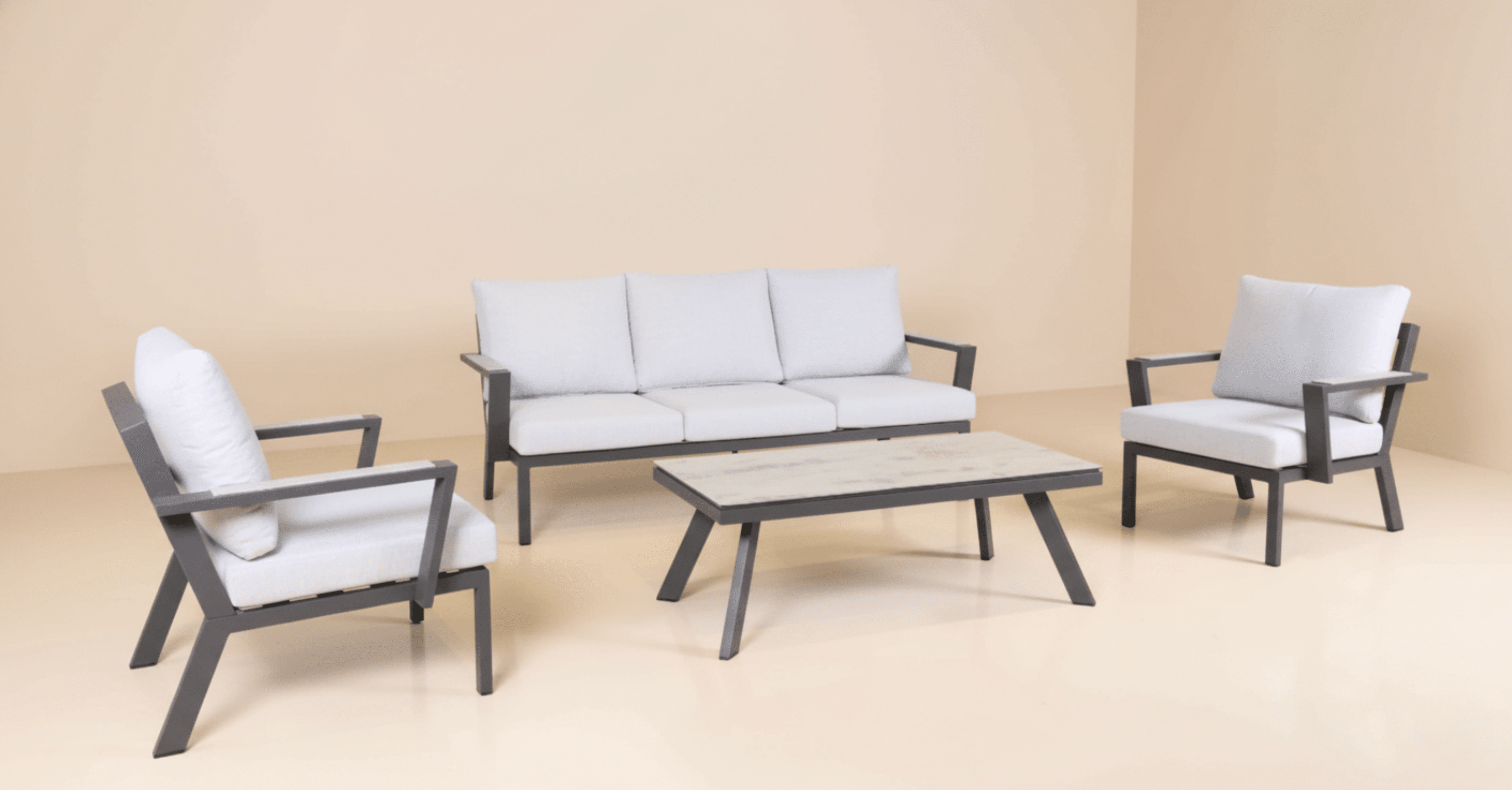 פינת ישיבה תלת-מושבית מפנקת בעיצוב מודרני ומיוחד, מתאימה לגינה ולמרפסת.