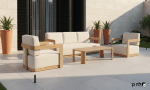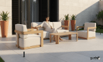 מערכת ישיבה מאלומיניום ודמוי עץ בעיצוב מודרני ואלגנטי, בעלת חמישה מושבים ושולחן קפה.