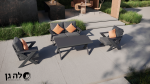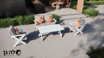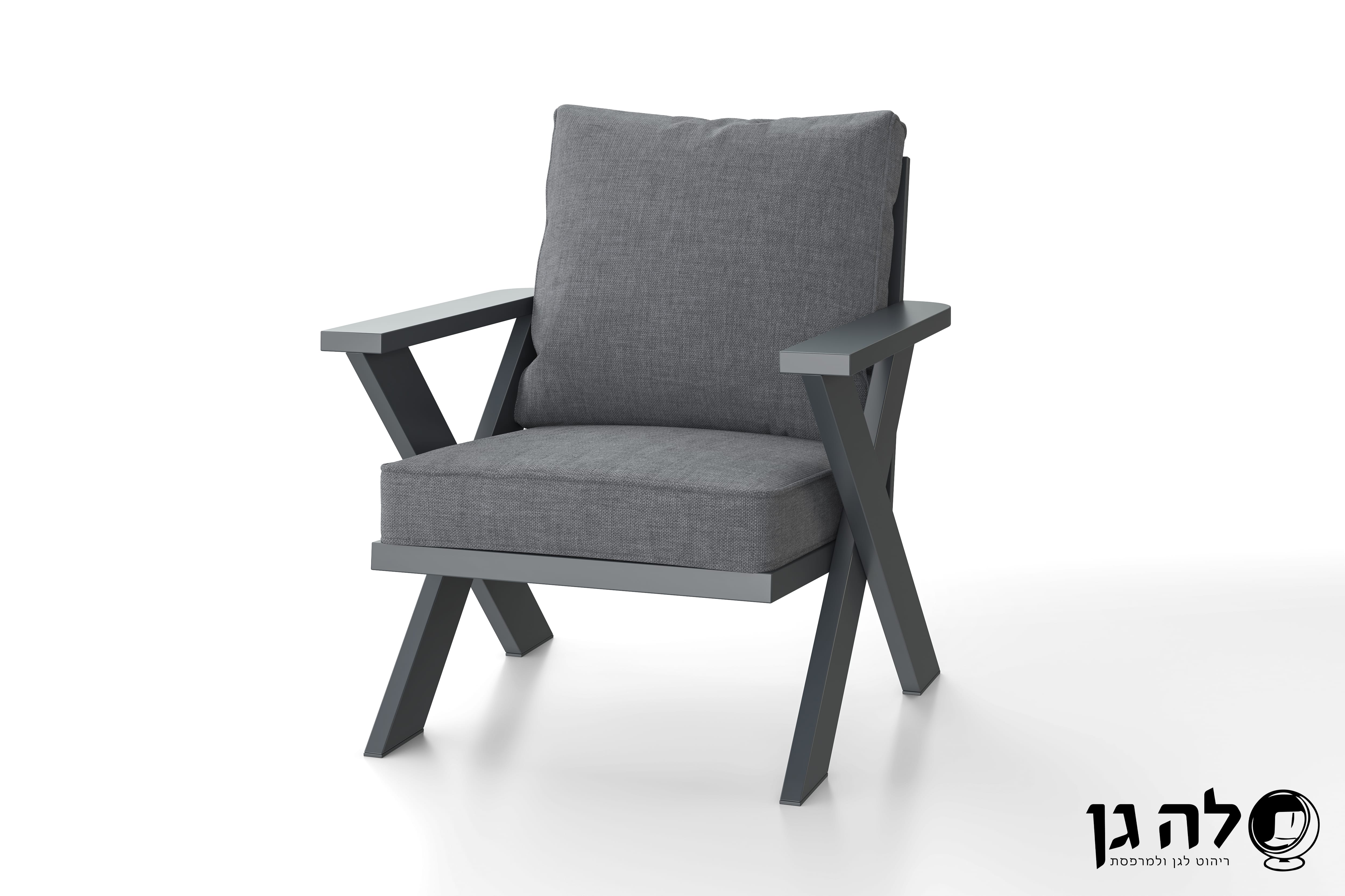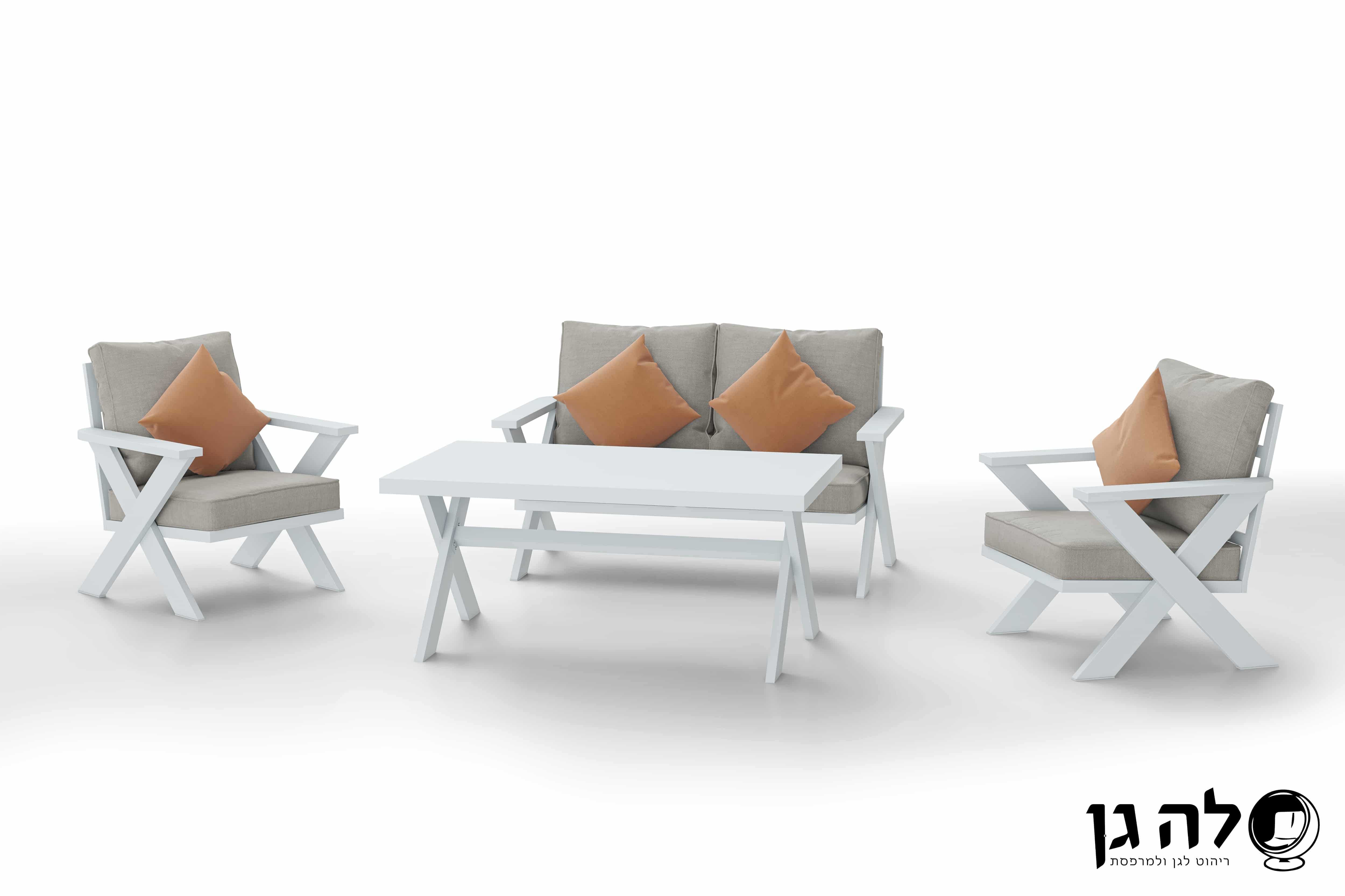 מערכת ישיבה מאלומיניום כוללת ספה דו מושבית, 2 כורסאות יחיד ושולחן גבוה לגינה. בעלת עיצוב מיוחד.