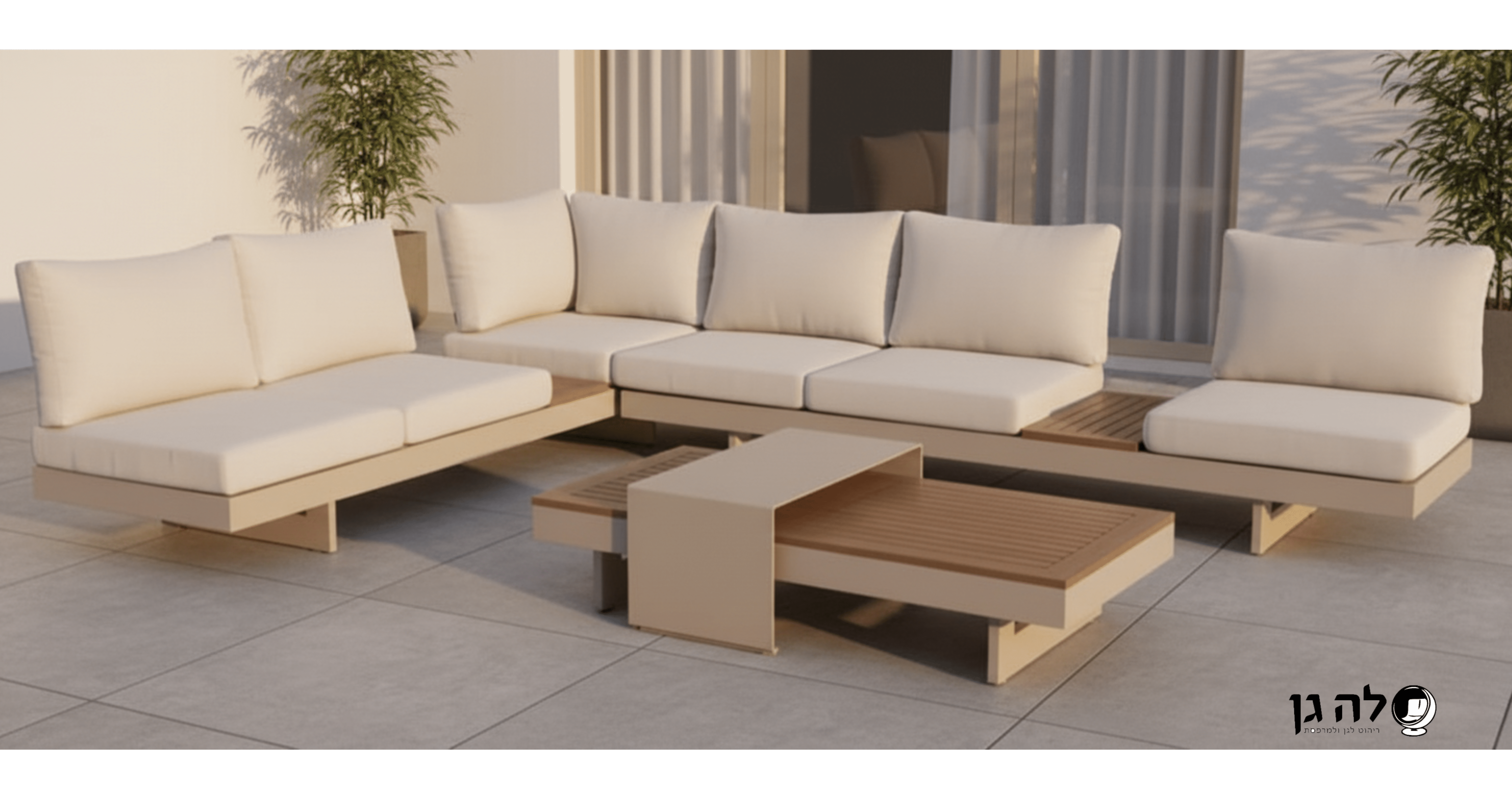 הכריות עשויות בד נעים למגע ועמיד בפני שמש ולחות, וכוללות רוכסן בגב המאפשר שליפה וכביסה קלה. שולחן הקפה הכלול עשוי אף הוא מאלומיניום, בגימור תואם, ומשלים את המראה המודרני והאחיד של הסט.